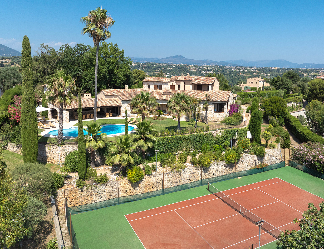The beautiful luxurious property is located in the hills above Nice and Cannes, less than 10 km from the sea. From the house you have a view of the Mediterranean on one side and the Alps on the other. The property is ideal for large families or friends traveling together. It consists of a main house with 6 bedrooms and 6 bathrooms (also two powder rooms/WCs if you want to add) as well as a cottage with two bedrooms and two ensuite bathrooms, accommodating 20 people together in four large suites/apartments and four double rooms. The 7,500 m² property offers numerous amenities, including a great large pool (we no longer heat the pool seasonally heated on request), private tennis court, a bowling alley (we have a pétanque court, no bowling alley) and a covered terrace with a very chic outdoor bar with fireplace and BBQ, a place you’ll love! The property also has many fruit trees including lemon, lime and a large fig tree.