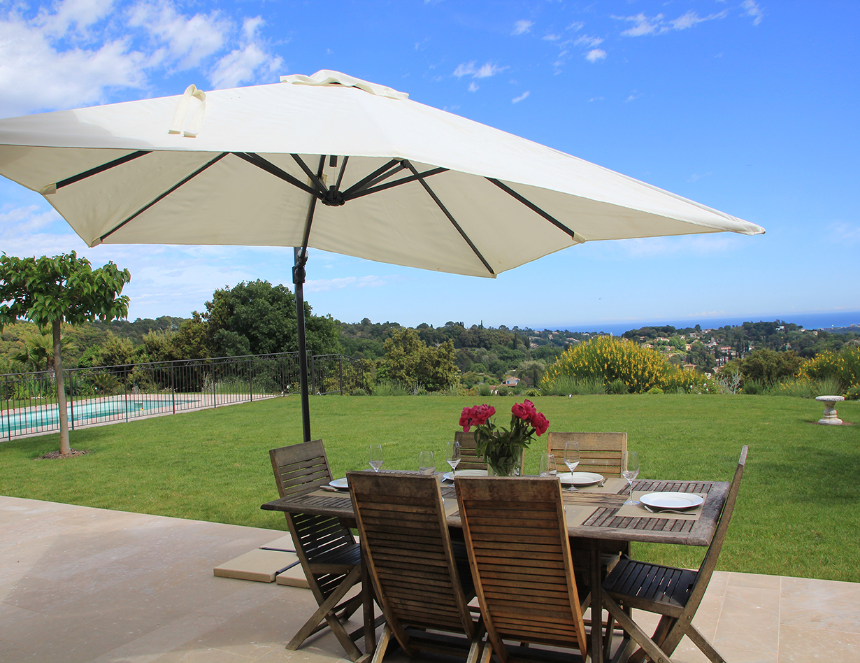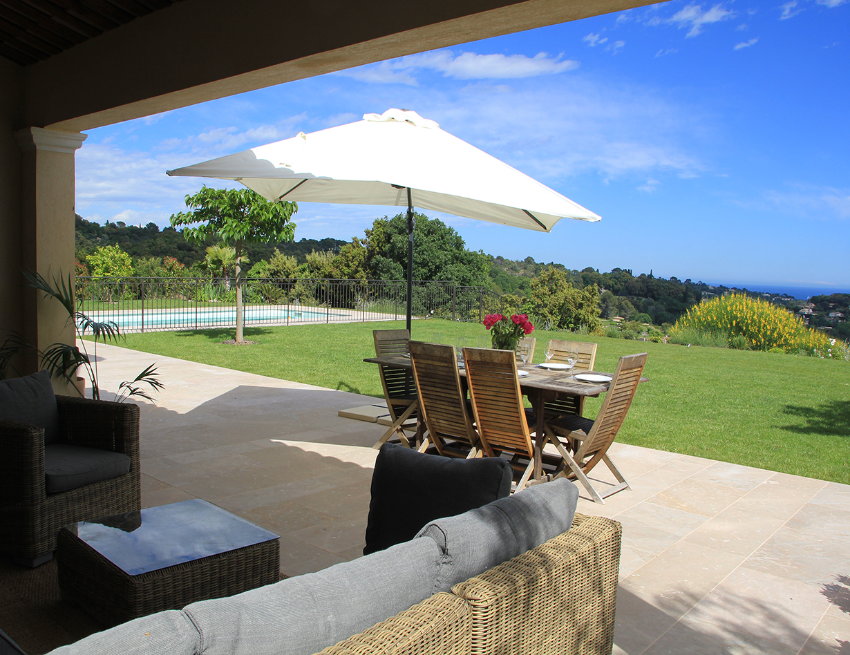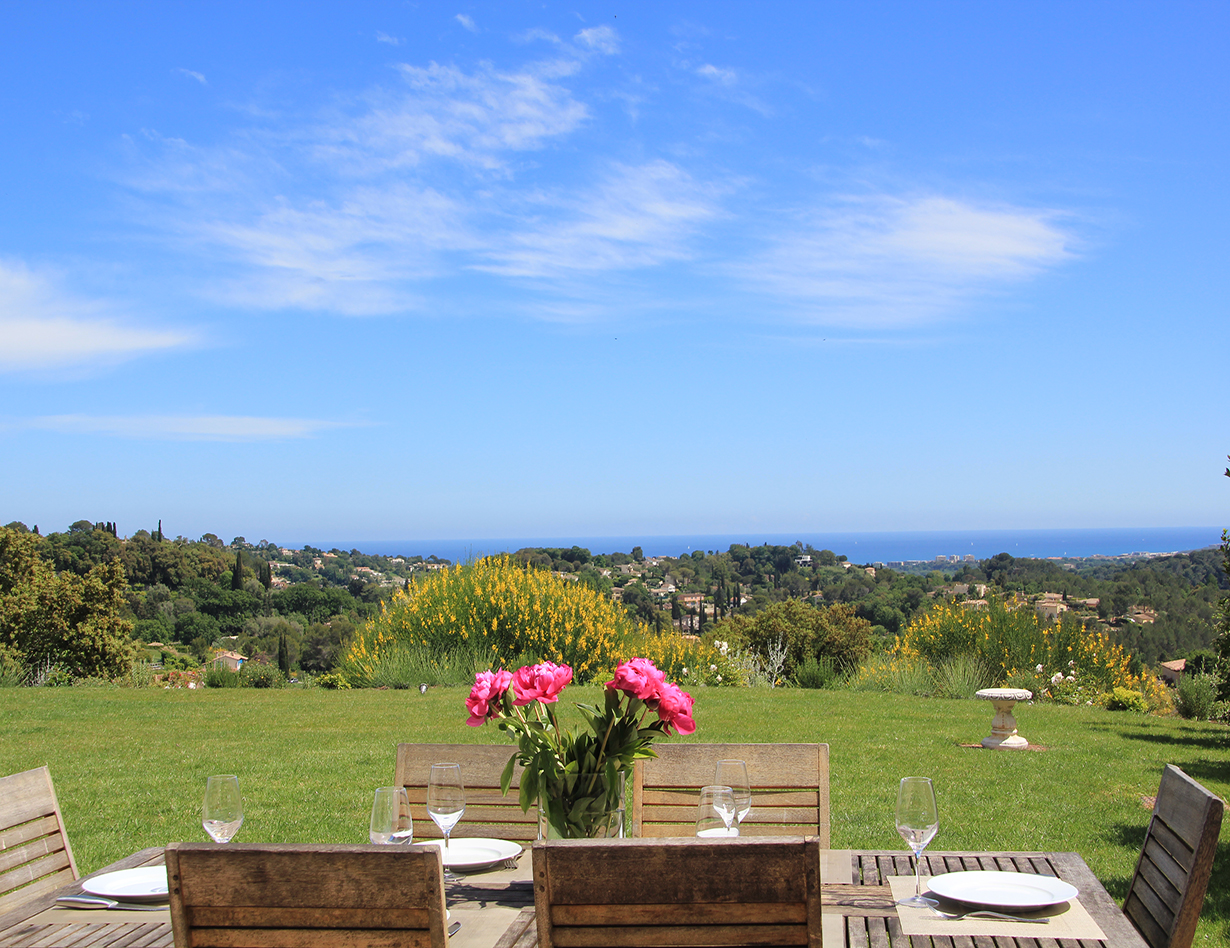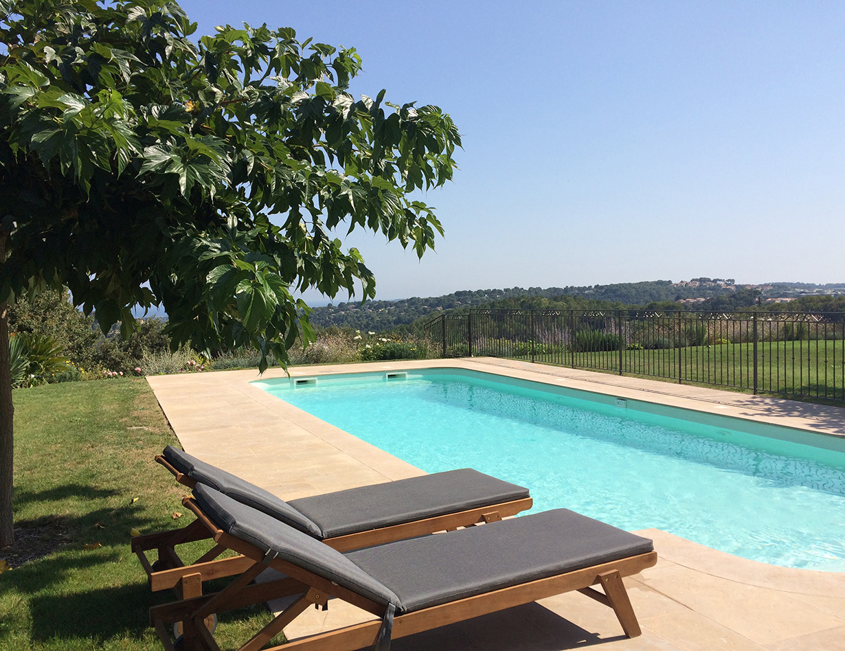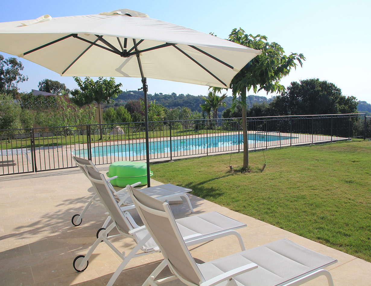 PURE RELAXATION: VILLA «ST. JULIEN» IN BIOT/ANTIBES Are you looking for a spacious holiday apartment or beautiful villa in the Alpes Maritimes department where up to eight people can spend a relaxing holiday and completely switch off? Then our villa «ST. JULIEN» near Biot is exactly the right place for you! With around 180 square meters of living space in a quiet location, the Provencal bastide offers enough space for a successful relaxing holiday with friends or family on the Côte d’Azur – the ideal villa for everyone who is really looking for peace and quiet. It is around ten minutes from the artist town of Biot, which is best known for its glass art, and only 15-20 minutes from Antibes. You can start wonderful hikes or bike tours in breathtaking landscapes directly from the holiday home. Relax and unwind with a sea view – in our villa near Biot The villa on a flat plot with plenty of space to relax and play has four spacious, stylishly furnished bedrooms, three bathrooms and four separate toilets. The large living and dining area with a well-equipped kitchen leads to the partially covered terrace in the beautiful garden. Here, comfortable, high-quality lounge furniture and a large dining table invite you to linger and relax – there is also a BBQ. Enjoy your meals with a fantastic view of the sea! Speaking of the sea: Biot is only four kilometers from the coast, and you can quickly reach the beach by car. If you would rather swim in the pool instead of in the sea, that is of course also possible: the villa has a fantastic pool with comfortable loungers and large shady parasols. Please send us your non-binding inquiry directly or let us advise you personally.