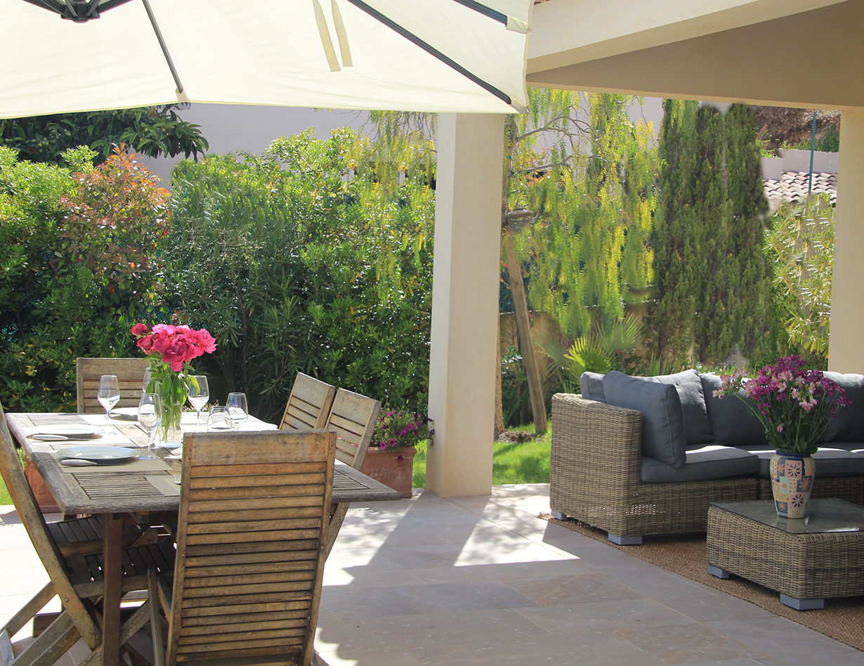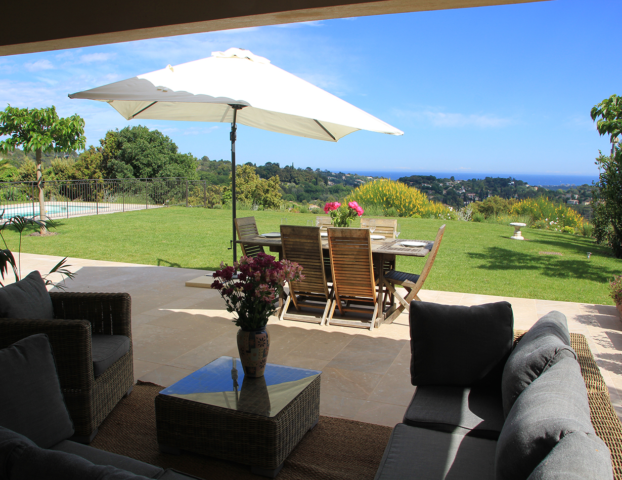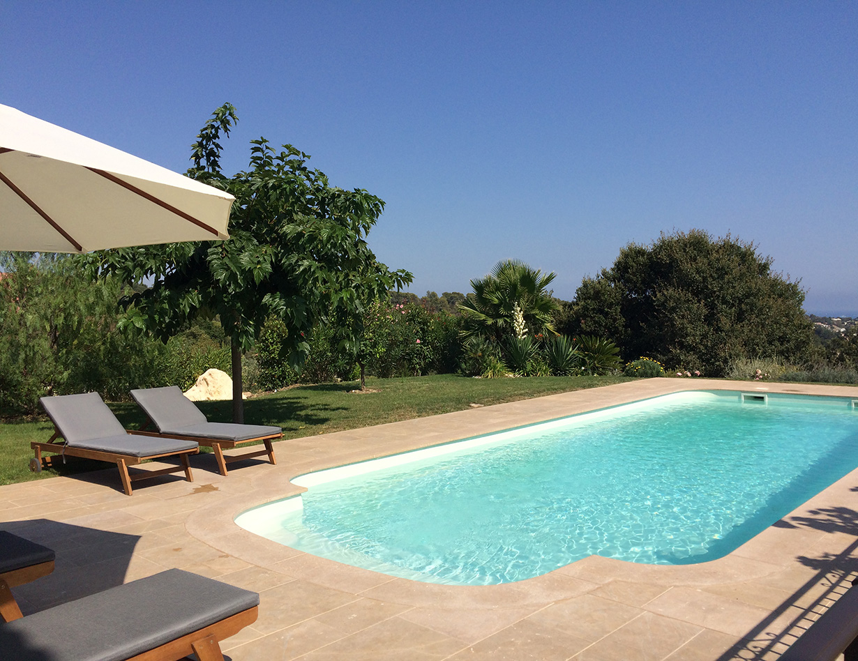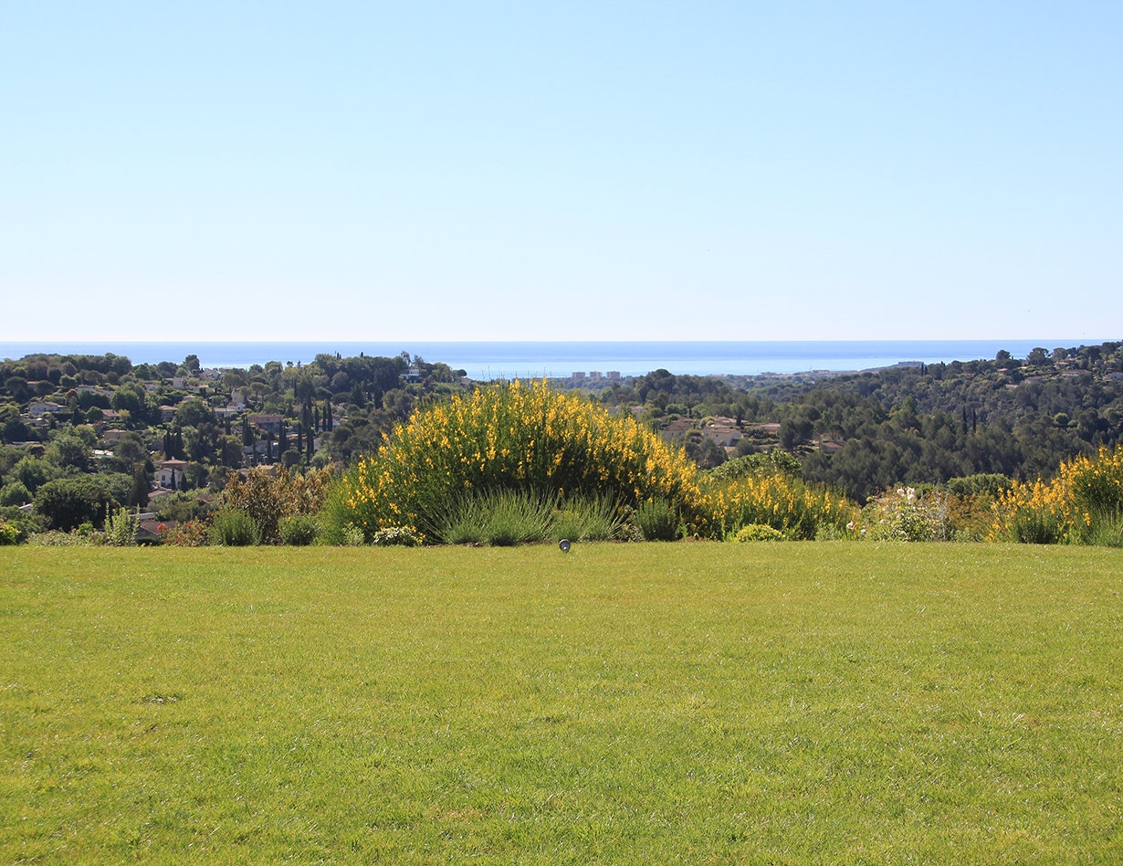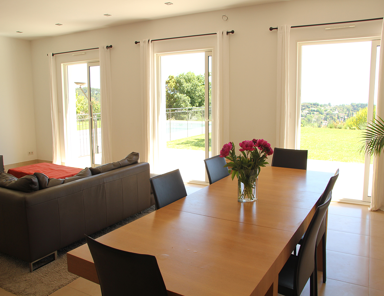 PURE RELAXATION: VILLA «ST. JULIEN» IN BIOT/ANTIBES Are you looking for a spacious holiday apartment or beautiful villa in the Alpes Maritimes department where up to eight people can spend a relaxing holiday and completely switch off? Then our villa «ST. JULIEN» near Biot is exactly the right place for you! With around 180 square meters of living space in a quiet location, the Provencal bastide offers enough space for a successful relaxing holiday with friends or family on the Côte d’Azur – the ideal villa for everyone who is really looking for peace and quiet. It is around ten minutes from the artist town of Biot, which is best known for its glass art, and only 15-20 minutes from Antibes. You can start wonderful hikes or bike tours in breathtaking landscapes directly from the holiday home. Relax and unwind with a sea view – in our villa near Biot The villa on a flat plot with plenty of space to relax and play has four spacious, stylishly furnished bedrooms, three bathrooms and four separate toilets. The large living and dining area with a well-equipped kitchen leads to the partially covered terrace in the beautiful garden. Here, comfortable, high-quality lounge furniture and a large dining table invite you to linger and relax – there is also a BBQ. Enjoy your meals with a fantastic view of the sea! Speaking of the sea: Biot is only four kilometers from the coast, and you can quickly reach the beach by car. If you would rather swim in the pool instead of in the sea, that is of course also possible: the villa has a fantastic pool with comfortable loungers and large shady parasols. Please send us your non-binding inquiry directly or let us advise you personally.