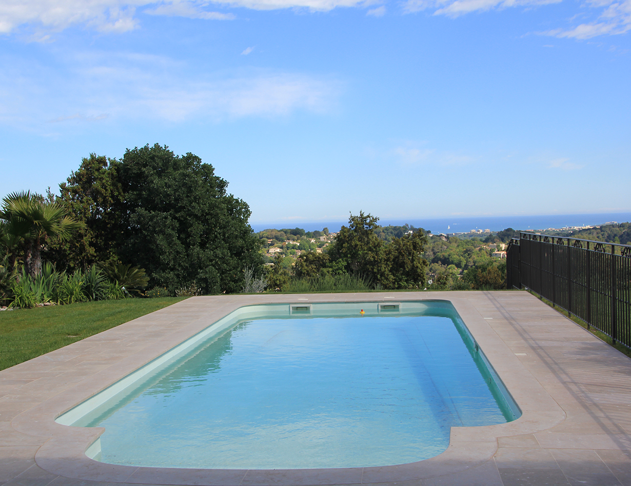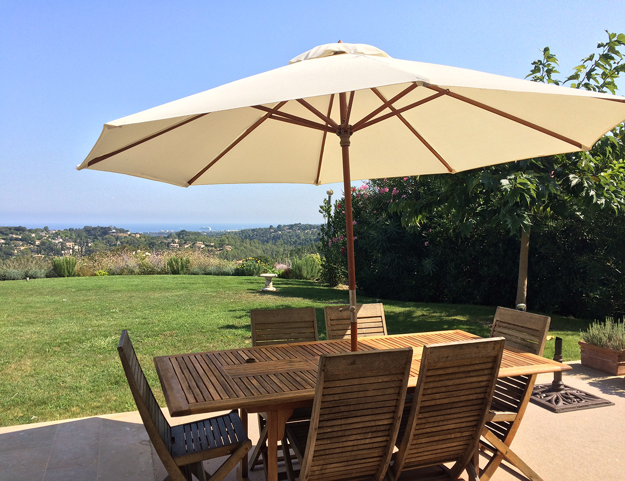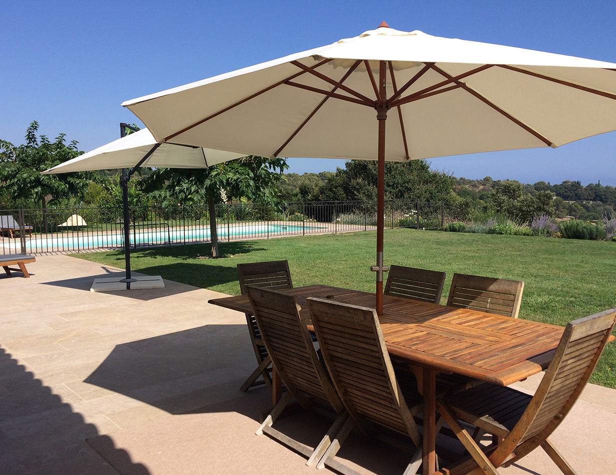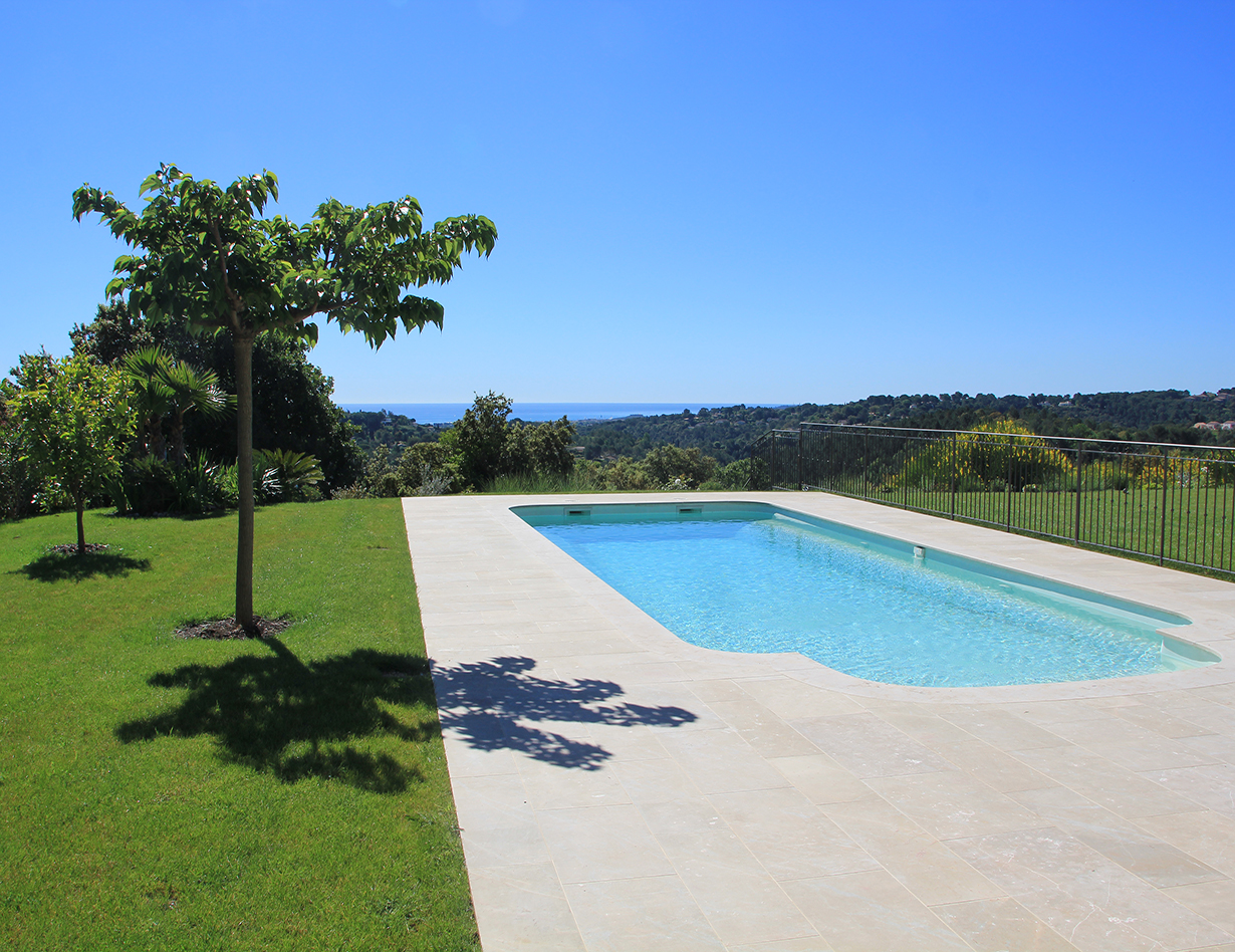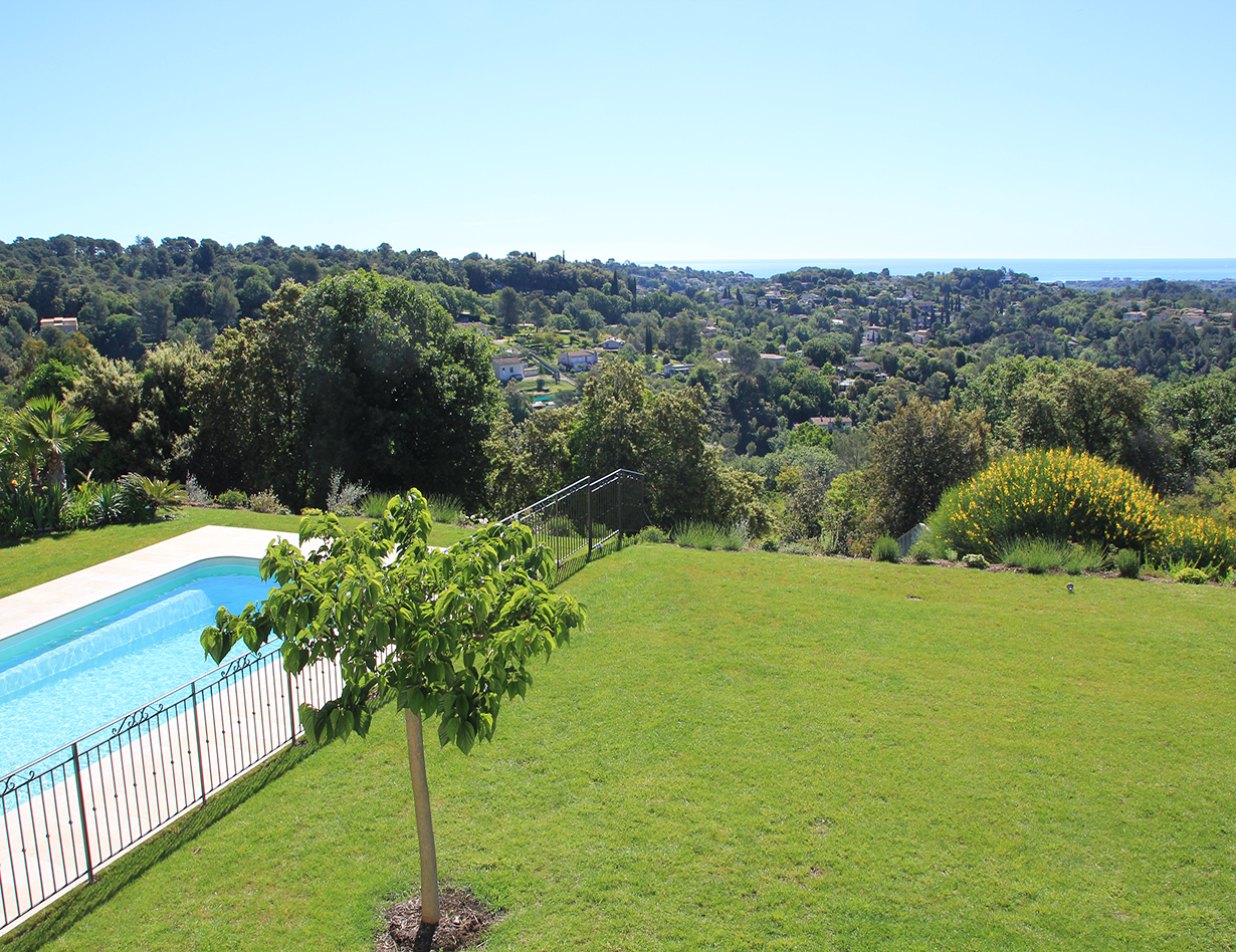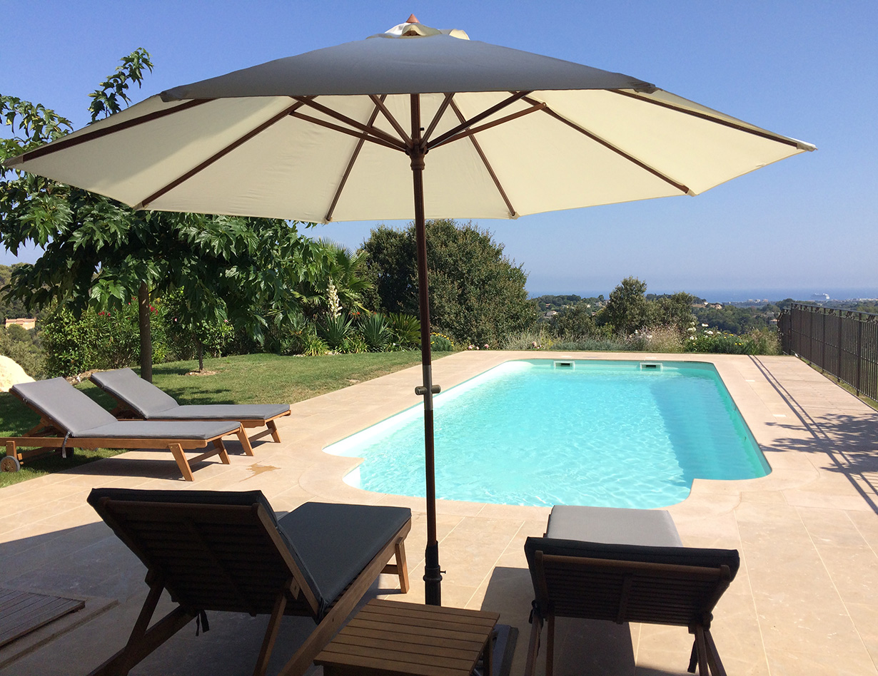 PURE RELAXATION: VILLA «ST. JULIEN» IN BIOT/ANTIBES Are you looking for a spacious holiday apartment or beautiful villa in the Alpes Maritimes department where up to eight people can spend a relaxing holiday and completely switch off? Then our villa «ST. JULIEN» near Biot is exactly the right place for you! With around 180 square meters of living space in a quiet location, the Provencal bastide offers enough space for a successful relaxing holiday with friends or family on the Côte d’Azur – the ideal villa for everyone who is really looking for peace and quiet. It is around ten minutes from the artist town of Biot, which is best known for its glass art, and only 15-20 minutes from Antibes. You can start wonderful hikes or bike tours in breathtaking landscapes directly from the holiday home. Relax and unwind with a sea view – in our villa near Biot The villa on a flat plot with plenty of space to relax and play has four spacious, stylishly furnished bedrooms, three bathrooms and four separate toilets. The large living and dining area with a well-equipped kitchen leads to the partially covered terrace in the beautiful garden. Here, comfortable, high-quality lounge furniture and a large dining table invite you to linger and relax – there is also a BBQ. Enjoy your meals with a fantastic view of the sea! Speaking of the sea: Biot is only four kilometers from the coast, and you can quickly reach the beach by car. If you would rather swim in the pool instead of in the sea, that is of course also possible: the villa has a fantastic pool with comfortable loungers and large shady parasols. Please send us your non-binding inquiry directly or let us advise you personally.