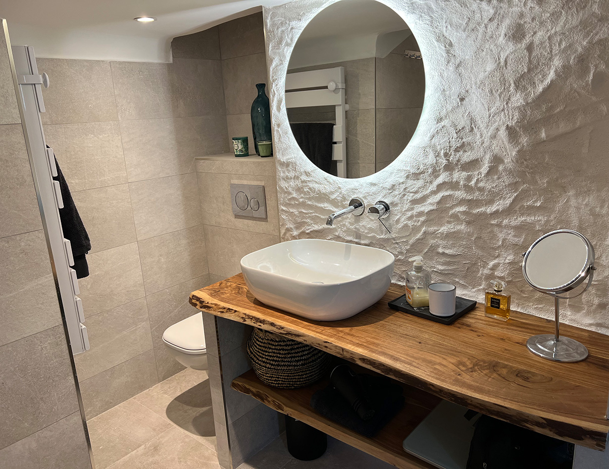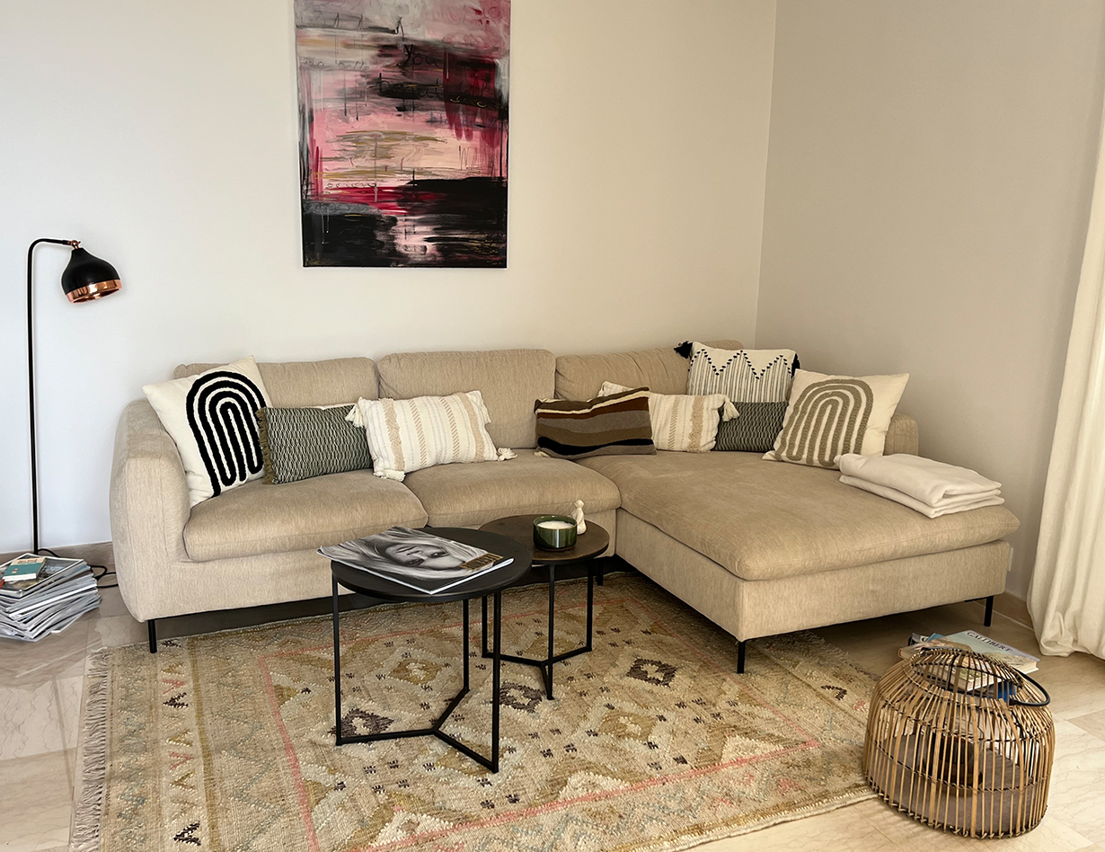 Gemütlicher Wohnbereich mit TV (Samsung Frame), großem Eßtisch innen, Google-box