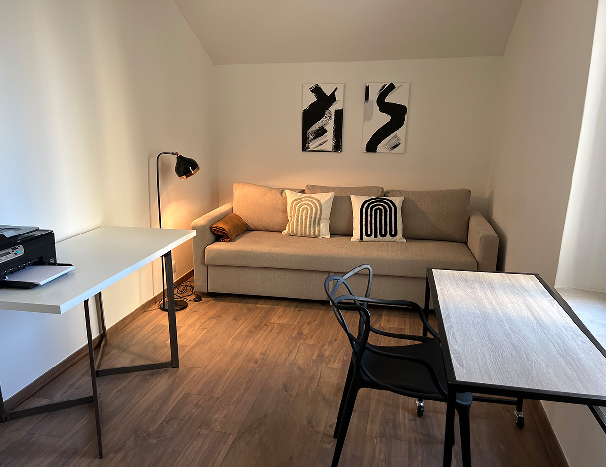 Office: OG, schönes großes Zimmer mit wunderbarem Meerblick. Schlafcouch 140 x 200 (mit komfortabler Topperauflage), Badezimmer, WC, Dusche. Klimaanlage