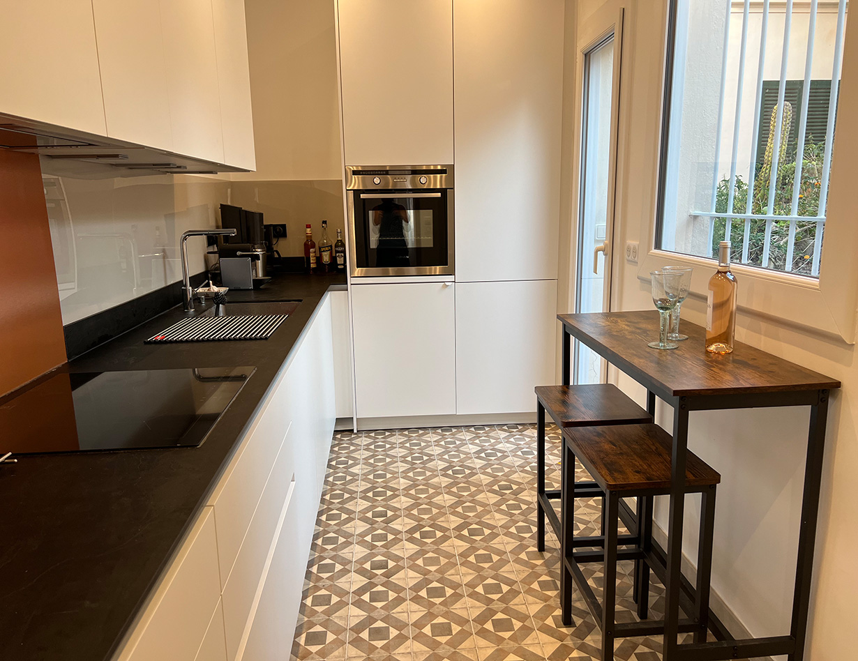 Große voll ausgestattete Küche mit allem, was man braucht. Küchenbar-Theke. Kaffeemaschine Nespresso, Filterkaffeemaschine, Wasserkocher, Toaster