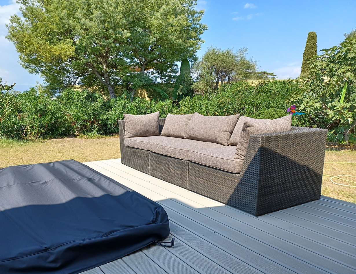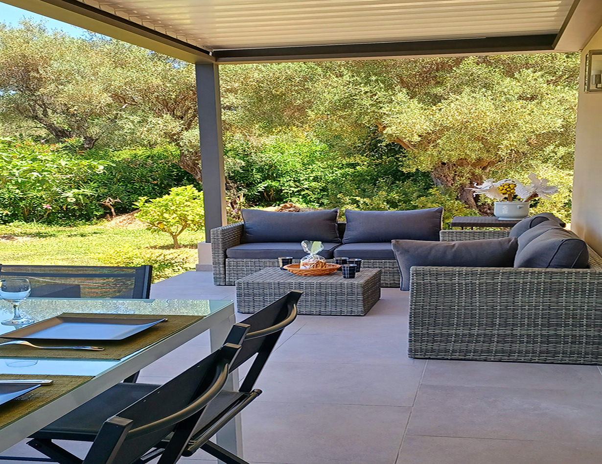 Große Terrasse vor dem Haus mit Eßtisch, Loungemöbel