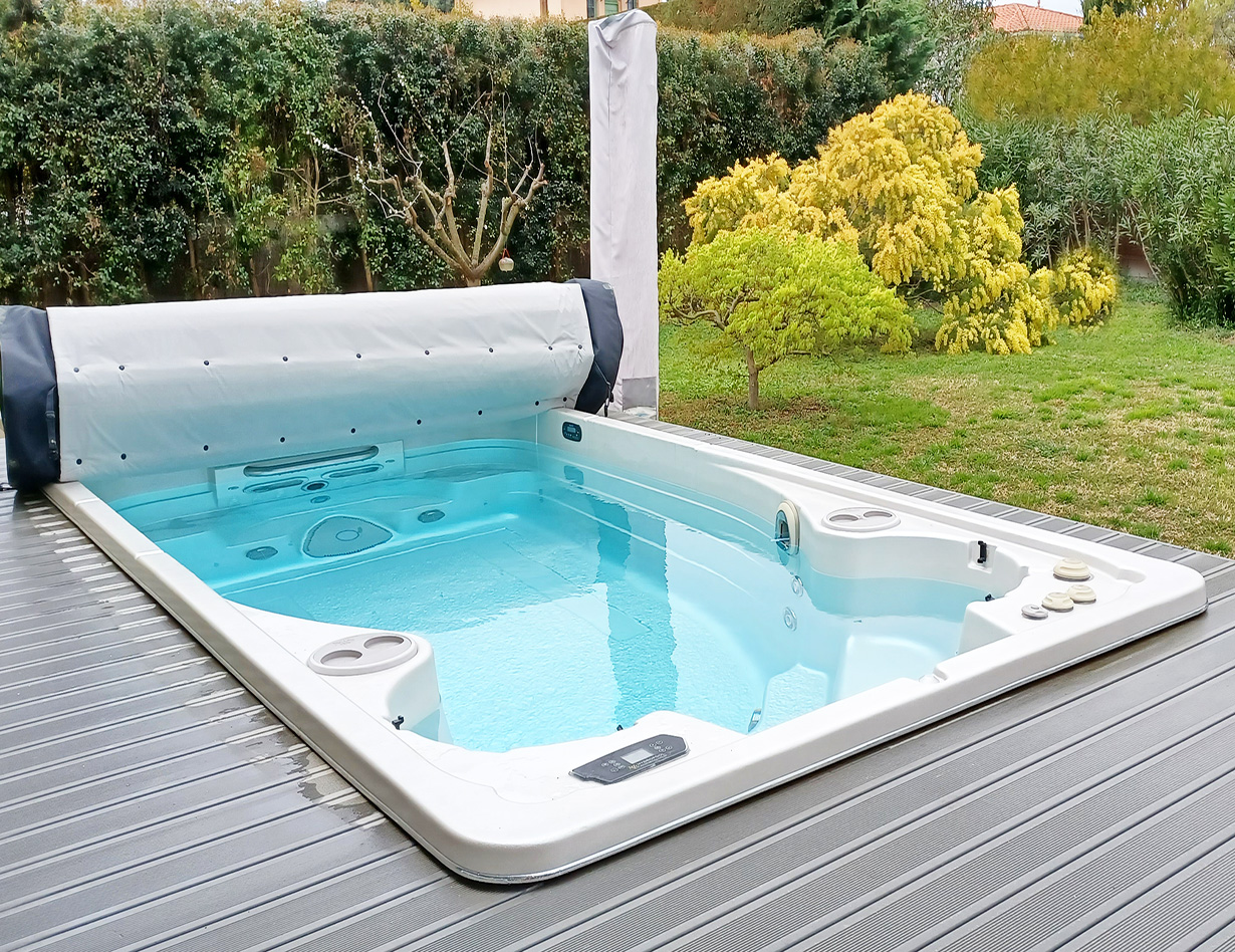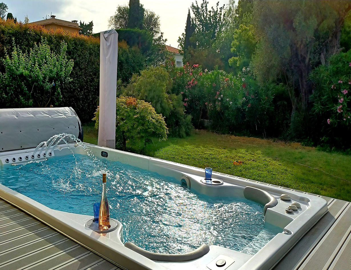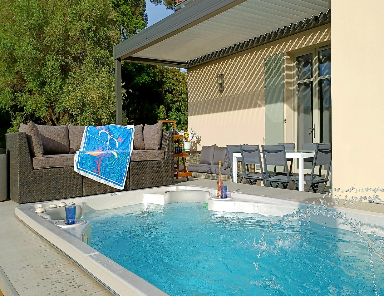 Spa-Pool mit Gegenschwimmanlage (kann individuell eingestellt werden.) Zwei Massageplätze. Beheizbar, Sonnenschirme, Loungemöbel