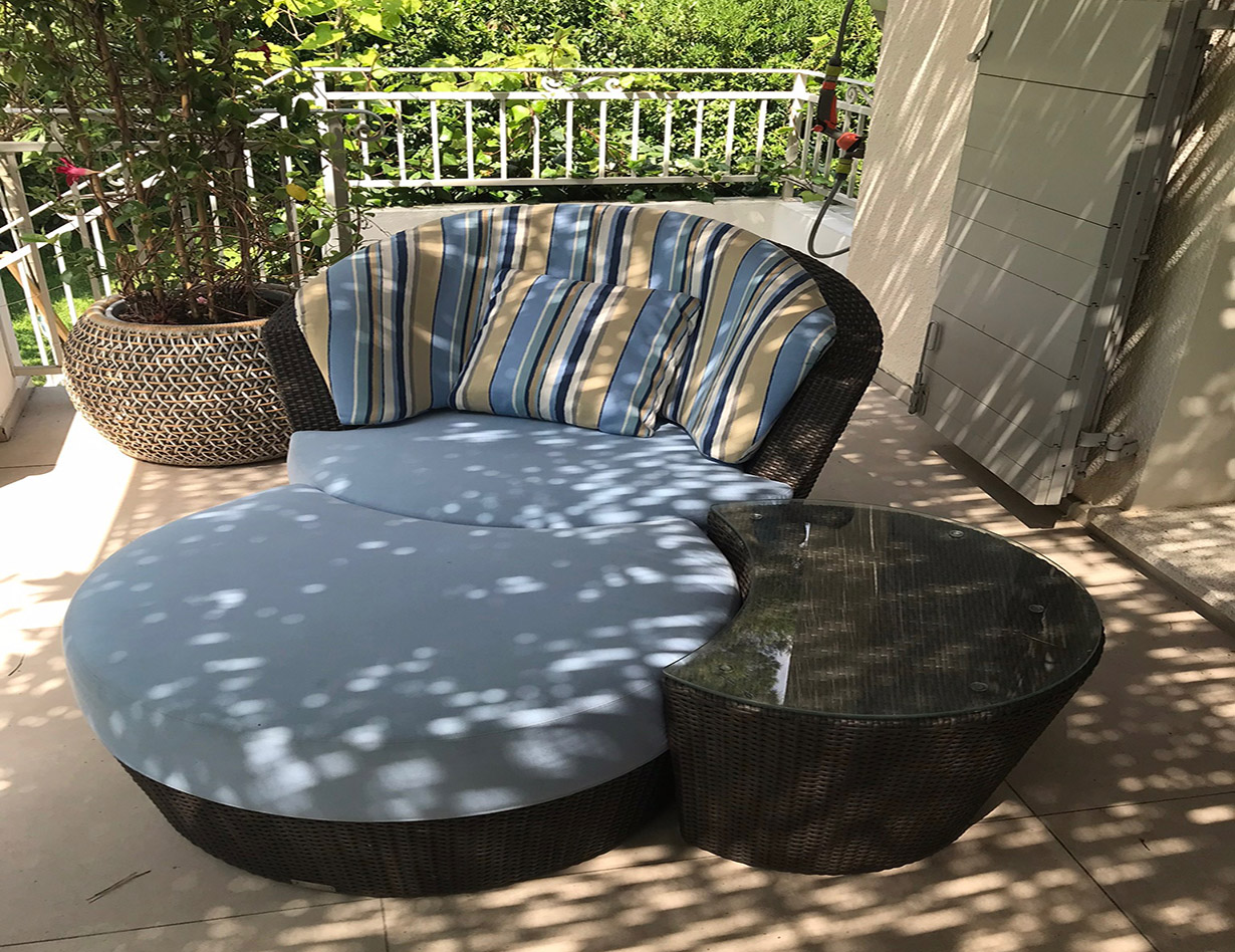 Große Terrasse vor dem Haus mit Eßtisch, Loungemöbel