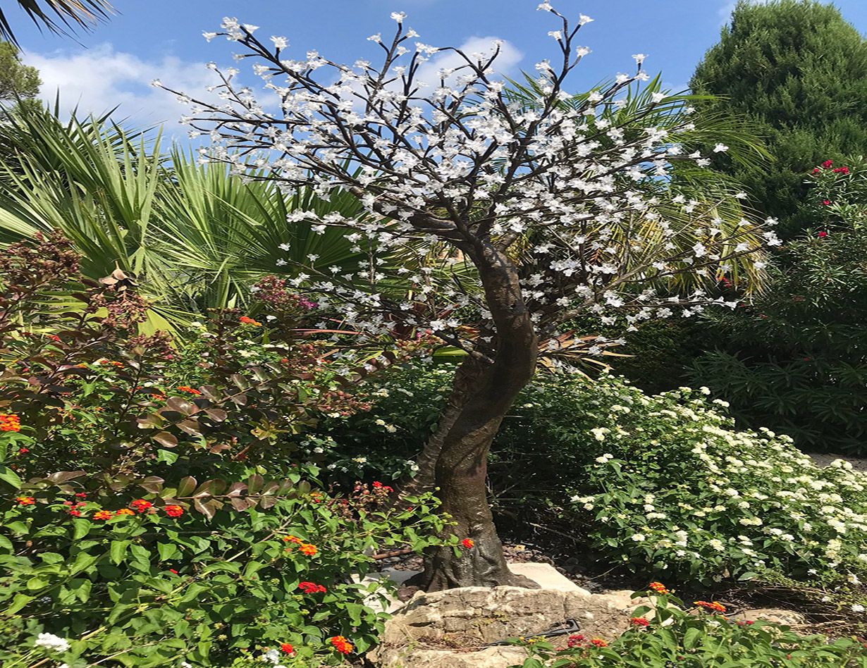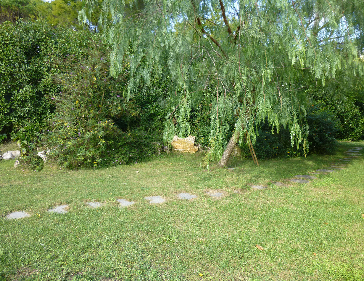 Ca 1.500m2 mit Rasenflächen, vielen Olivenbäumen, Bambus, mediterranen Pflanzen.