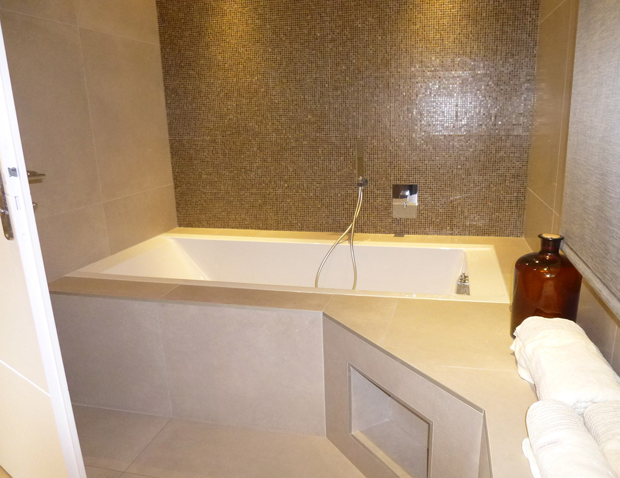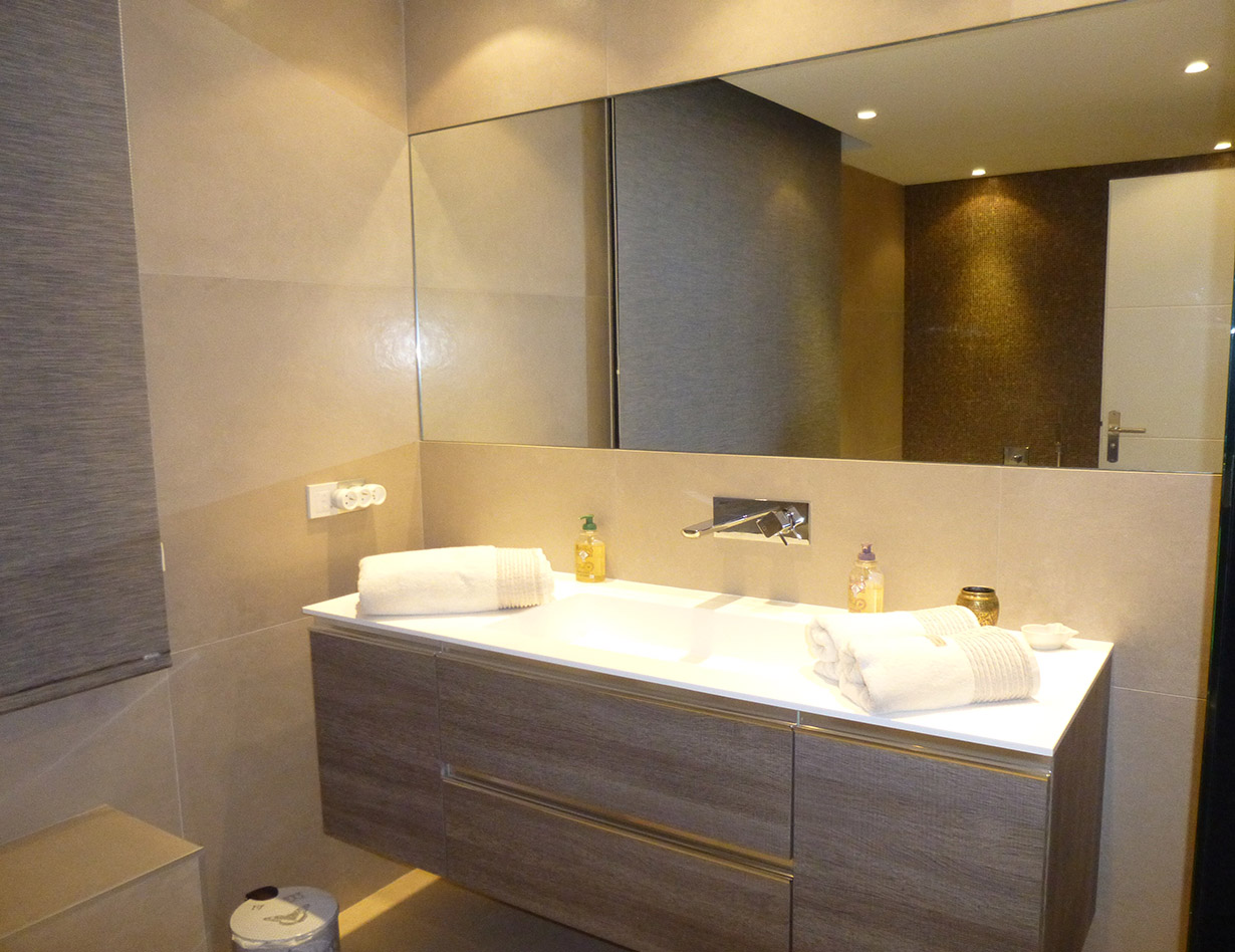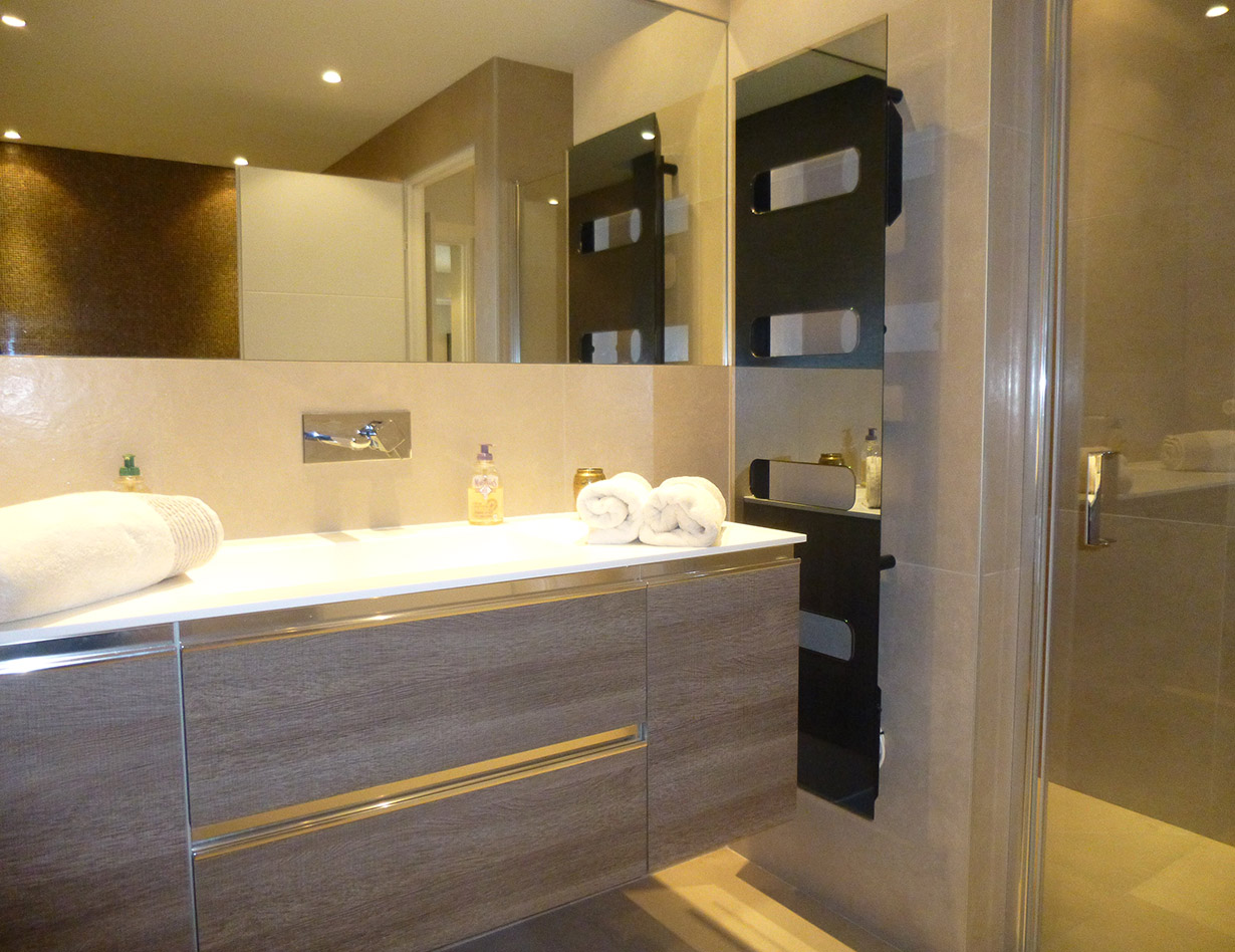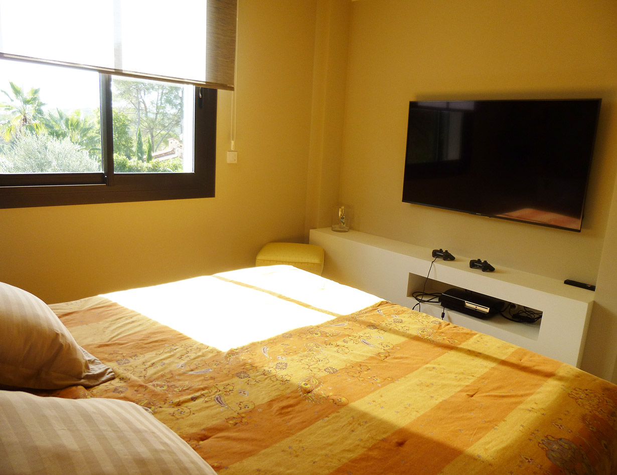 Wohnebene, großes Masterschlafzimmer mit großem Doppelbett, Dressing und ensuite Badezimmer.