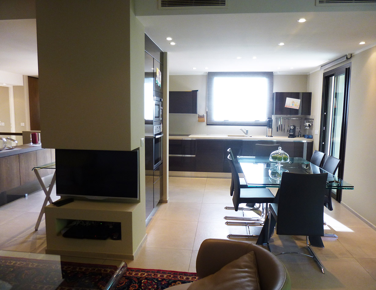 Gepflegter Wohnbereich mit gemütlichen Sofas, hübsch eingerichtet, Eßtisch vor der Küche. TV