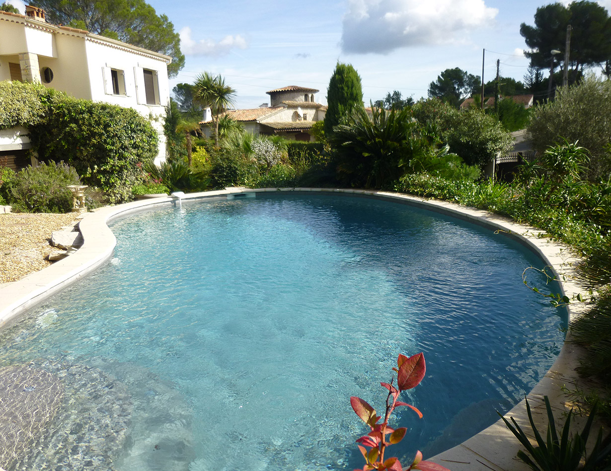 Privater Pool in freier Form, mit komfortablen Sonnenliegen, Sonnenschirme