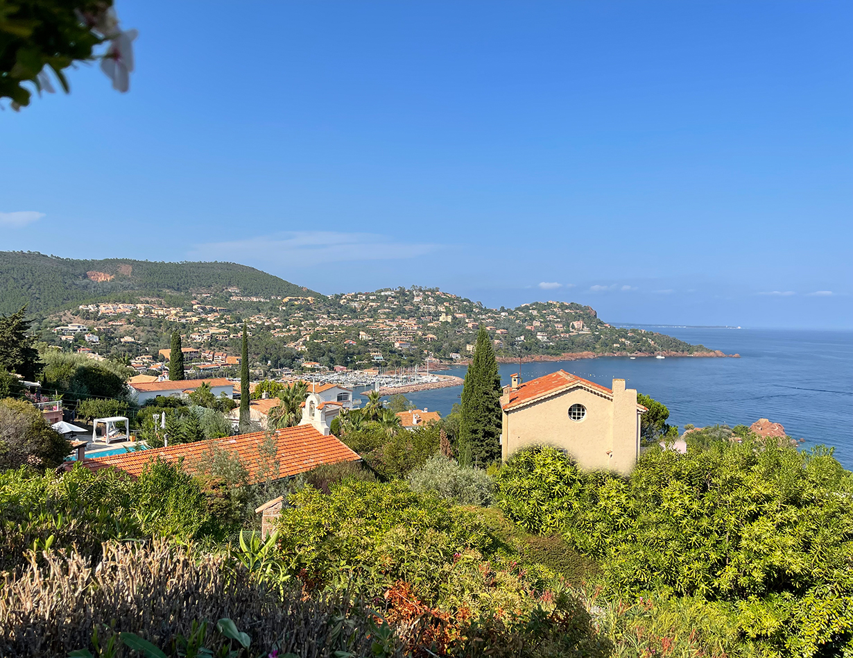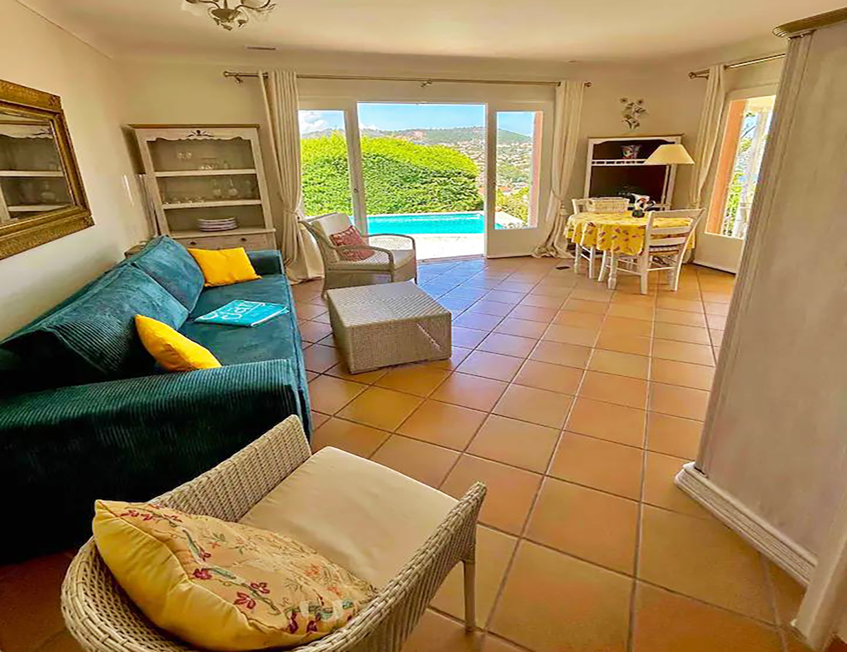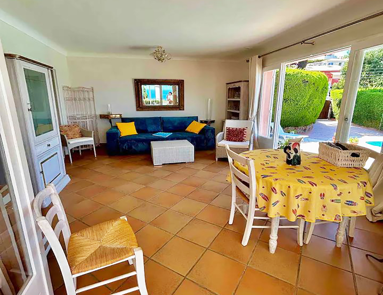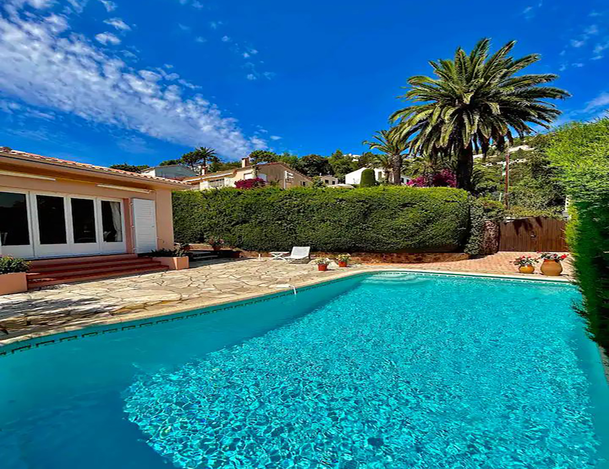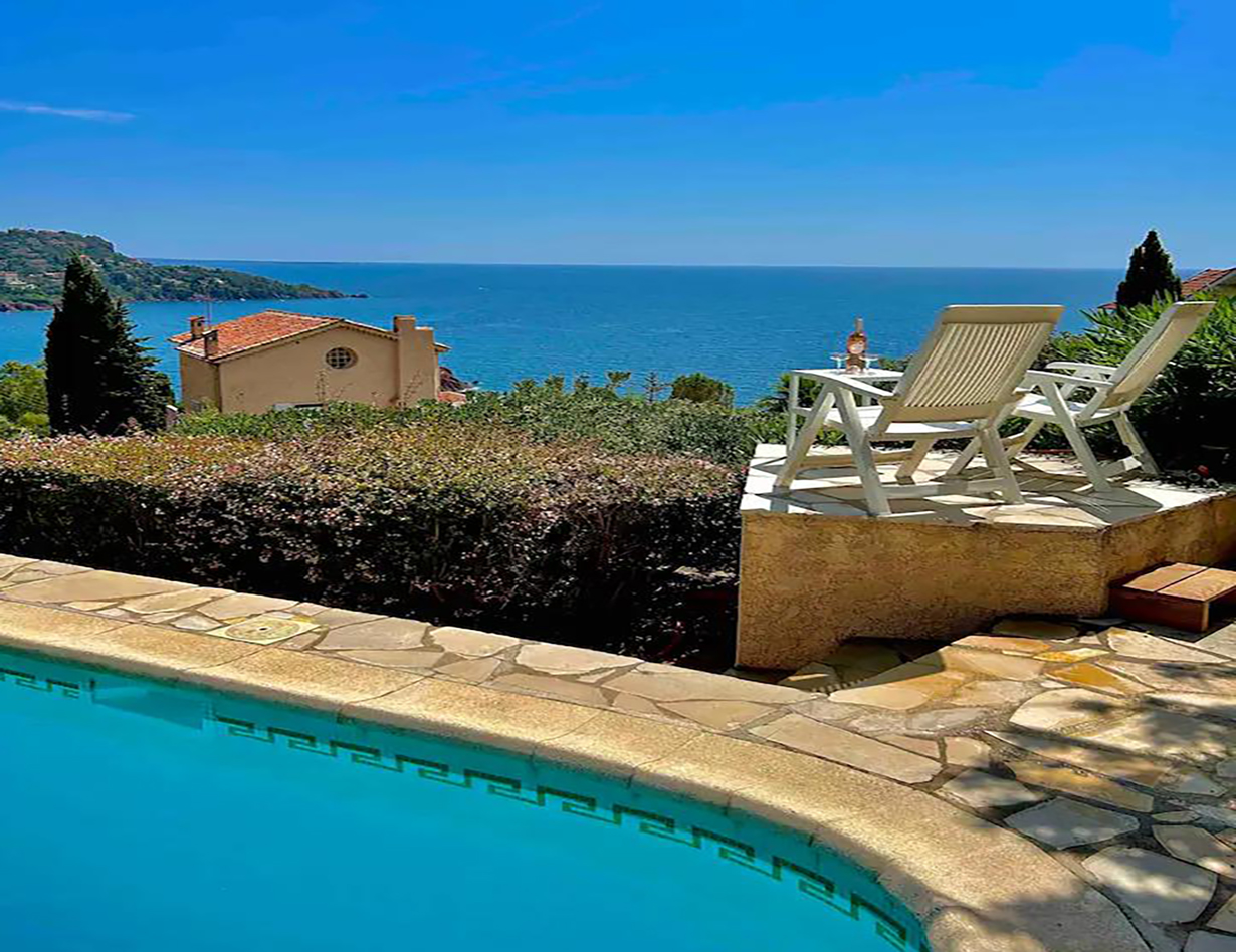 Sehr schönes Ferienhaus auf einer Ebene mit privatem Pool in bester Lage in Le Trayas/Agay, nah zum glamourösen Cannes mit seiner berühmten Croisette, den Filmfestspielen und vm. Das schöne gepflegte Haus liegt nur wenige Gehminuten vom Meer entfernt. Den Supermarkt und zum täglichen Baguette und Croissant holen können Sie in 5 Minuten erreichen. Das nette Haus liegt in einer privaten Domaine in Trayas in ruhiger Lage. Das Haus verfügt über zwei schöne Schlafzimmer mit Doppelbetten und Klimaanlage, 2 Bäder, 2 WCs, eine separate gut ausgestattete Küche und ein Wohn-Eßzimmer mit Meerblick. Eine schöne Terrasse liegt direkt davor mit einem tollen Blick, großem Eßtisch und Loungemöbeln. Am netten Pool lässt es sich den ganzen Tag über aushalten auf komfortablen Sonnenliegen. Oder etwas Boule spielen auf dem Grundstück, was vor dem haus liegt. Das Auto können Sie komfortabel auf dem Grundstück parken oder auch direkt vor dem Haus in der privaten Domaine. Ein sehr angenehmes Haus mit einem wunderschönen Meer-Blick und ein herrlicher Blick auf die Bucht von Cannes.