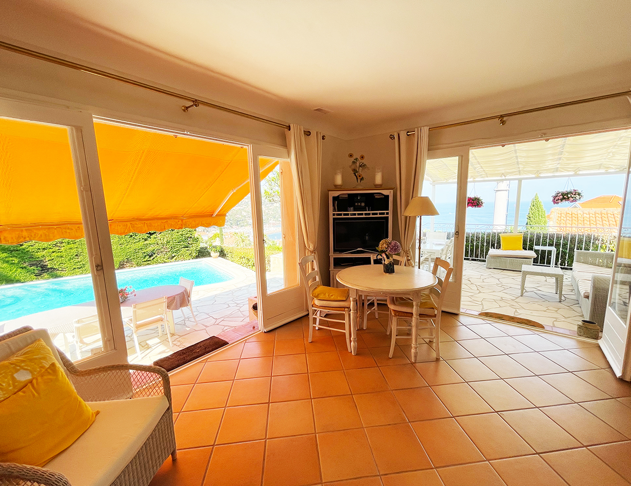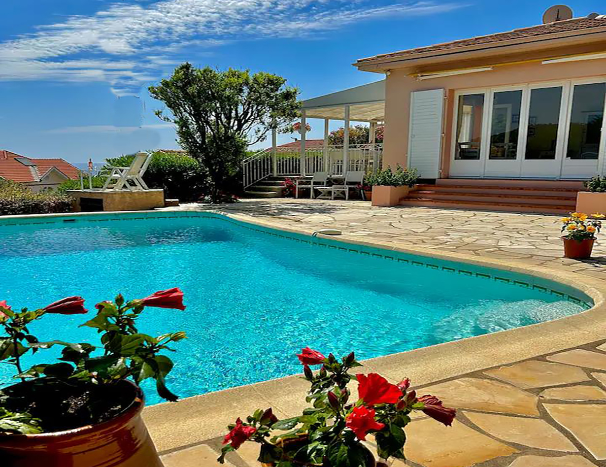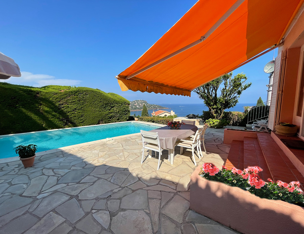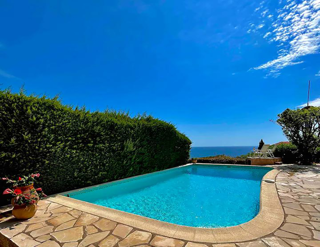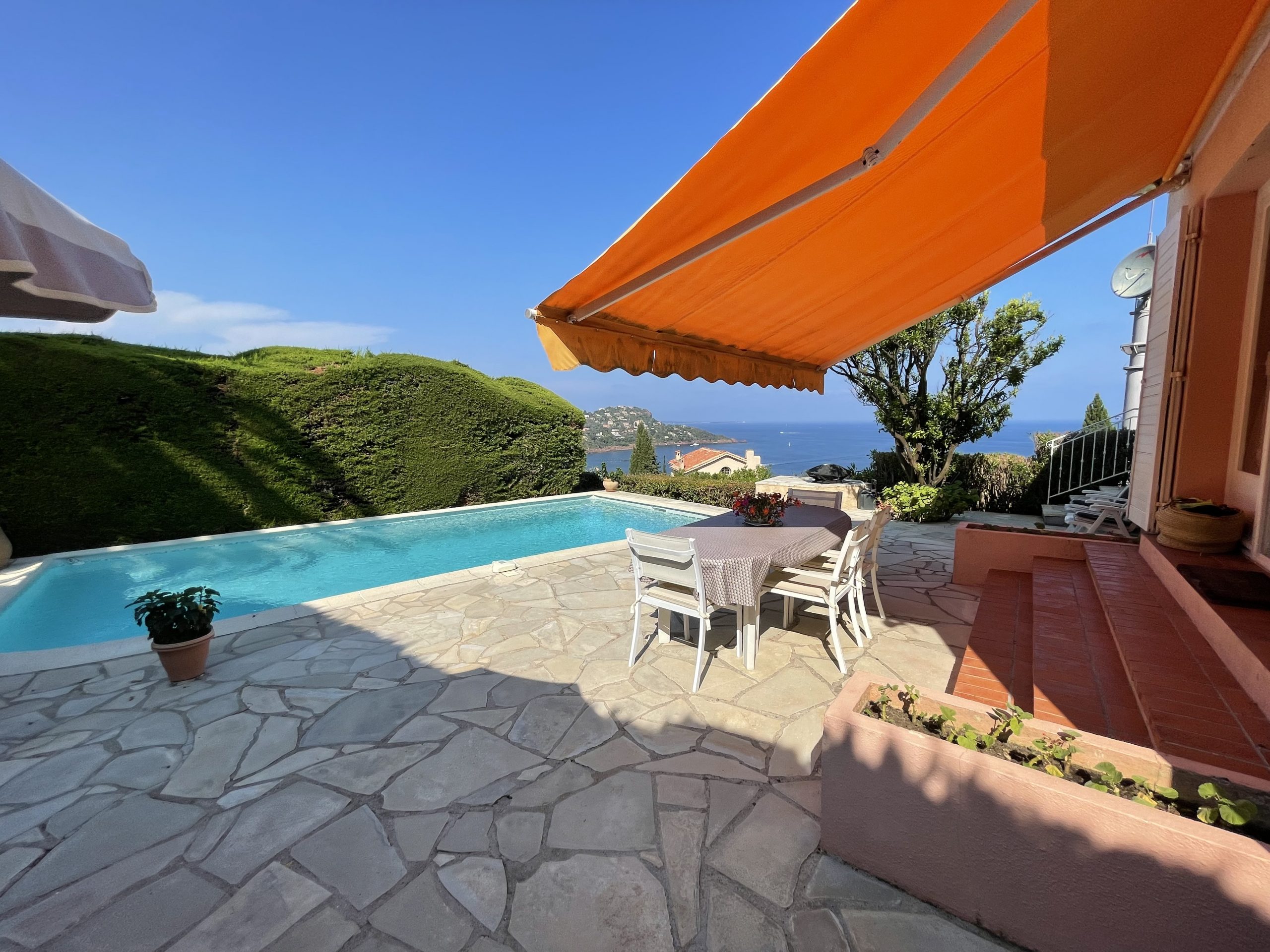 Sehr schönes Ferienhaus auf einer Ebene mit privatem Pool in bester Lage in Le Trayas/Agay, nah zum glamourösen Cannes mit seiner berühmten Croisette, den Filmfestspielen und vm. Das schöne gepflegte Haus liegt nur wenige Gehminuten vom Meer entfernt. Den Supermarkt und zum täglichen Baguette und Croissant holen können Sie in 5 Minuten erreichen. Das nette Haus liegt in einer privaten Domaine in Trayas in ruhiger Lage. Das Haus verfügt über zwei schöne Schlafzimmer mit Doppelbetten und Klimaanlage, 2 Bäder, 2 WCs, eine separate gut ausgestattete Küche und ein Wohn-Eßzimmer mit Meerblick. Eine schöne Terrasse liegt direkt davor mit einem tollen Blick, großem Eßtisch und Loungemöbeln. Am netten Pool lässt es sich den ganzen Tag über aushalten auf komfortablen Sonnenliegen. Oder etwas Boule spielen auf dem Grundstück, was vor dem haus liegt. Das Auto können Sie komfortabel auf dem Grundstück parken oder auch direkt vor dem Haus in der privaten Domaine. Ein sehr angenehmes Haus mit einem wunderschönen Meer-Blick und ein herrlicher Blick auf die Bucht von Cannes.