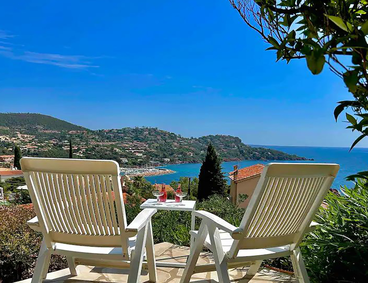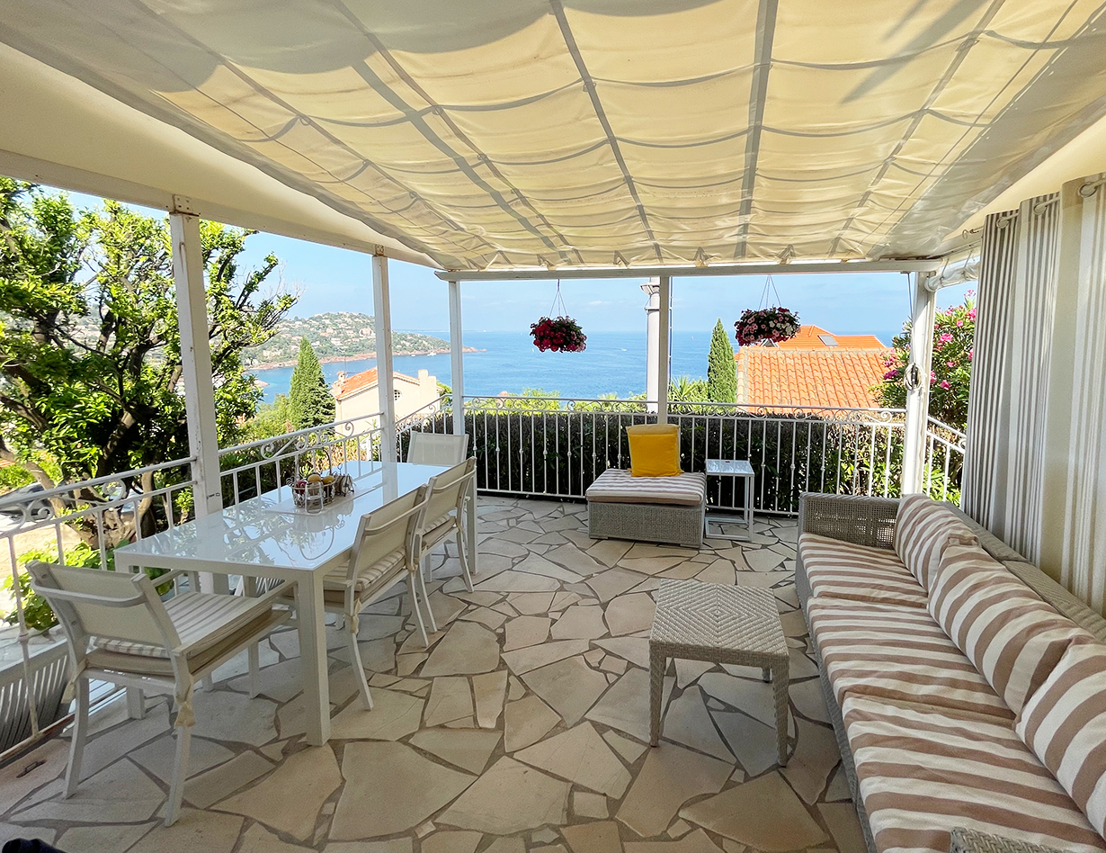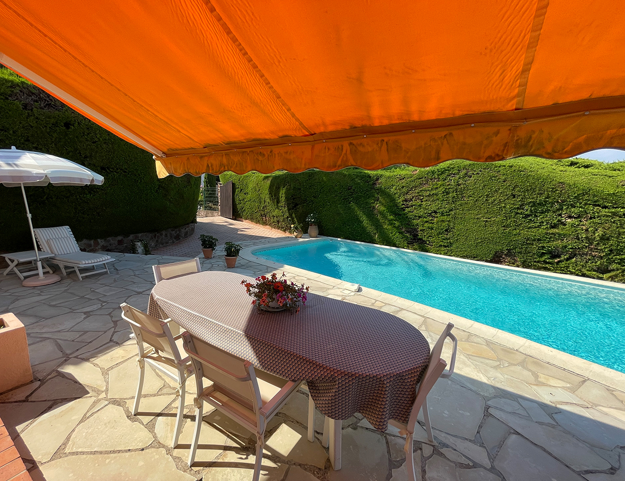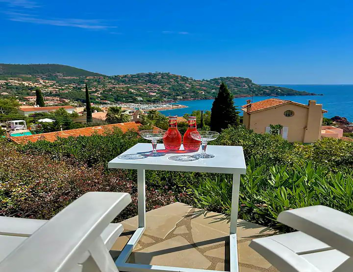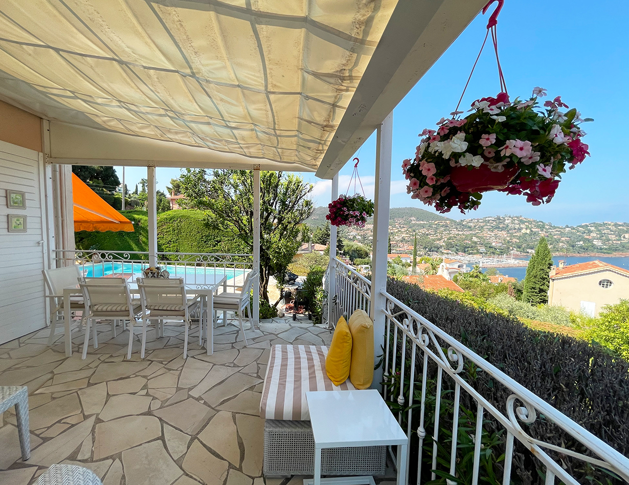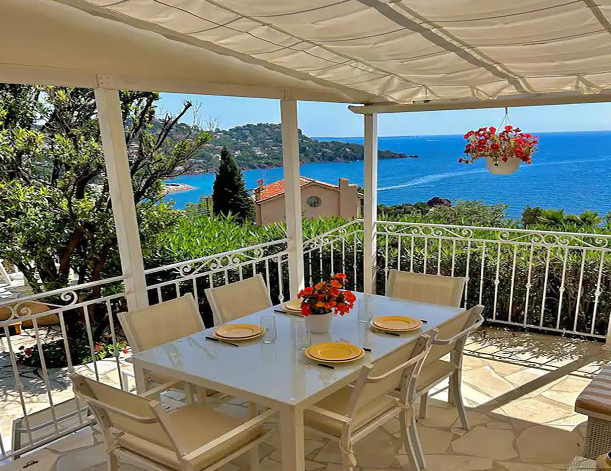 Sehr schönes Ferienhaus auf einer Ebene mit privatem Pool in bester Lage in Le Trayas/Agay, nah zum glamourösen Cannes mit seiner berühmten Croisette, den Filmfestspielen und vm. Das schöne gepflegte Haus liegt nur wenige Gehminuten vom Meer entfernt. Den Supermarkt und zum täglichen Baguette und Croissant holen können Sie in 5 Minuten erreichen. Das nette Haus liegt in einer privaten Domaine in Trayas in ruhiger Lage. Das Haus verfügt über zwei schöne Schlafzimmer mit Doppelbetten und Klimaanlage, 2 Bäder, 2 WCs, eine separate gut ausgestattete Küche und ein Wohn-Eßzimmer mit Meerblick. Eine schöne Terrasse liegt direkt davor mit einem tollen Blick, großem Eßtisch und Loungemöbeln. Am netten Pool lässt es sich den ganzen Tag über aushalten auf komfortablen Sonnenliegen. Oder etwas Boule spielen auf dem Grundstück, was vor dem haus liegt. Das Auto können Sie komfortabel auf dem Grundstück parken oder auch direkt vor dem Haus in der privaten Domaine. Ein sehr angenehmes Haus mit einem wunderschönen Meer-Blick und ein herrlicher Blick auf die Bucht von Cannes.