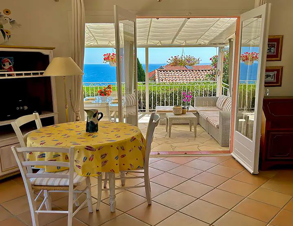 Gemütliche Wohnbereich mit Sofa, Eßtisch innen, mit TV. Austritt zur großen Terrasse mit Eßtisch, Loungemöbeln und mit Meerblick!