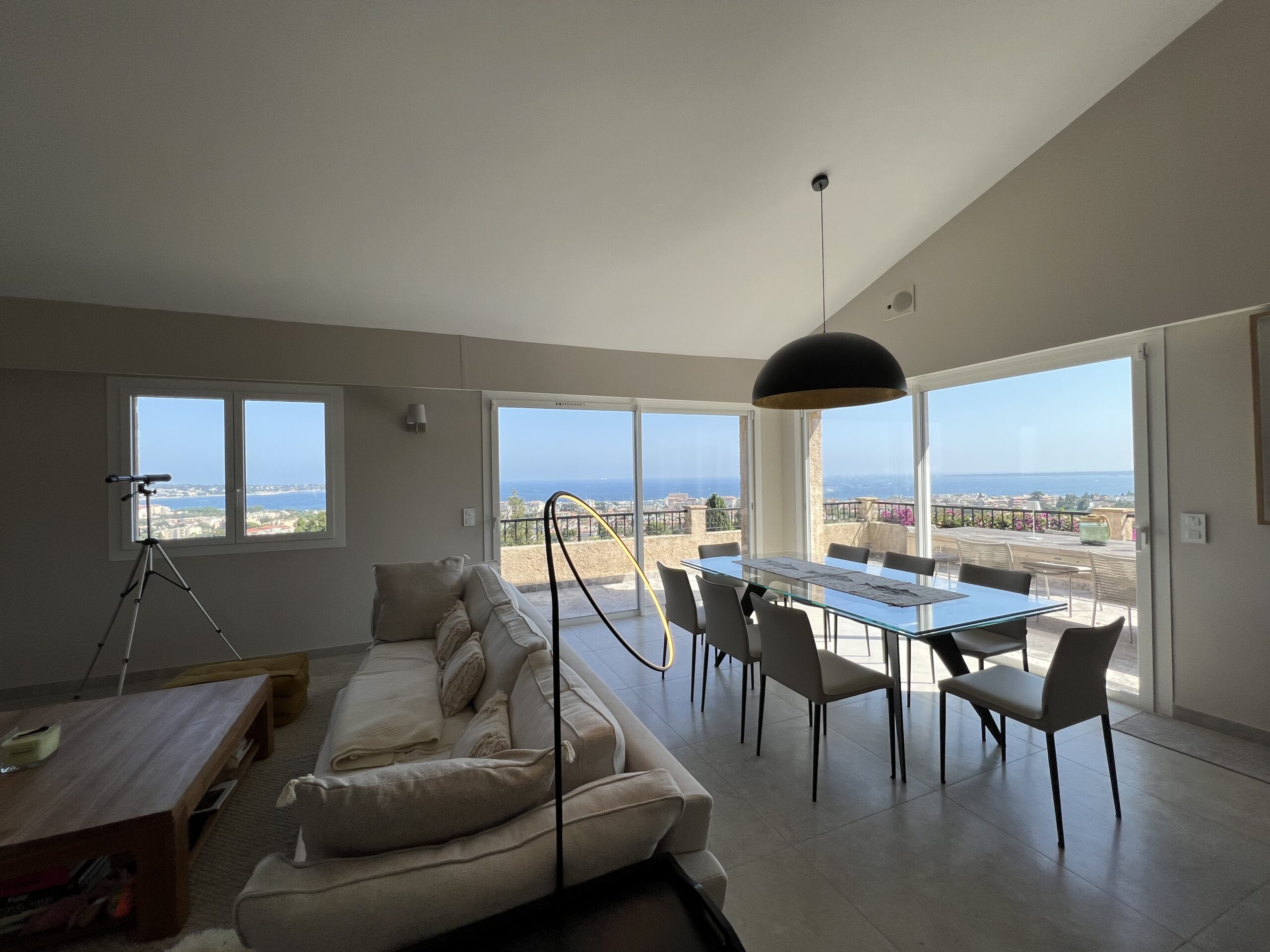 Schöner heller großer Wohn-Eßbereich mit gemütlichen Sofas. Sensationeller Blick. Große Terrasse davor.