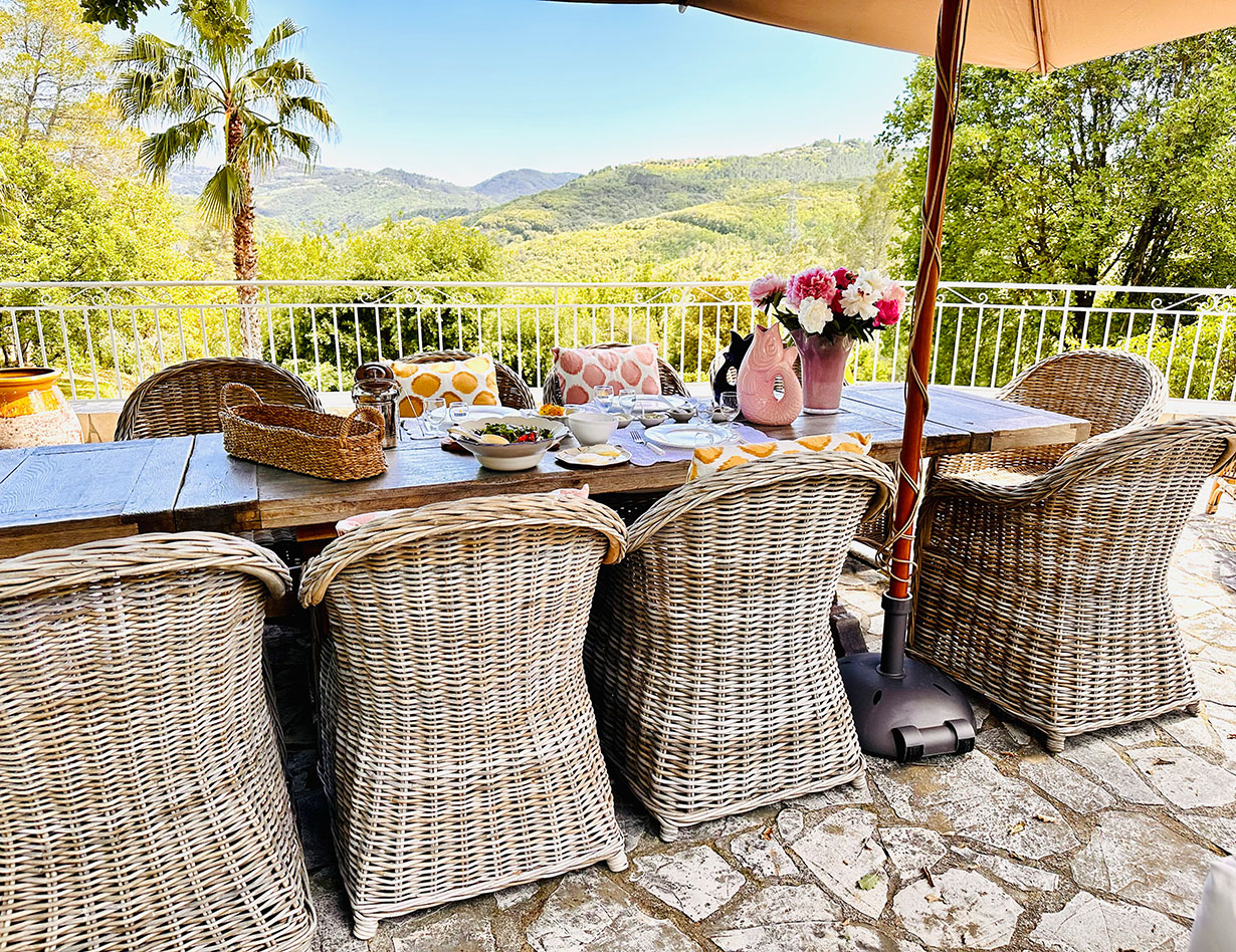 Das Haupthaus umfasst zwei Schlafzimmer mit eigenem Bad/WC, eines davon auf der Wohnebene, sowie die traumhafte Master-Suite im Obergeschoss mit ensuite Bad und WC und Hamman. Auf der Wohnebene neben der Küche befindet sich das schöne Wohn-Eßzimmer mit gemütlichen Sofas und einem tollen Kamin. Die voll ausgestattete Küche lässt die Herzen von Kulinarikern höher schlagen. Mit direkten Austritt auf die romantische Terrasse und einem tollen großen Eßtisch mit Blick auf den Pool, gemütlicher Loungebereich im Freien mit einer idyllischen Kulisse für Mahlzeiten unter freiem Himmel und entspannte Stunden bietet und einem herrlichen Blick! Zudem ein Holzkohlegrill, der das kulinarische Erlebnis im Freien abrundet.