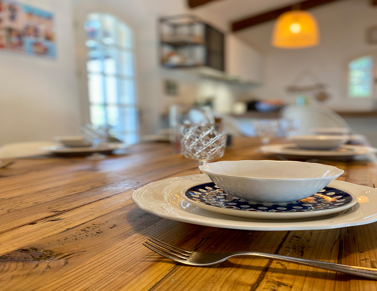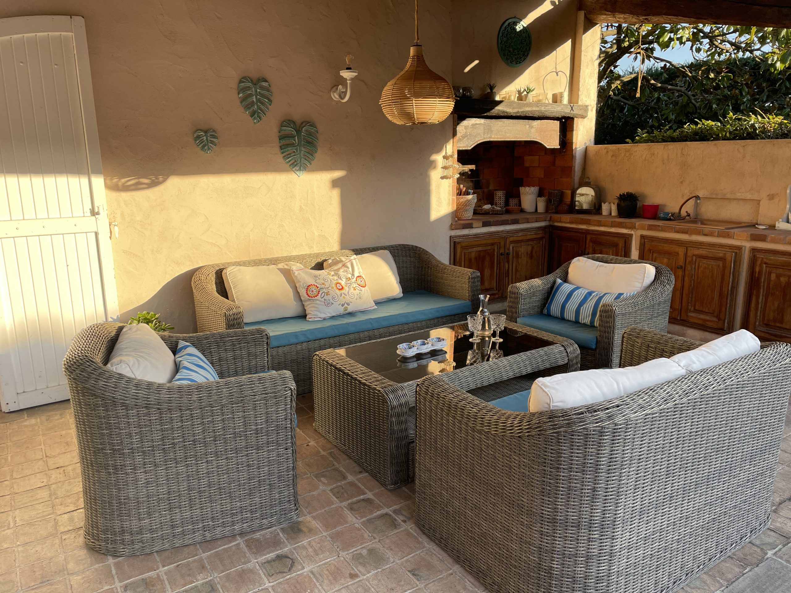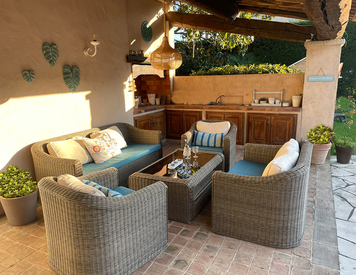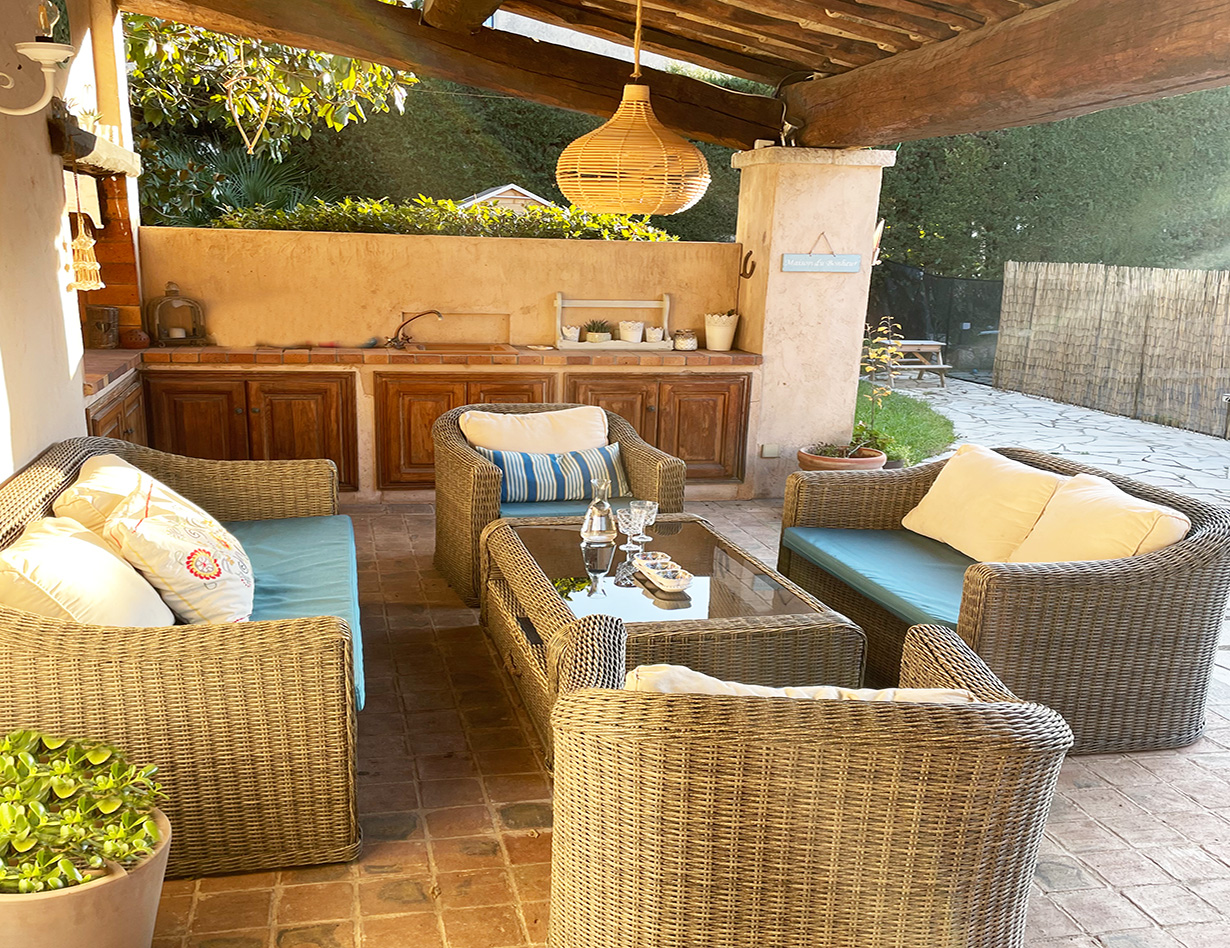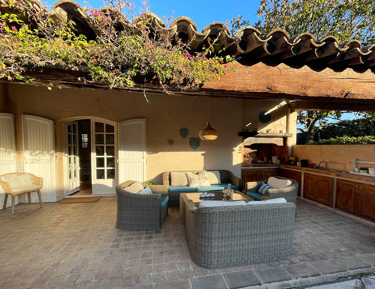 Große Terrasse vor dem Haus mit Eßtisch auf beiden Seiten des Hauses. Loungemöbel. Sommerküche.