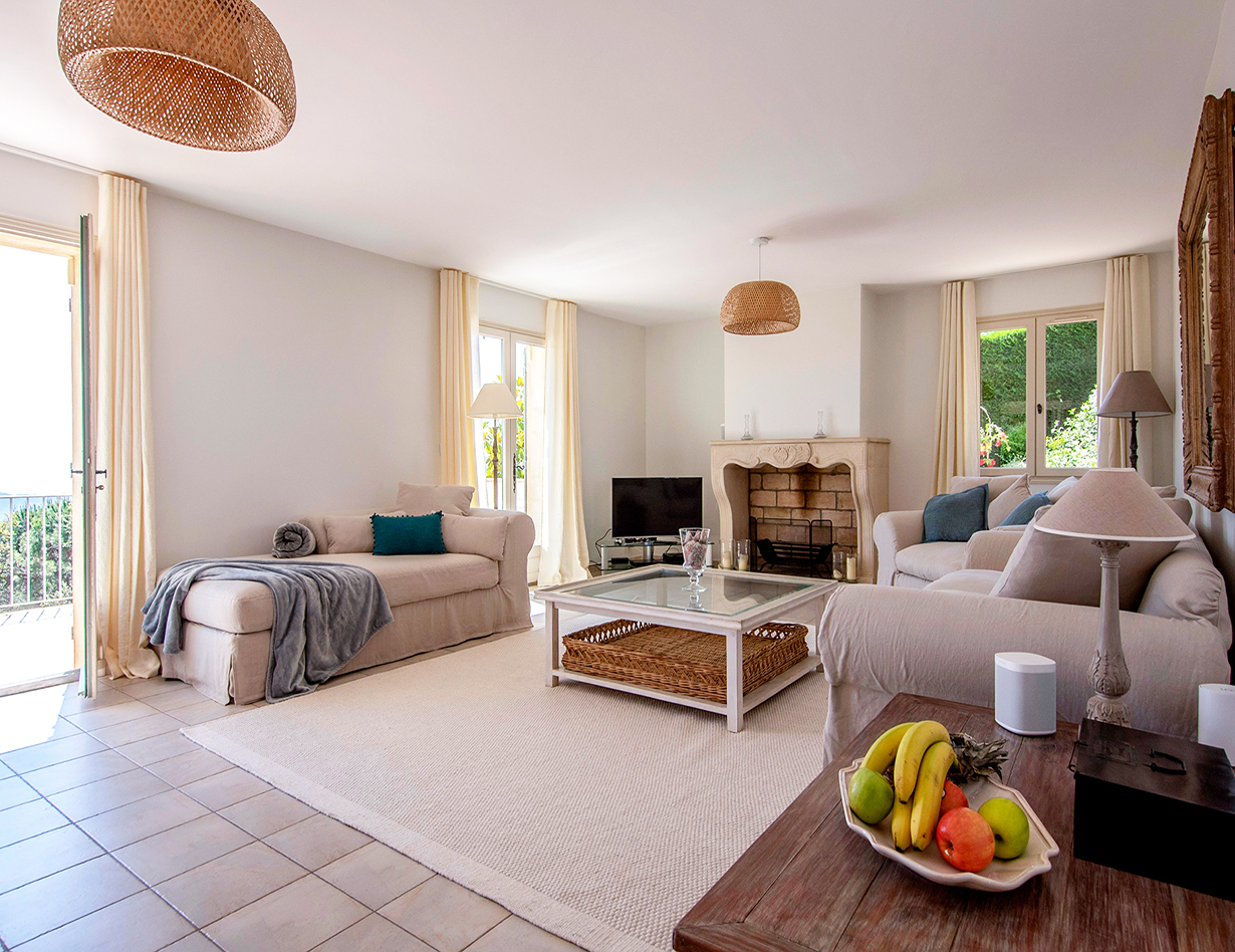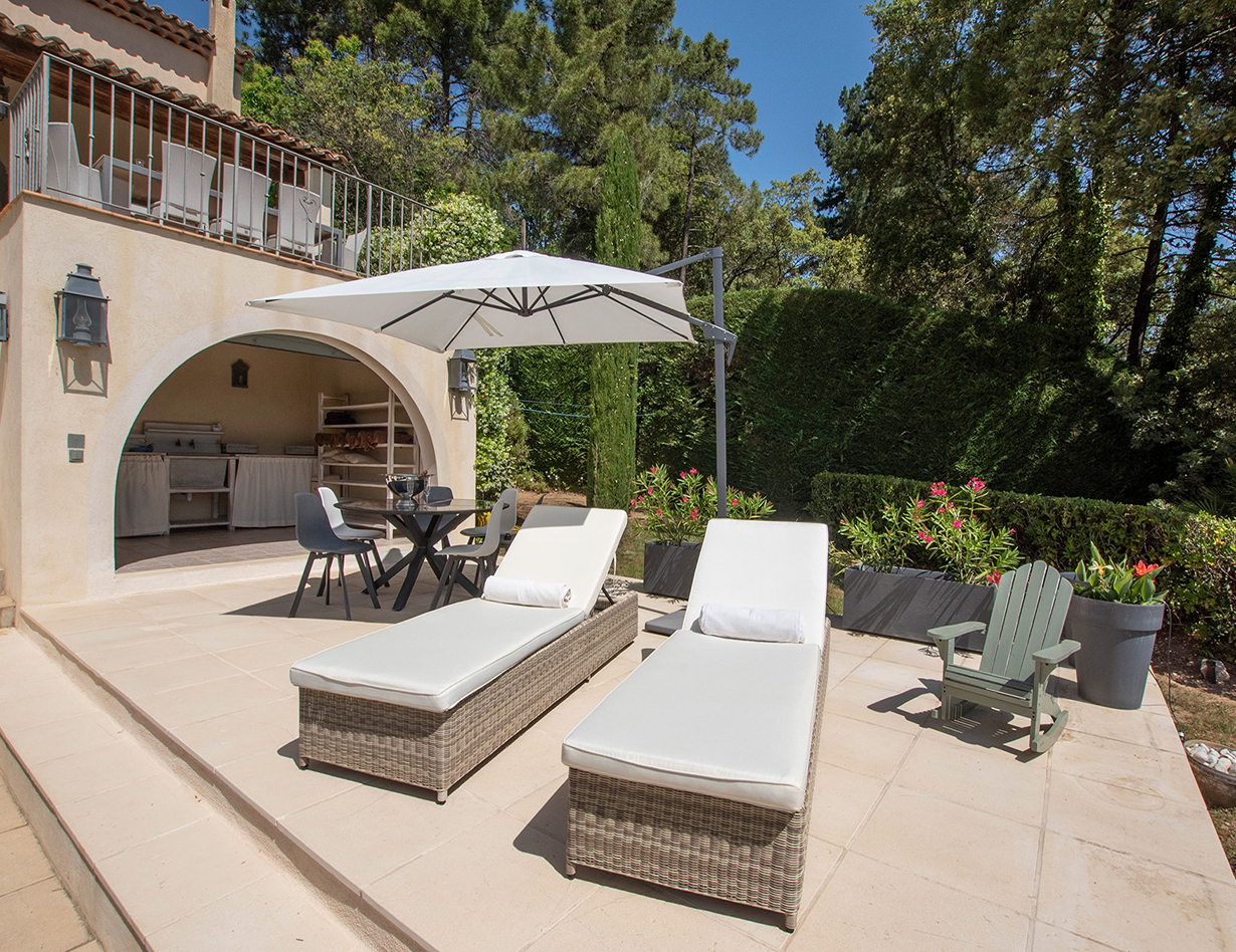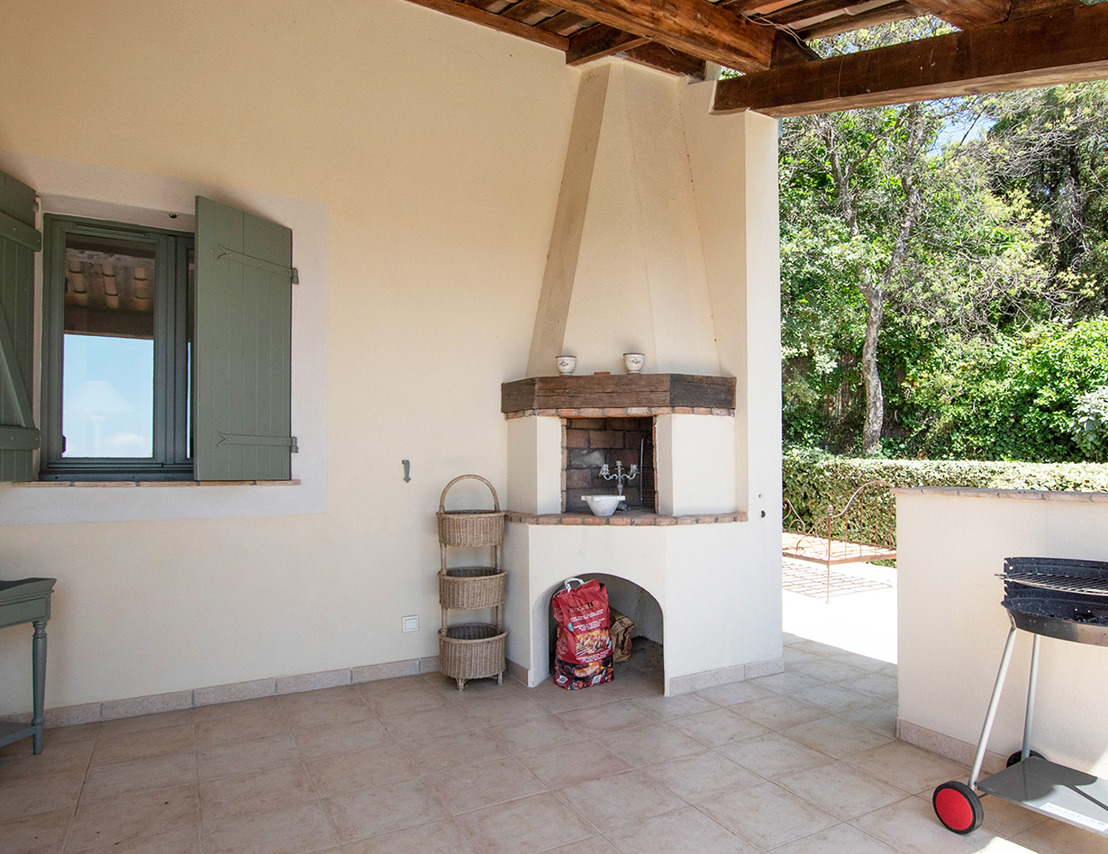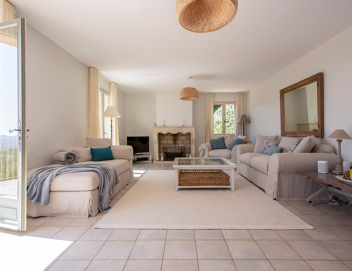 Der Kamin und die gemütlichen Sofas runden das wohlig-warme Ambiente eines zweiten „Zuhauses auf Zeit“ perfekt ab. Die halb offene Küche ist vom amerikanischen Kühlschrank bis zur Nespresso-Maschine so ausgestattet, dass Ihnen nichts fehlt. Vor der Wohnebene liegen mehrere Terrassen, die zum Teil überdacht sind, wobei alle einen umwerfenden malerischen Blick auf die wunderschöne Landschaft zulassen. Umgeben von herrlichen mediterranen Pflanzen, Olivenbäumen, einem Bouleplatz und einer Tischtennisplatte bieten der Gas-BBQ-Grill und die komfortablen Loungemöbel – sowohl auf der oberen Terrasse als auch direkt am Pool – gleichermaßen die perfekte Gelegenheit zum Relaxen und für einen geselligen Tag.