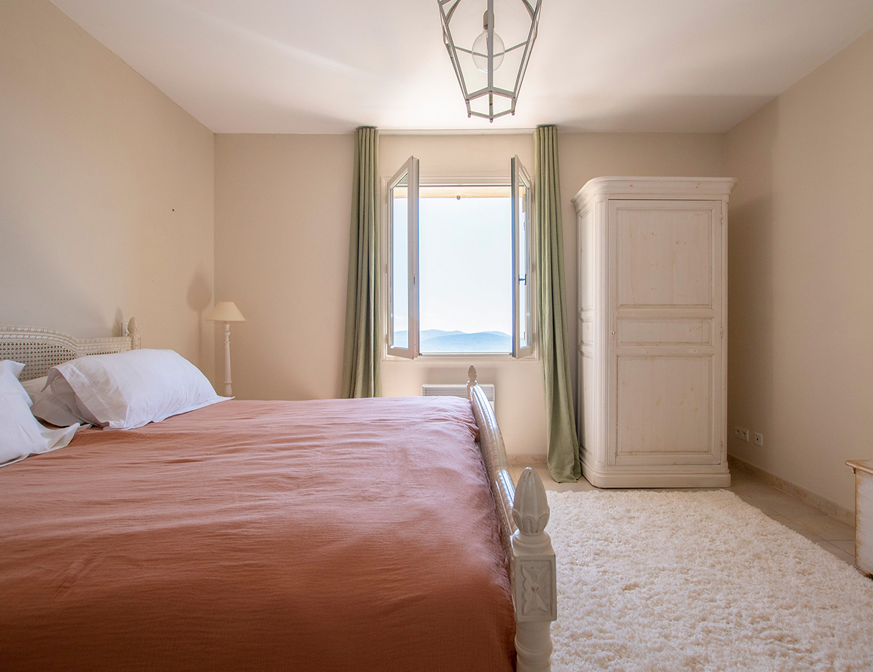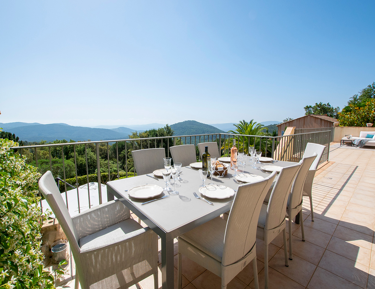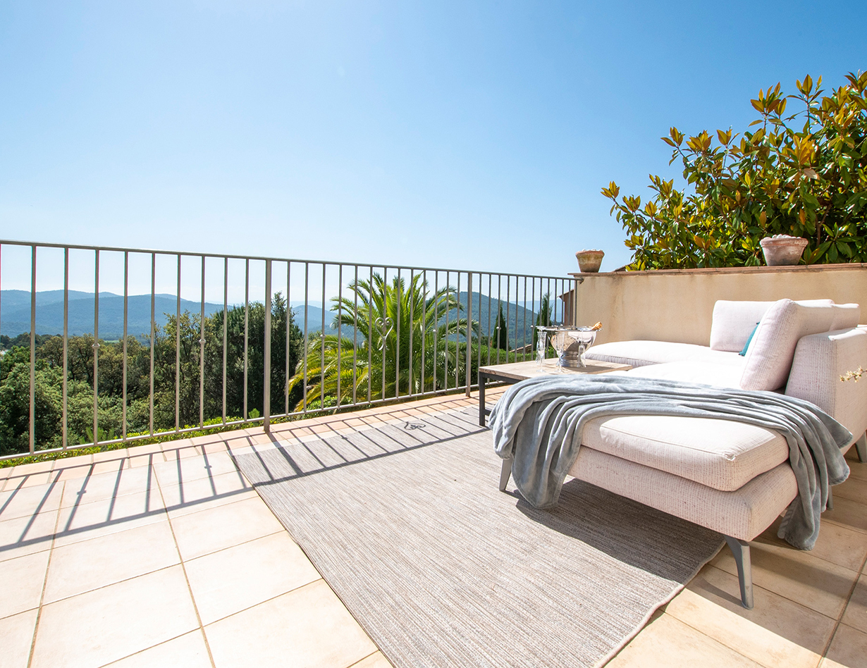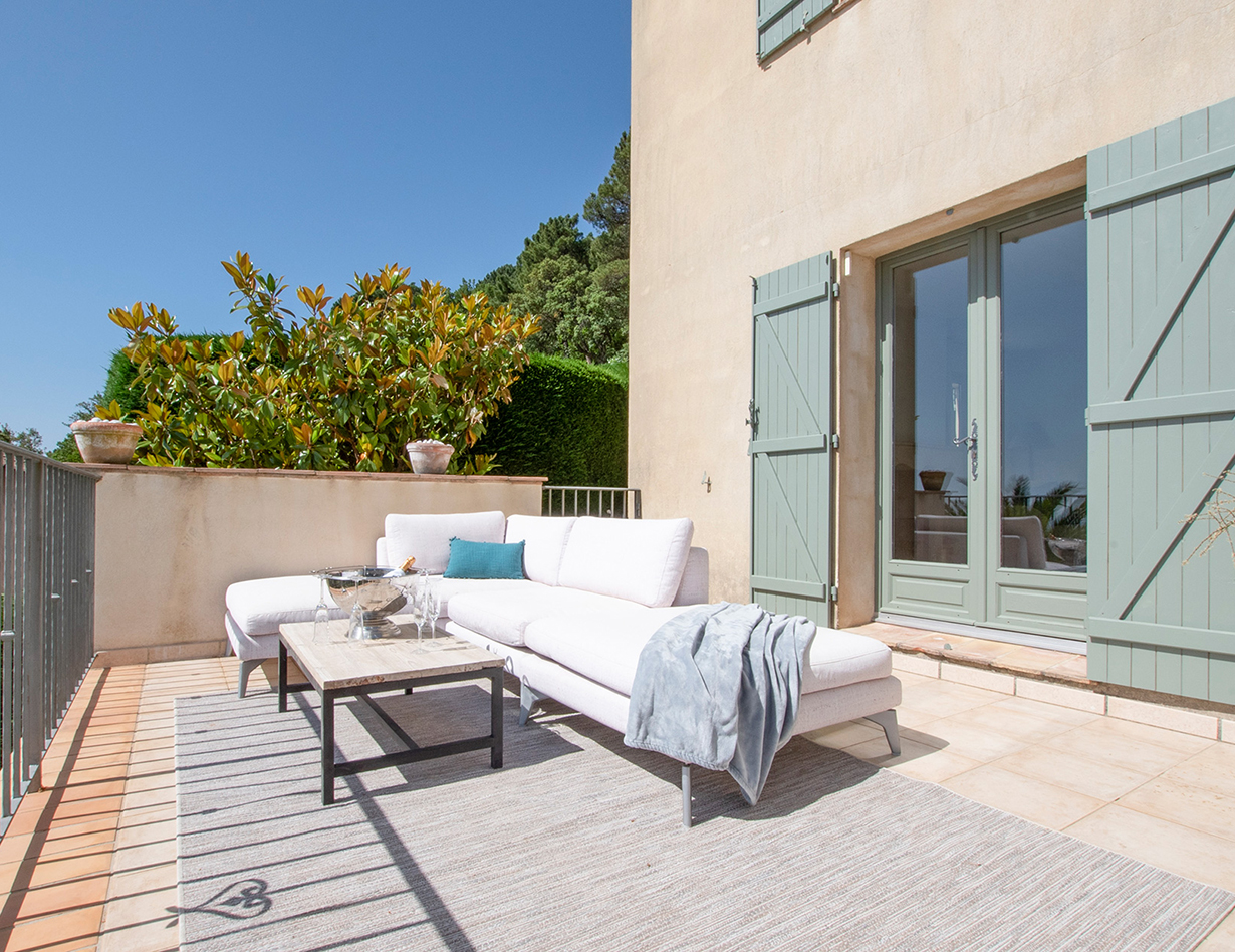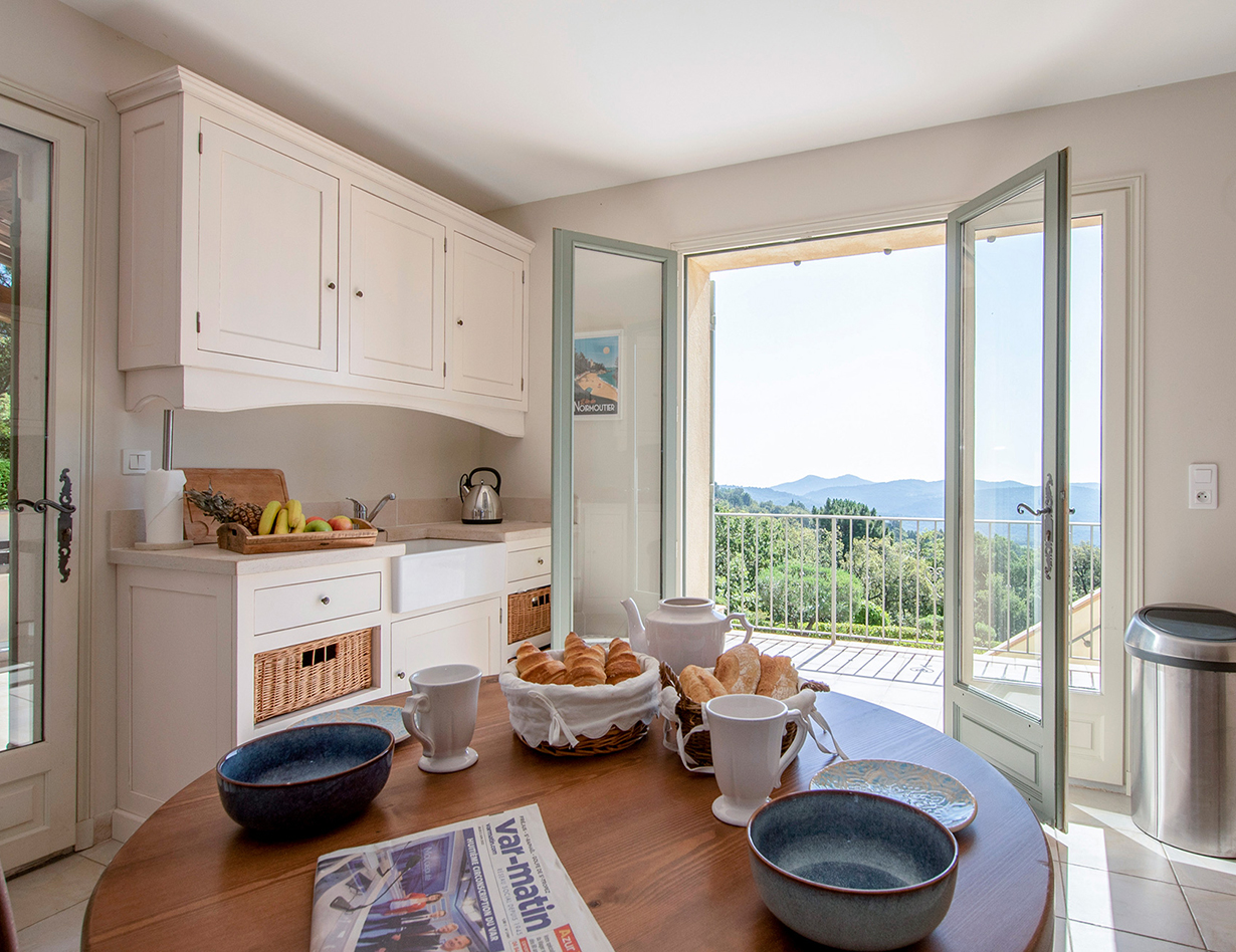 Der Kamin und die gemütlichen Sofas runden das wohlig-warme Ambiente eines zweiten „Zuhauses auf Zeit“ perfekt ab. Die halb offene Küche ist vom amerikanischen Kühlschrank bis zur Nespresso-Maschine so ausgestattet, dass Ihnen nichts fehlt. Vor der Wohnebene liegen mehrere Terrassen, die zum Teil überdacht sind, wobei alle einen umwerfenden malerischen Blick auf die wunderschöne Landschaft zulassen. Umgeben von herrlichen mediterranen Pflanzen, Olivenbäumen, einem Bouleplatz und einer Tischtennisplatte bieten der Gas-BBQ-Grill und die komfortablen Loungemöbel – sowohl auf der oberen Terrasse als auch direkt am Pool – gleichermaßen die perfekte Gelegenheit zum Relaxen und für einen geselligen Tag.