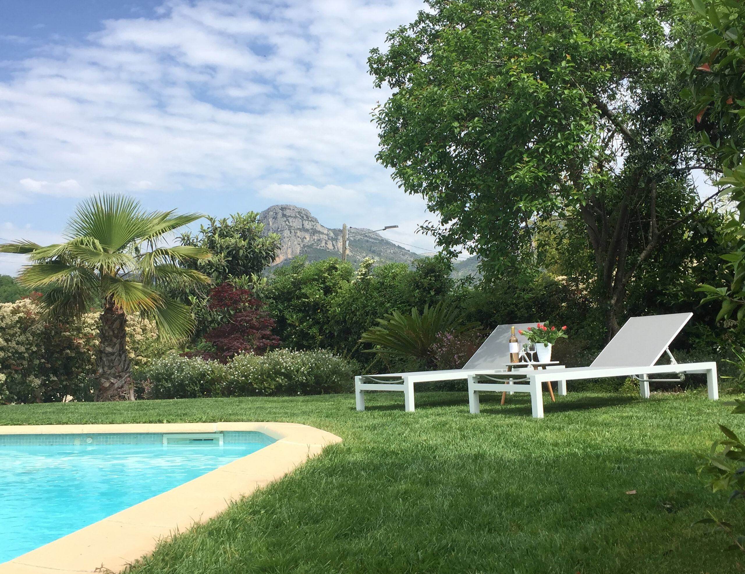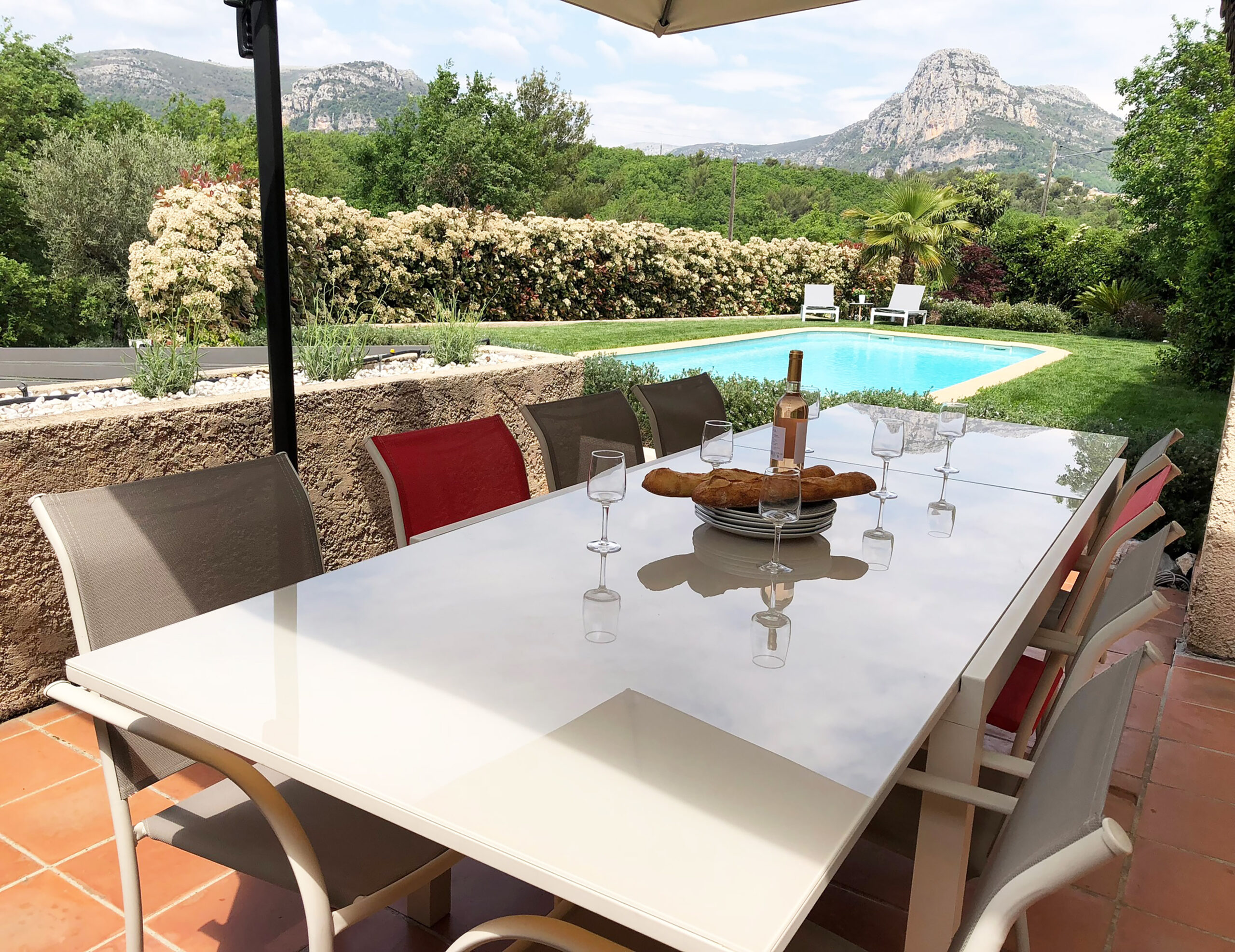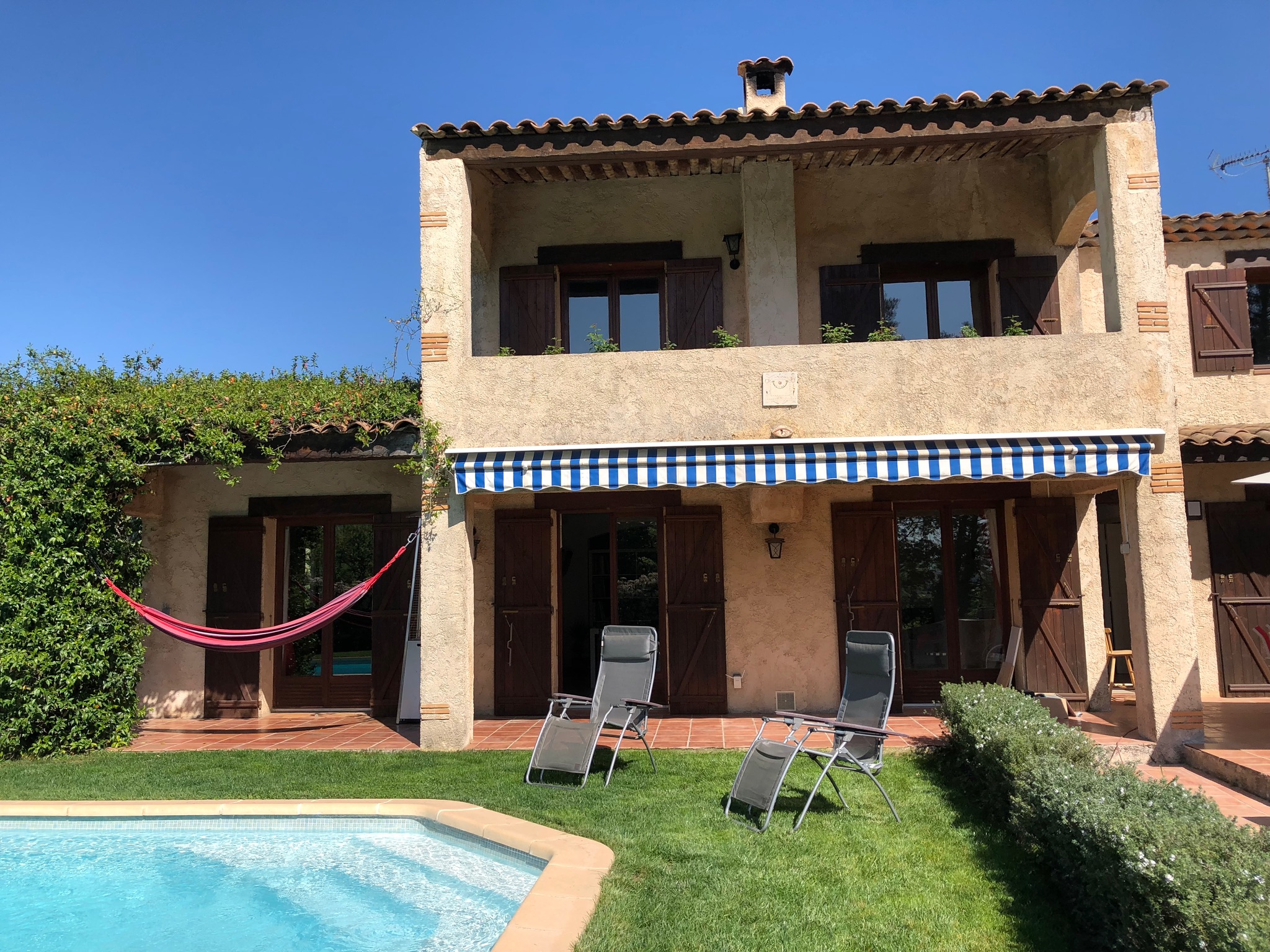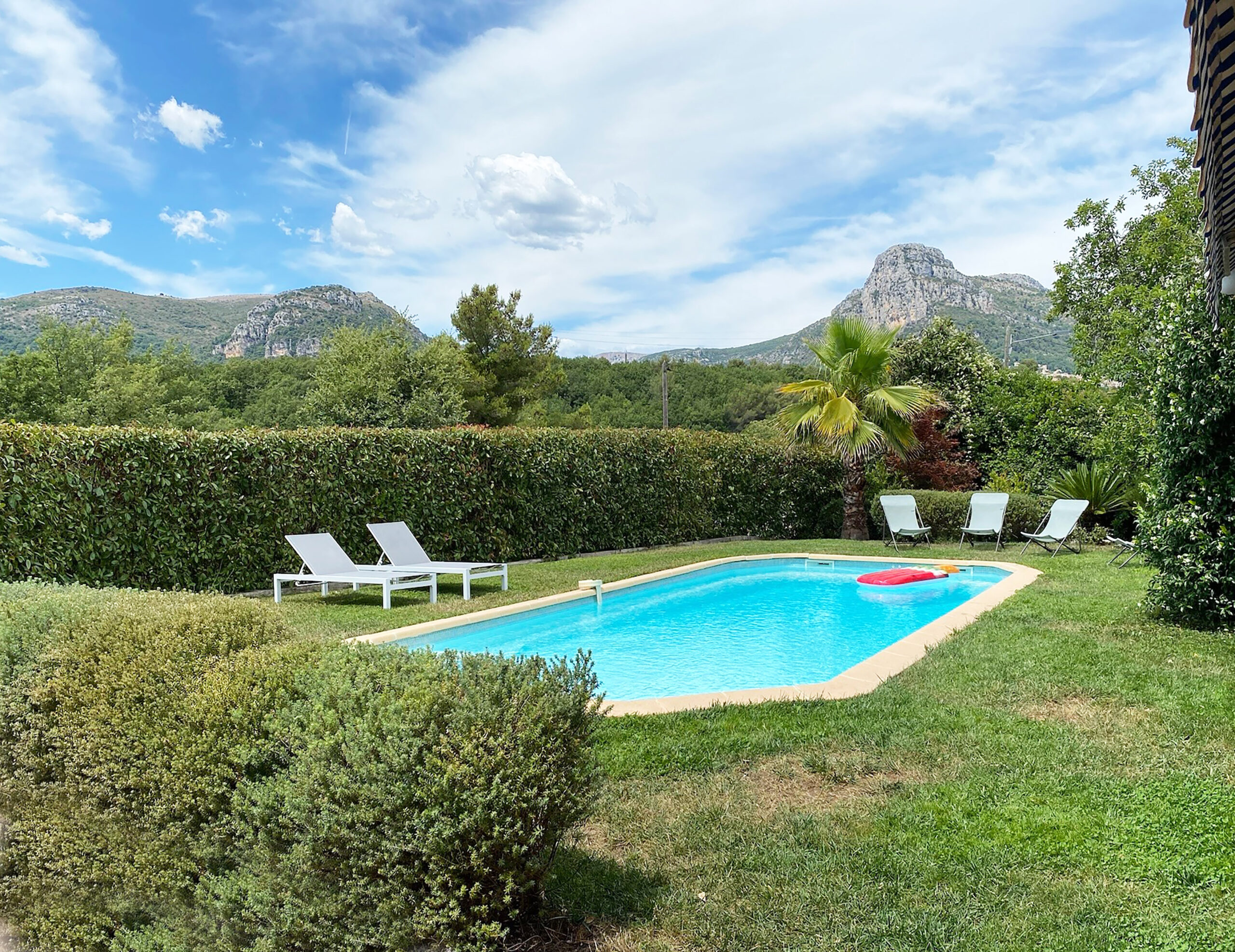 Schönes Ferienhaus nah zum Ort La Gaude (bekannt u.A. auch durch sein sensationelles Jazz Festival), nah zu Vence und nah zu Nizza. Das einseitig dezent angebaute hübsche Ferienhaus steht in ganz ruhiger Lage und hat einen wunderbaren Blick auf die Berge. Es verfügt über 4 hübsche Schlafzimmer mit Doppelbetten, 3 Bädern, 3 WCs, einen großen komfortablen Wohn-Eßbereich und eine offene sehr gut ausgestattete Wohnküche. Davor liegt eine Terrasse mit großem Eßtisch und Blick in den Garten und Pool. Loungeecke auf der überdachten Terrasse. Großer Gas-BBQ. Der Pool hat ca 9×4 Meter, komfortable Sonnenliegen und Schirme. Tischtennisplatte, Trampolin im Garten. Parken ganz bequem vor dem Haus. Ein sehr nettes Haus für die ganze Familie. Ideal um sich wunderbar zu entspannen, toller Ausgangspunkt auch, um schnell in das wunderschöne Hinterland der Alpes Maritimes zum Wandern loszulegen. Zum Meer sind es ca. 14 km , zum Flughafen Nizza 15 km, nach Vence 8 km.
