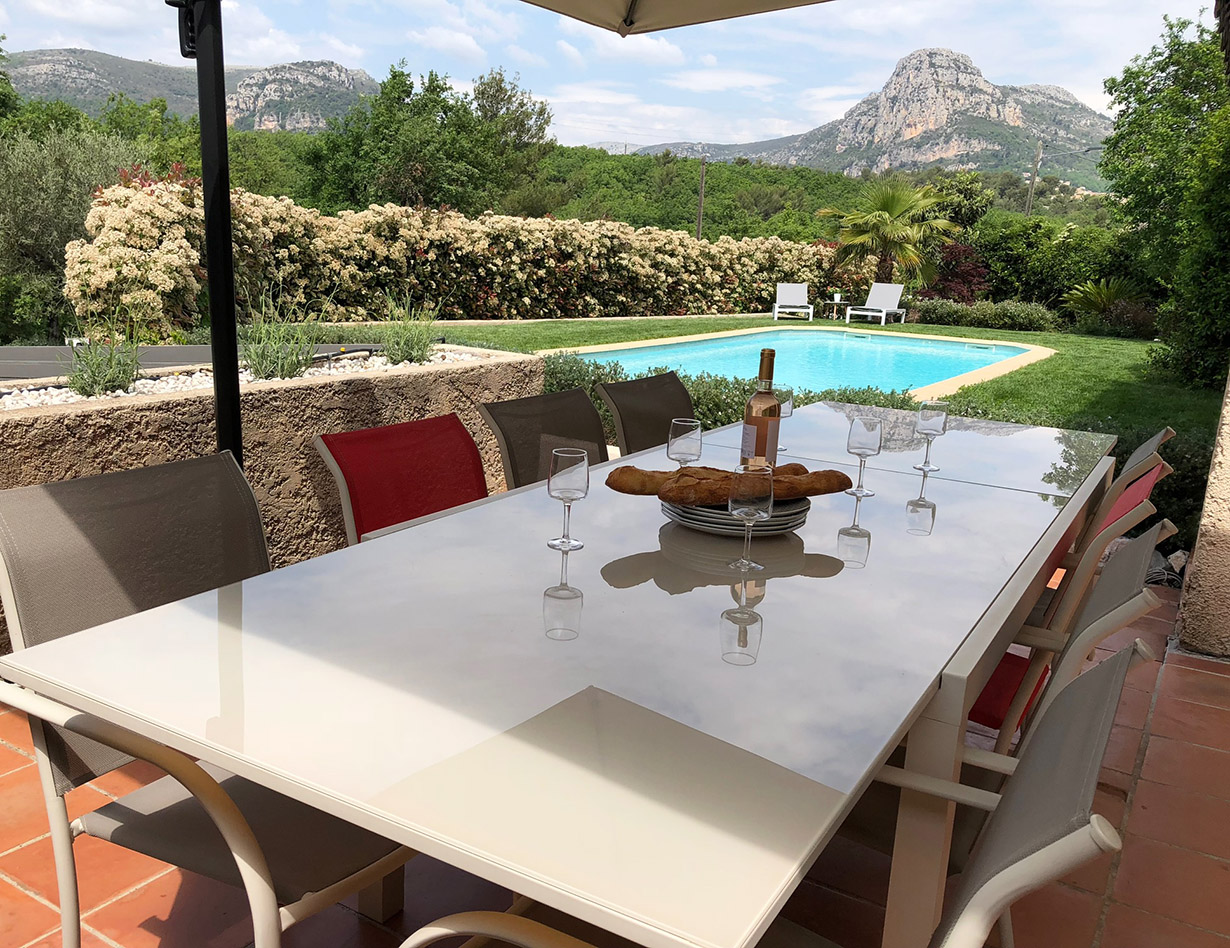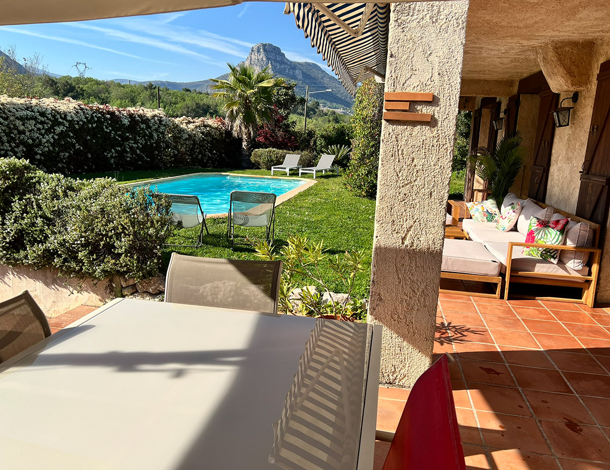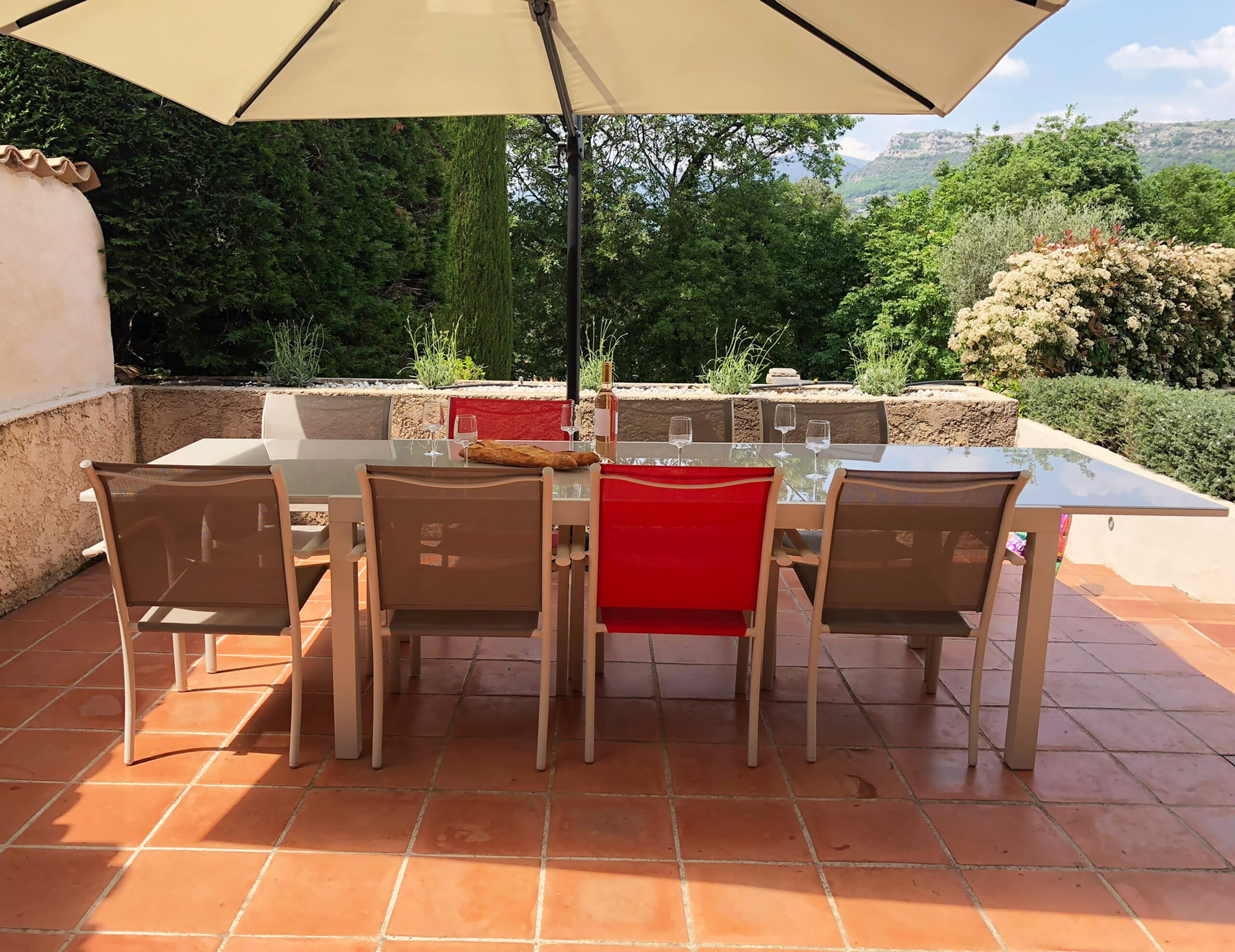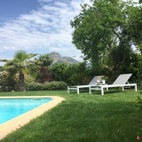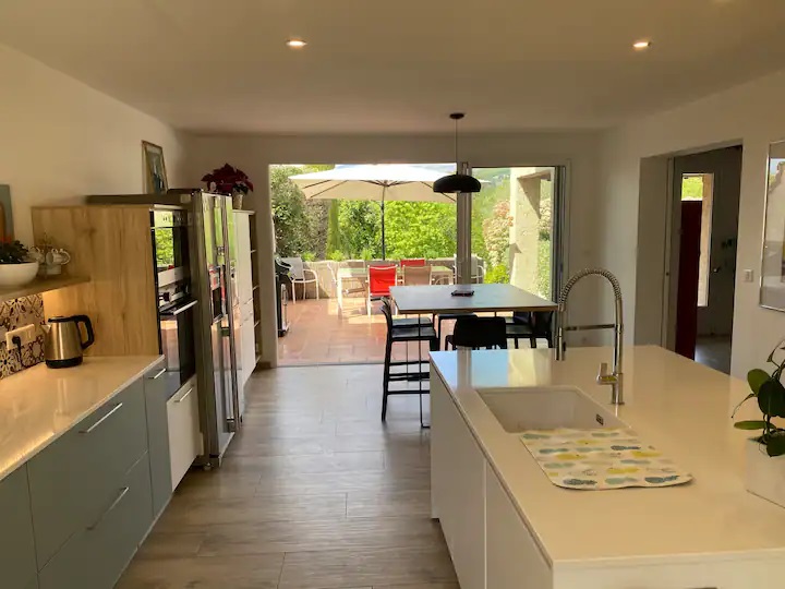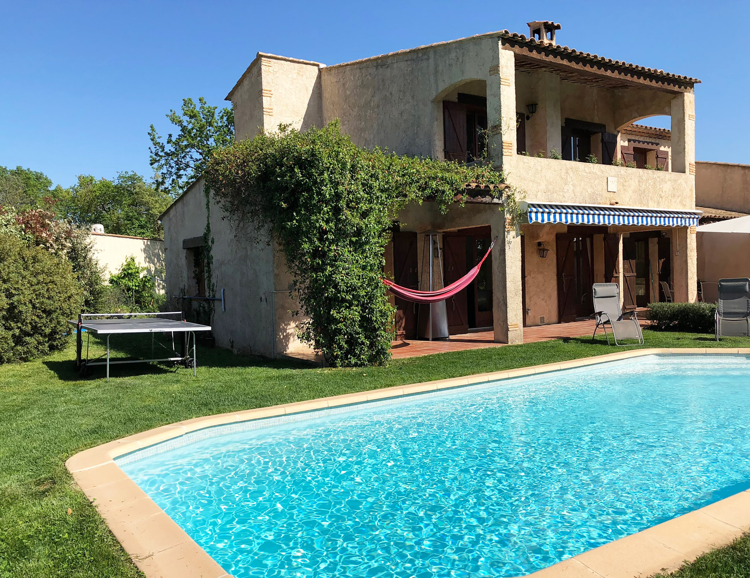 Schönes Ferienhaus nah zum Ort La Gaude (bekannt u.A. auch durch sein sensationelles Jazz Festival), nah zu Vence und nah zu Nizza. Das einseitig dezent angebaute hübsche Ferienhaus steht in ganz ruhiger Lage und hat einen wunderbaren Blick auf die Berge. Es verfügt über 4 hübsche Schlafzimmer mit Doppelbetten, 3 Bädern, 3 WCs, einen großen komfortablen Wohn-Eßbereich und eine offene sehr gut ausgestattete Wohnküche. Davor liegt eine Terrasse mit großem Eßtisch und Blick in den Garten und Pool. Loungeecke auf der überdachten Terrasse. Großer Gas-BBQ. Der Pool hat ca 9×4 Meter, komfortable Sonnenliegen und Schirme. Tischtennisplatte, Trampolin im Garten. Parken ganz bequem vor dem Haus. Ein sehr nettes Haus für die ganze Familie. Ideal um sich wunderbar zu entspannen, toller Ausgangspunkt auch, um schnell in das wunderschöne Hinterland der Alpes Maritimes zum Wandern loszulegen. Zum Meer sind es ca. 14 km , zum Flughafen Nizza 15 km, nach Vence 8 km.