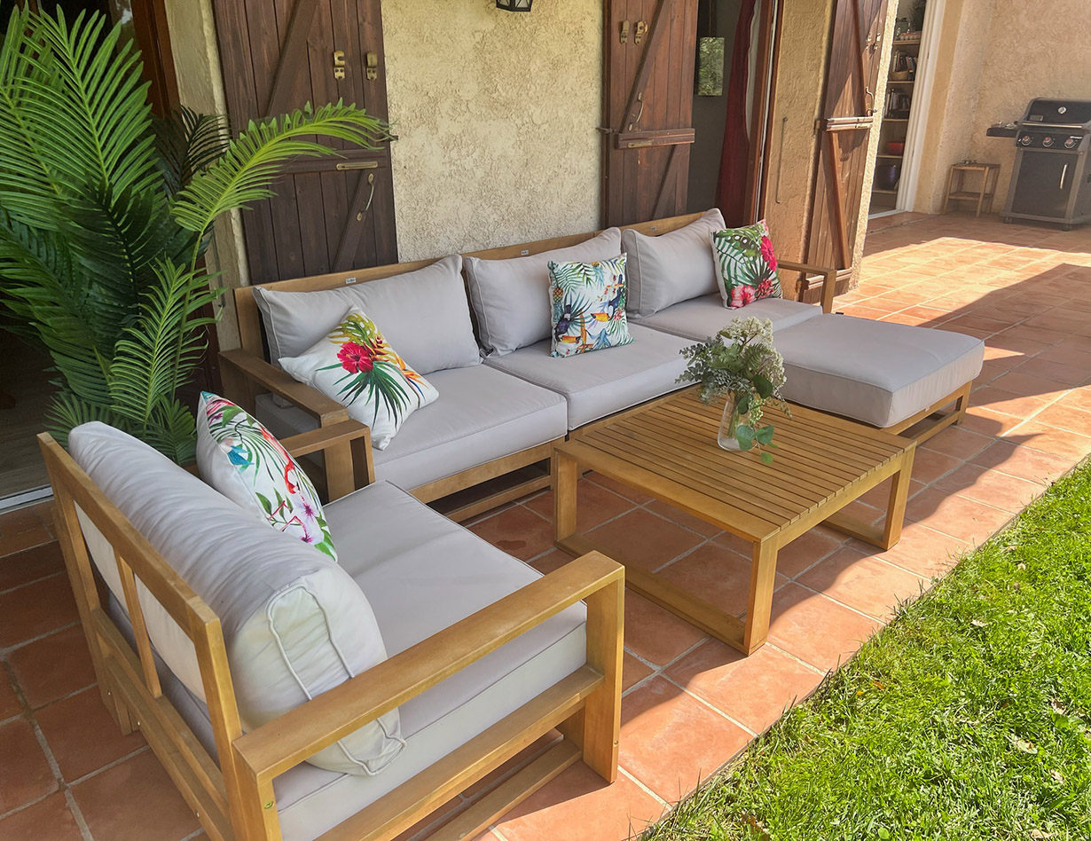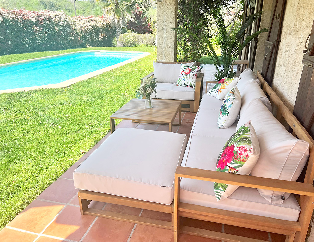 Große Terrassen vor dem Haus, z.T auch überdacht. Schöne gemütliche Loungemöbel