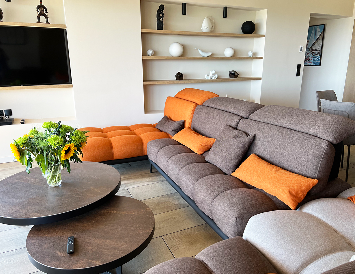 Mit Meerblick, Schöne große z.T. überdachte Terrasse mit gemütlichen Loungemöbeln. BBQ