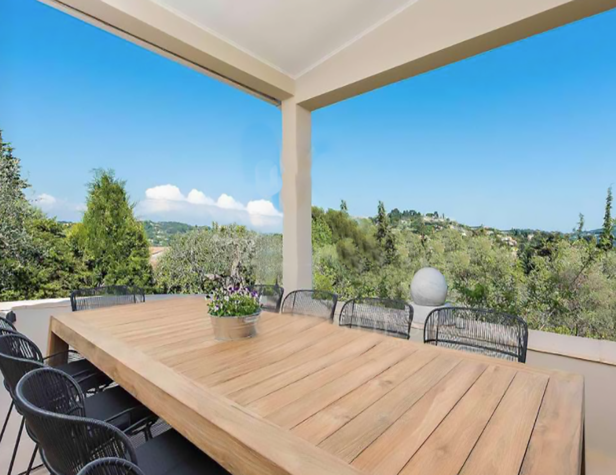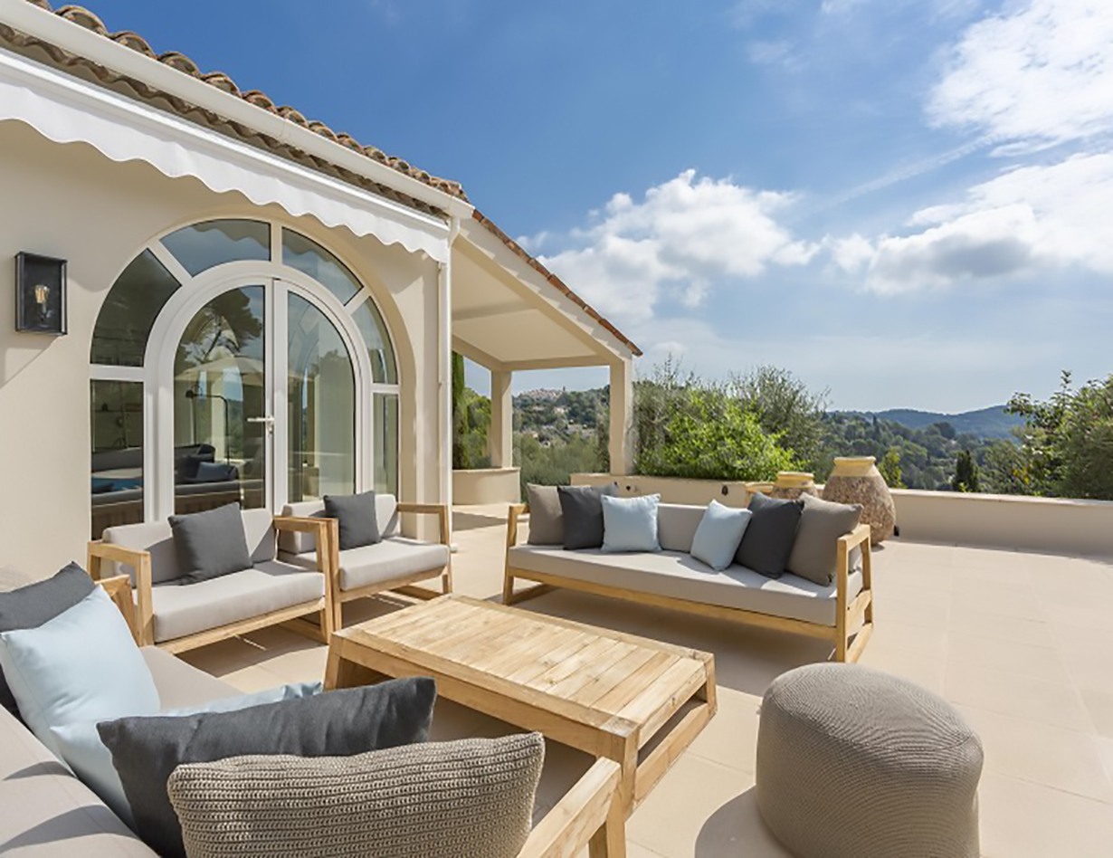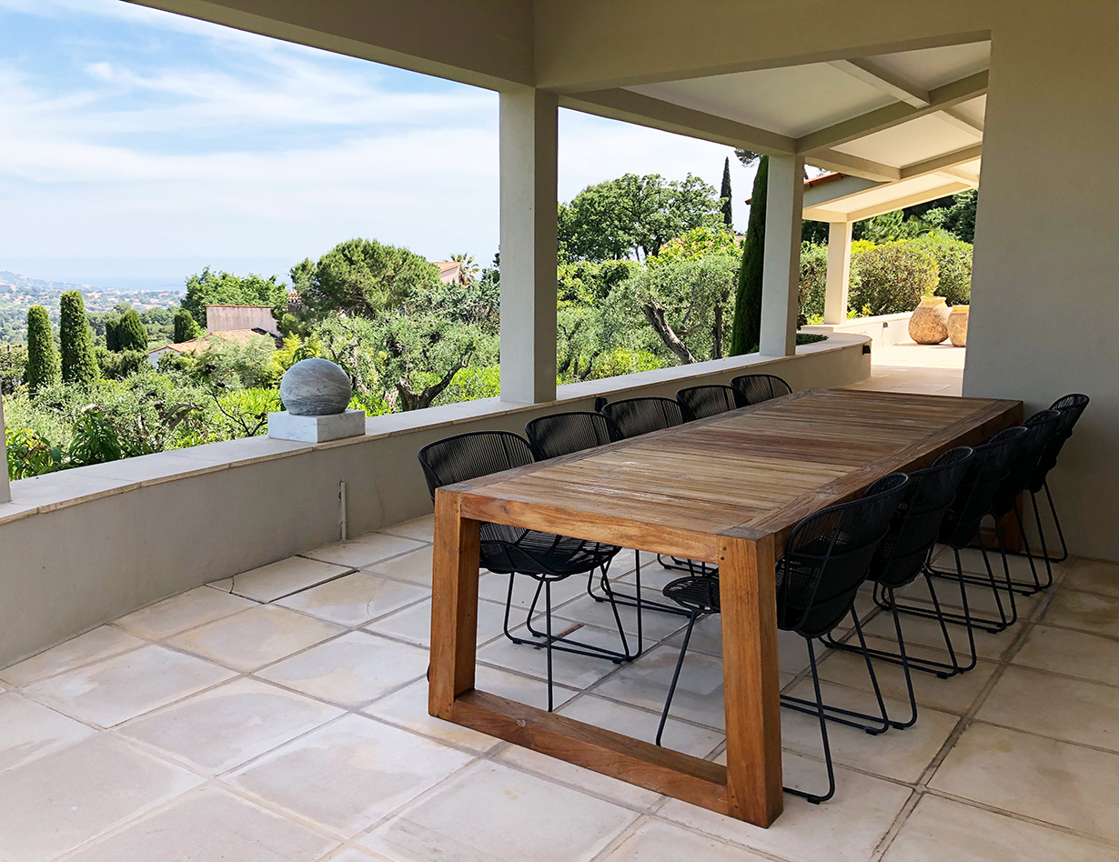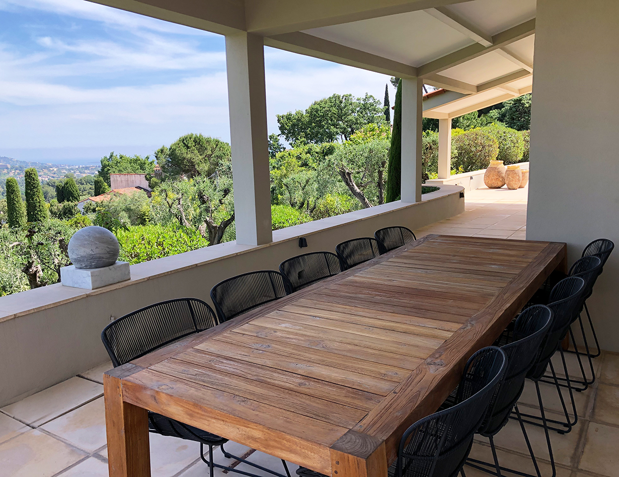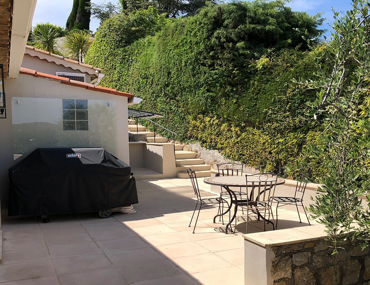 Wenn Sie nach einem abwechslungsreichen Urlaubstag in die Villa „Bouscarle“ zurückkehren, bietet Ihnen die großzügige und exklusive Wohnebene ausnahmslos alles, was Sie zum Durchatmen und Entspannen brauchen. Direkt vom Wohnbereich kommen Sie auf die überdachte Terrasse, die bei jedem Wetter zum Entspannen geeignet ist und Ihnen einen grandiosen Blick auf die Umgebung bietet. Genießen Sie Ihre Urlaubsabende bei einem gemütlichen BBQ mit dem großen Gasgrill und freuen Sie sich darauf, in Ihrem Ferienhaus in Mougins den Charme der Côte d’Azur hautnah zu erleben. Sowohl im Innen- als auch im Außenbereich steht Ihnen ein großer Esstisch zur Verfügung, der zum gemeinsamen Speisen während des Aufenthalts einlädt.