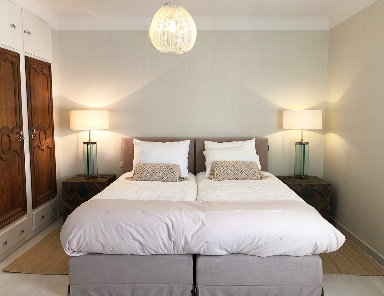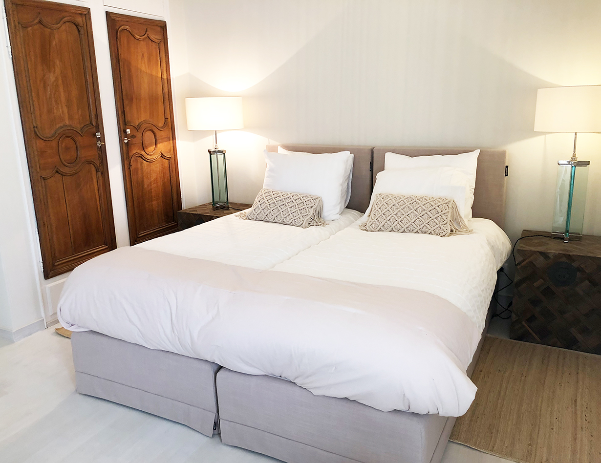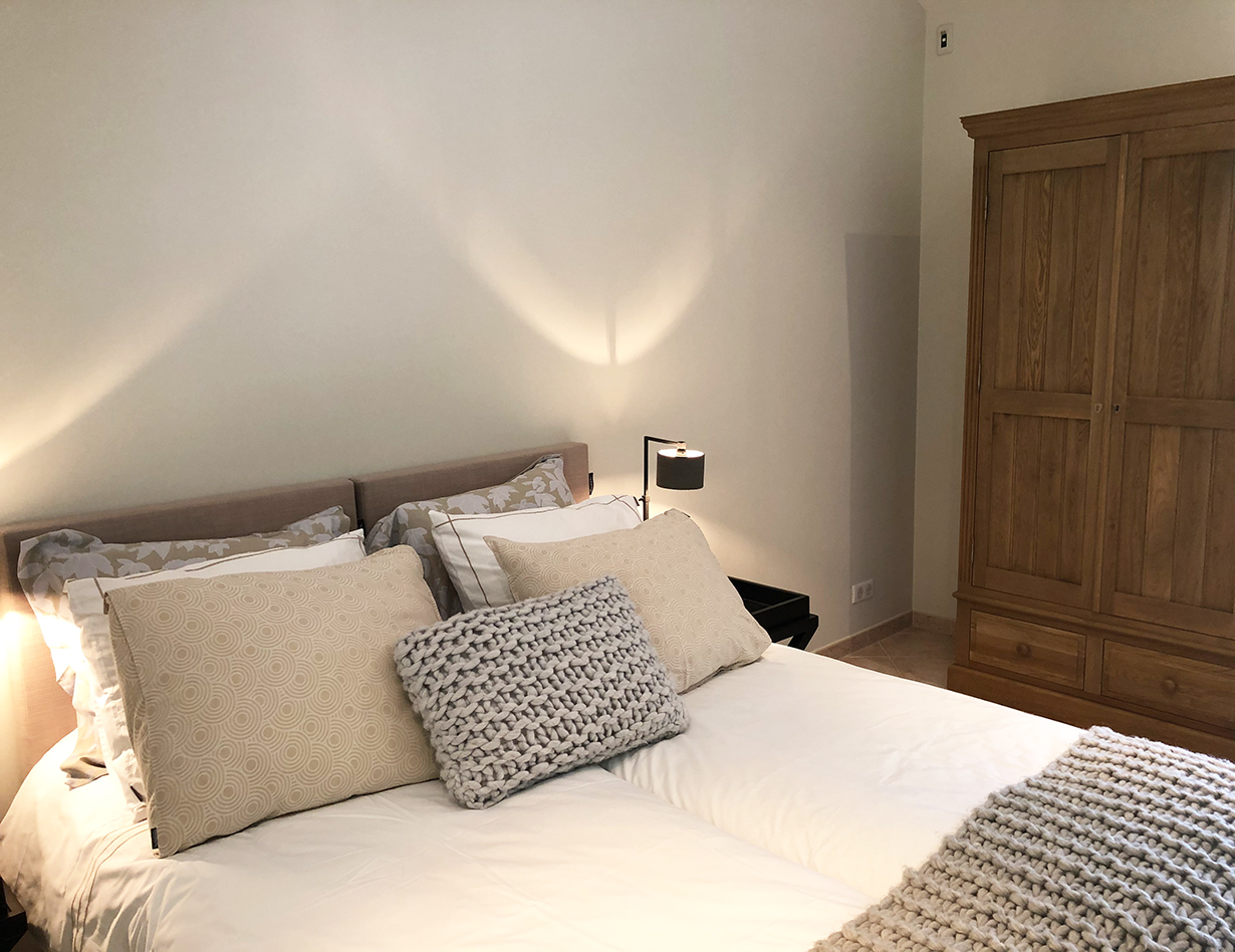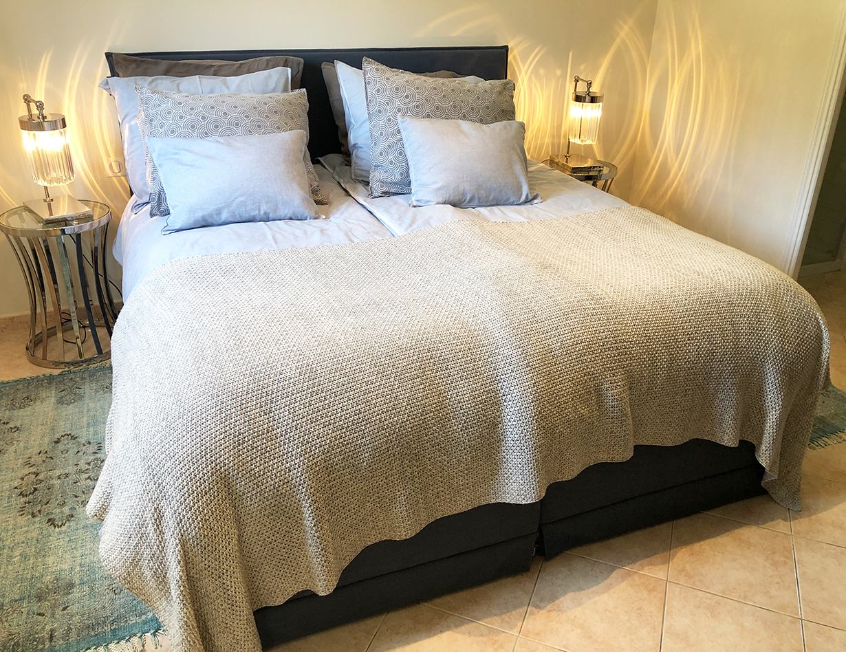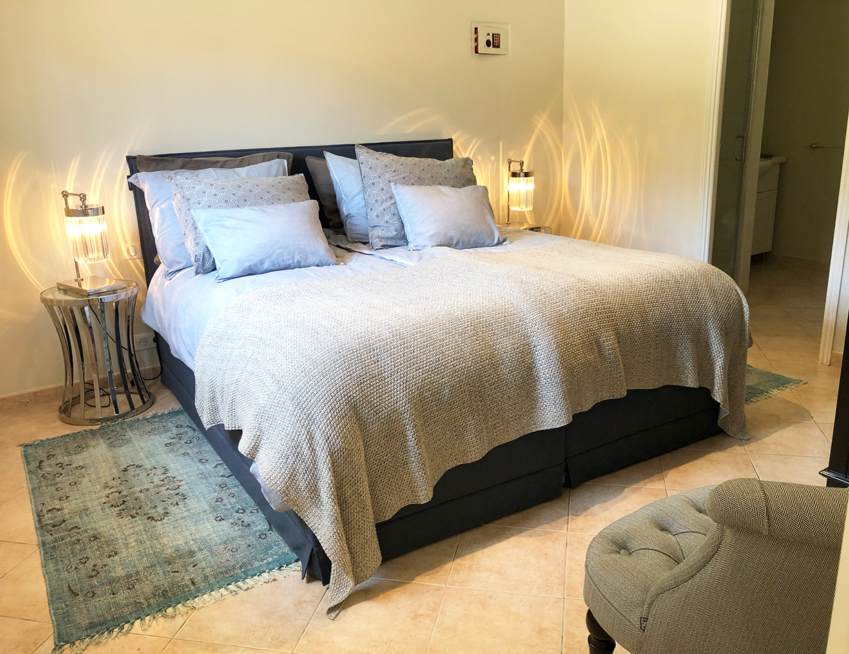 Voll klimatisiert, 5 Schlafzimmer mit komfortablen Doppelbetten: 4 im Haupthaus, 1 im sep. Studio. Alle Betten sind Boxspringbetten von sehr hoher Qualität.