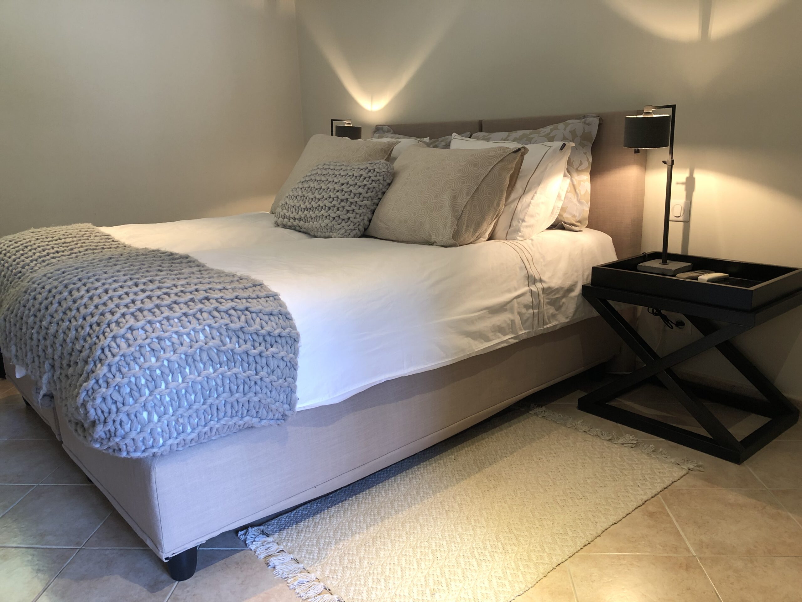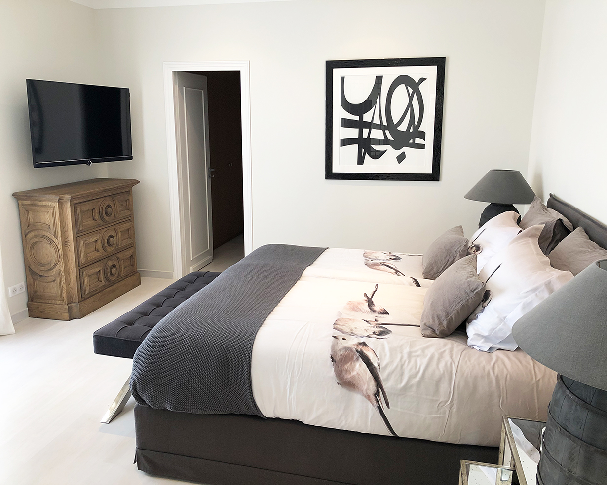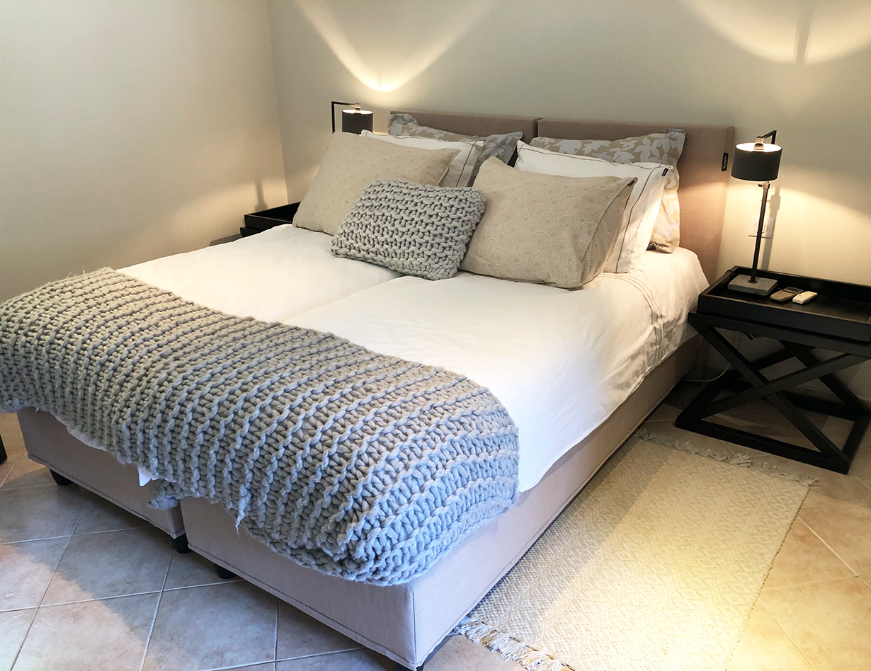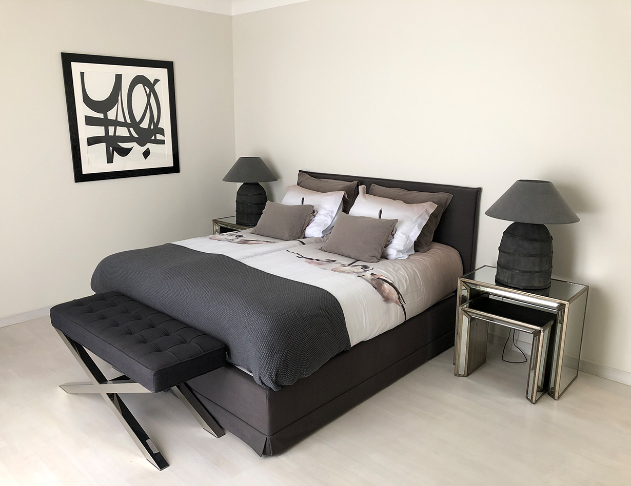 Voll klimatisiert, 5 Schlafzimmer mit komfortablen Doppelbetten: 4 im Haupthaus, 1 im sep. Studio. Alle Betten sind Boxspringbetten von sehr hoher Qualität.