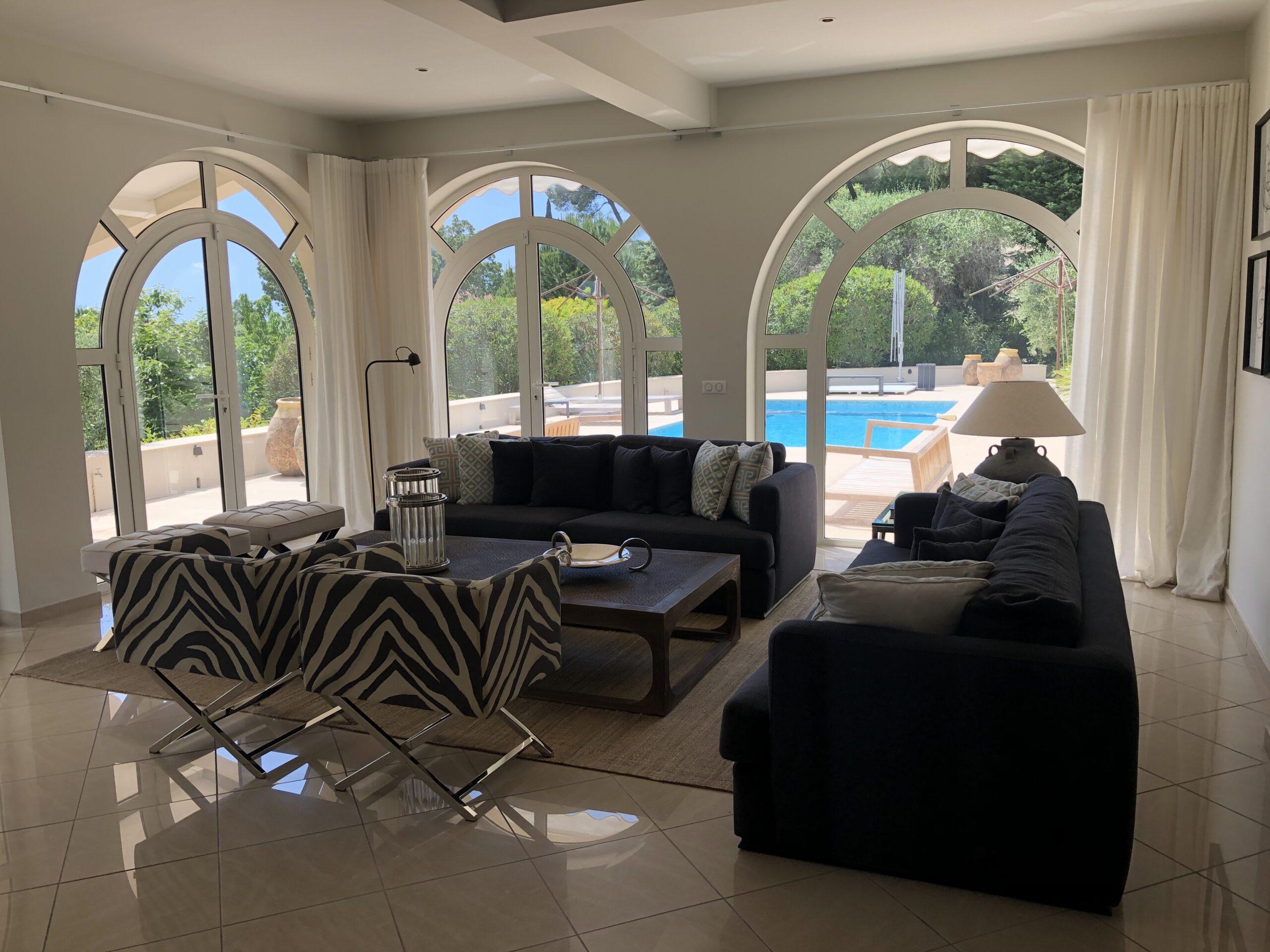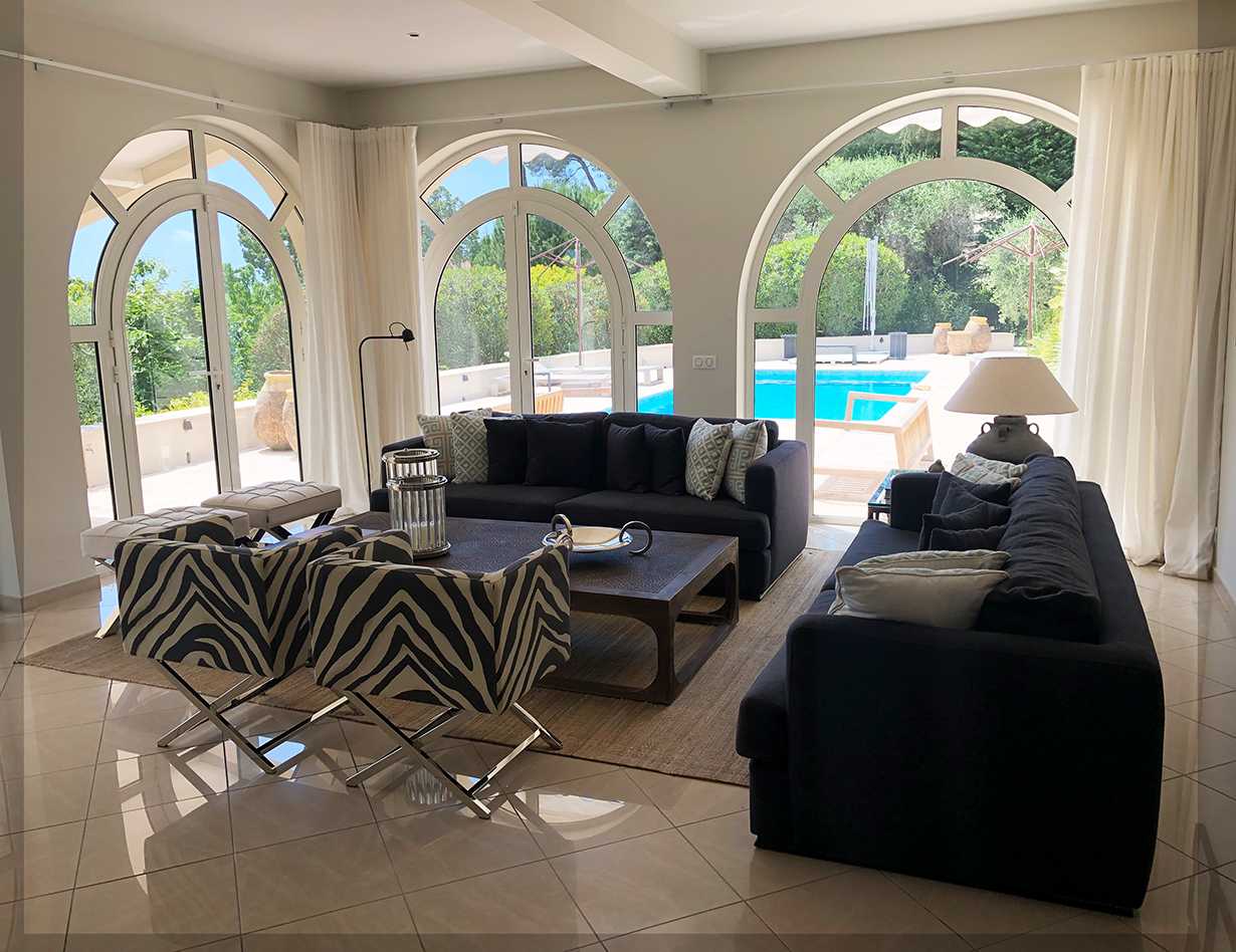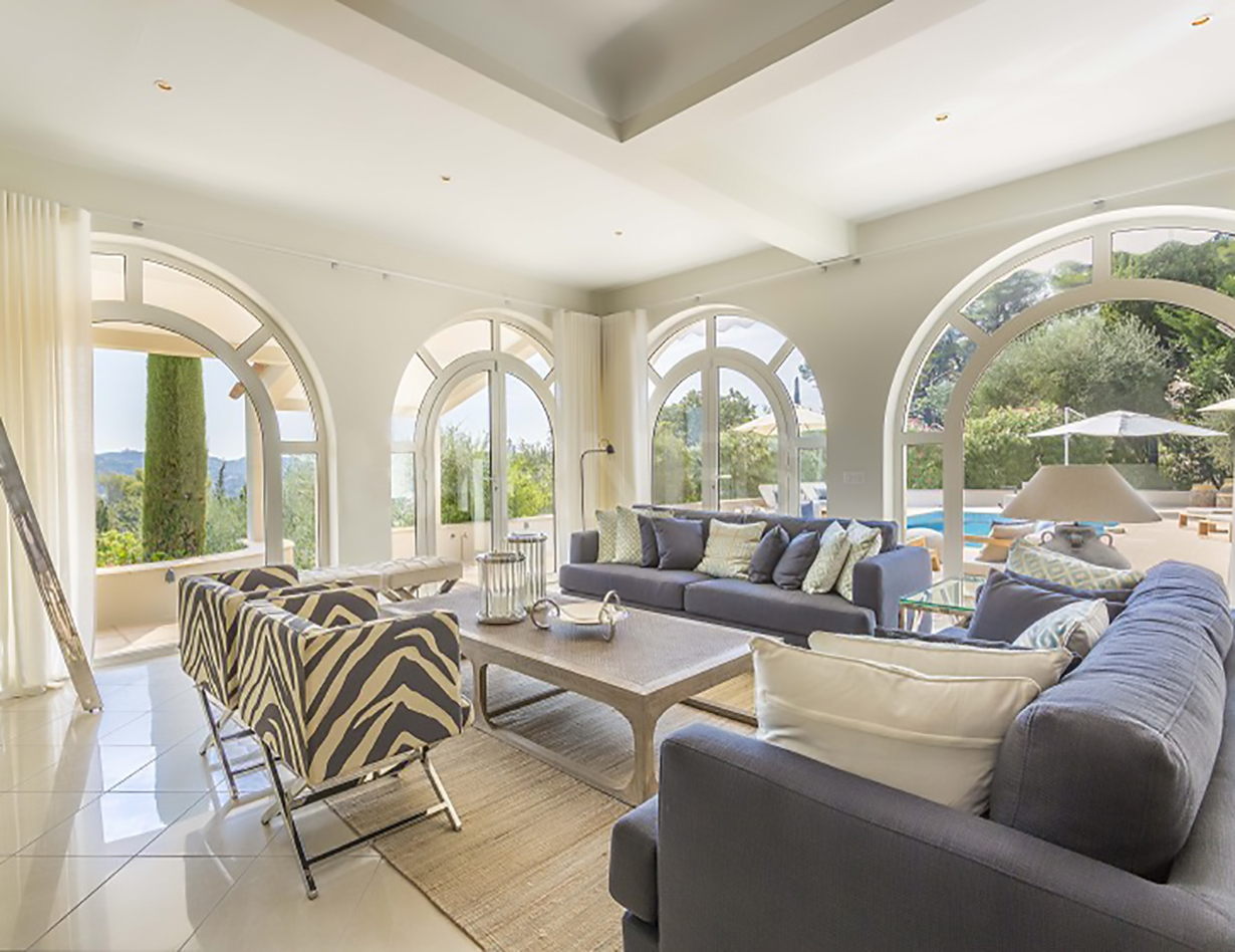 Gemütliche Wohnebene mit Blick auf den Pool lädt im Ferienhaus in Mougins ganzjährig zum Verweilen ein