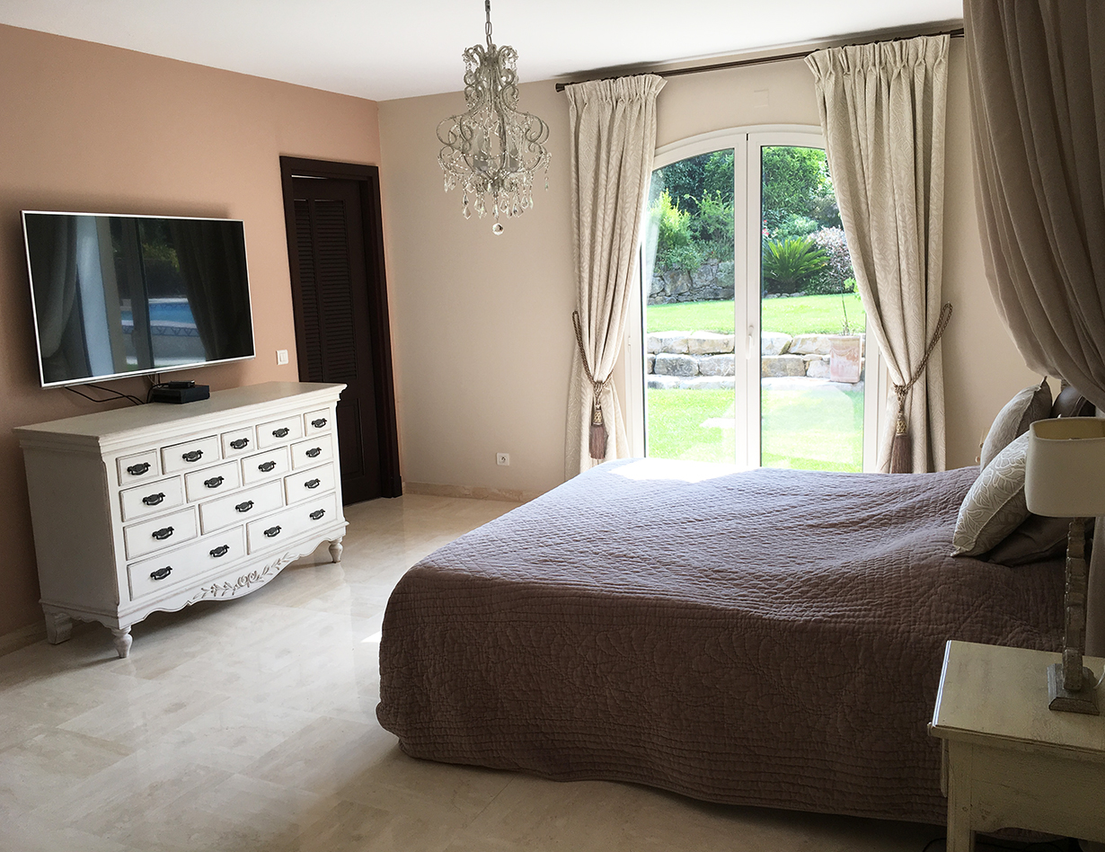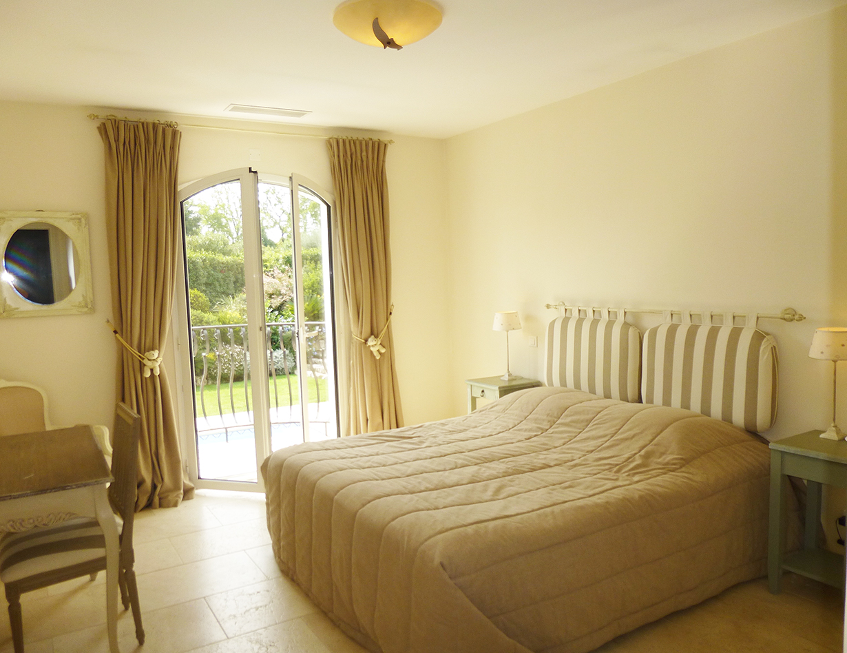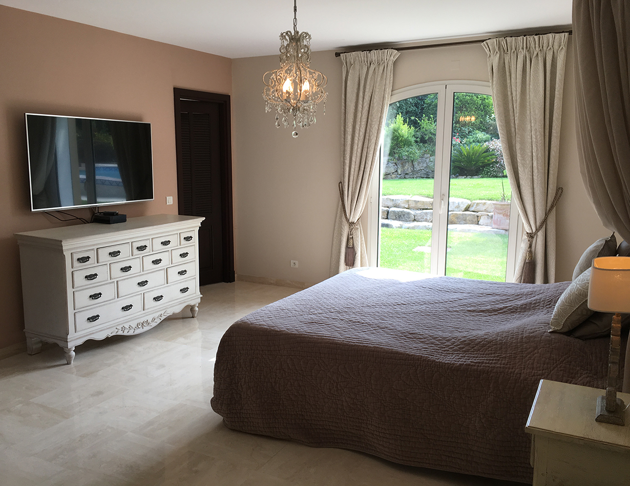 Gartenebene, luxuriöse große Mustersuite mit großem Doppelbett, mit ensuite Badezimmer mit Dusche und großer Badewanne, WC. Sep. Dressing. AC. Austritt zu den Terrassen und zum Pool.