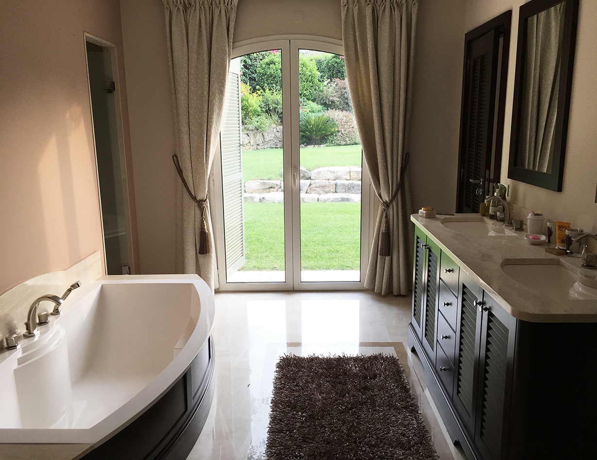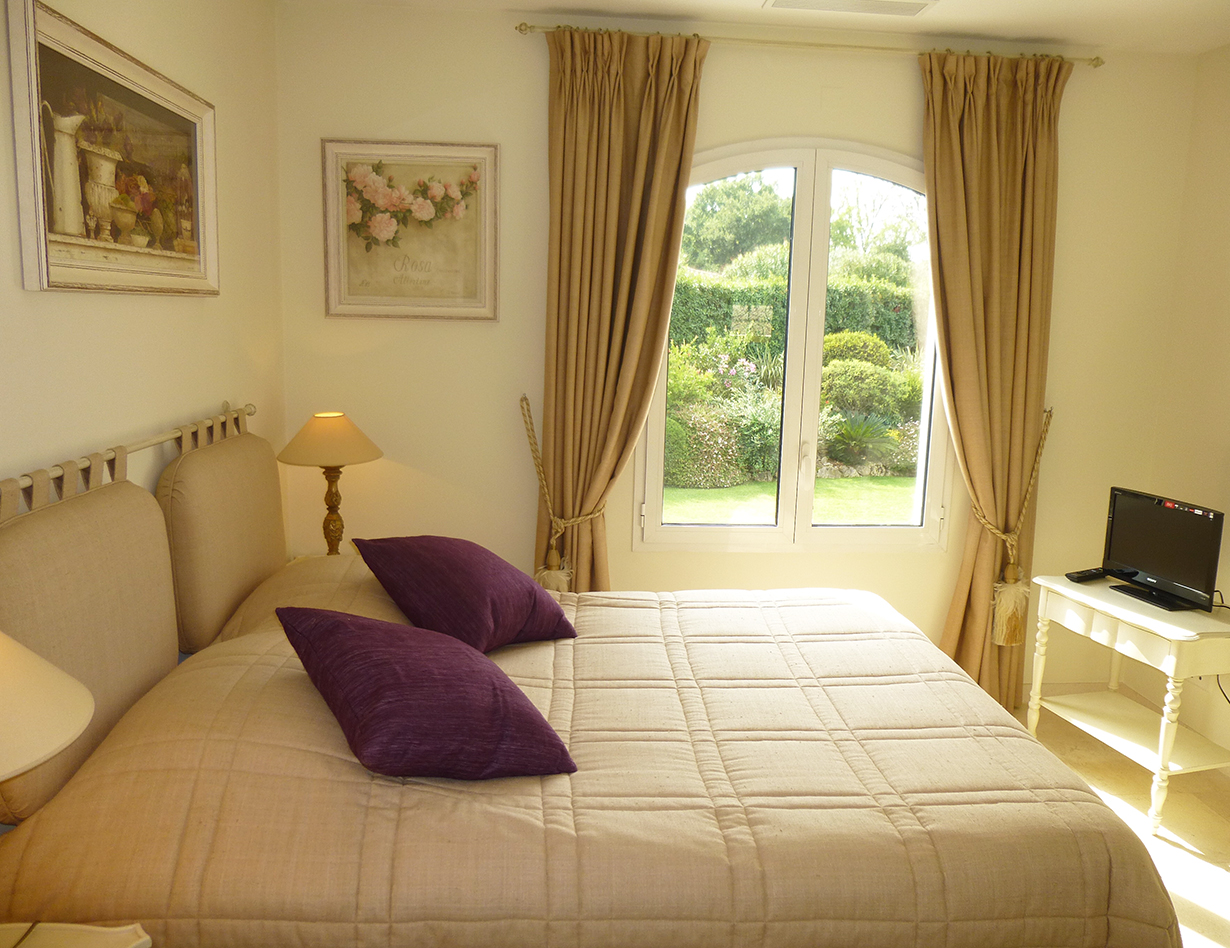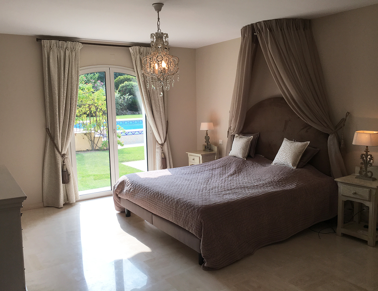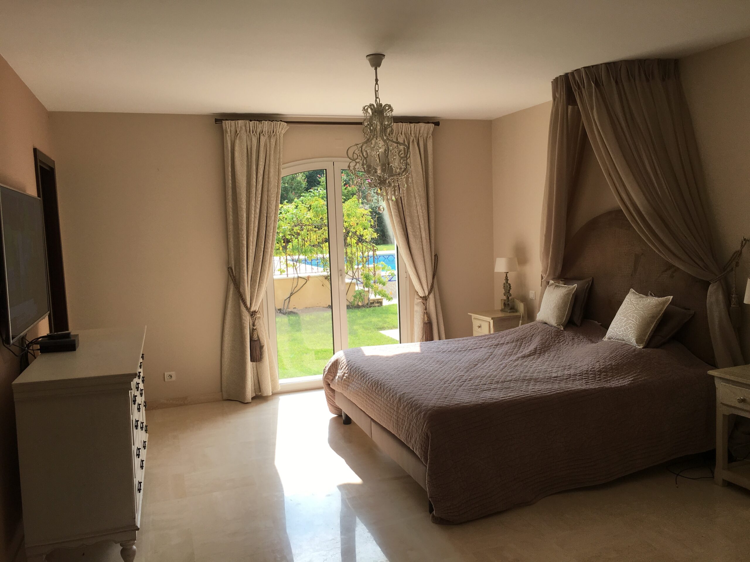 Gartenebene, luxuriöse große Mustersuite mit großem Doppelbett, mit ensuite Badezimmer mit Dusche und großer Badewanne, WC. Sep. Dressing. AC. Austritt zu den Terrassen und zum Pool.