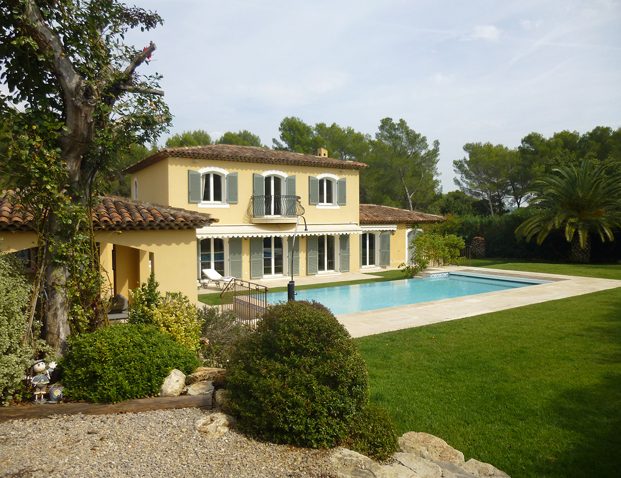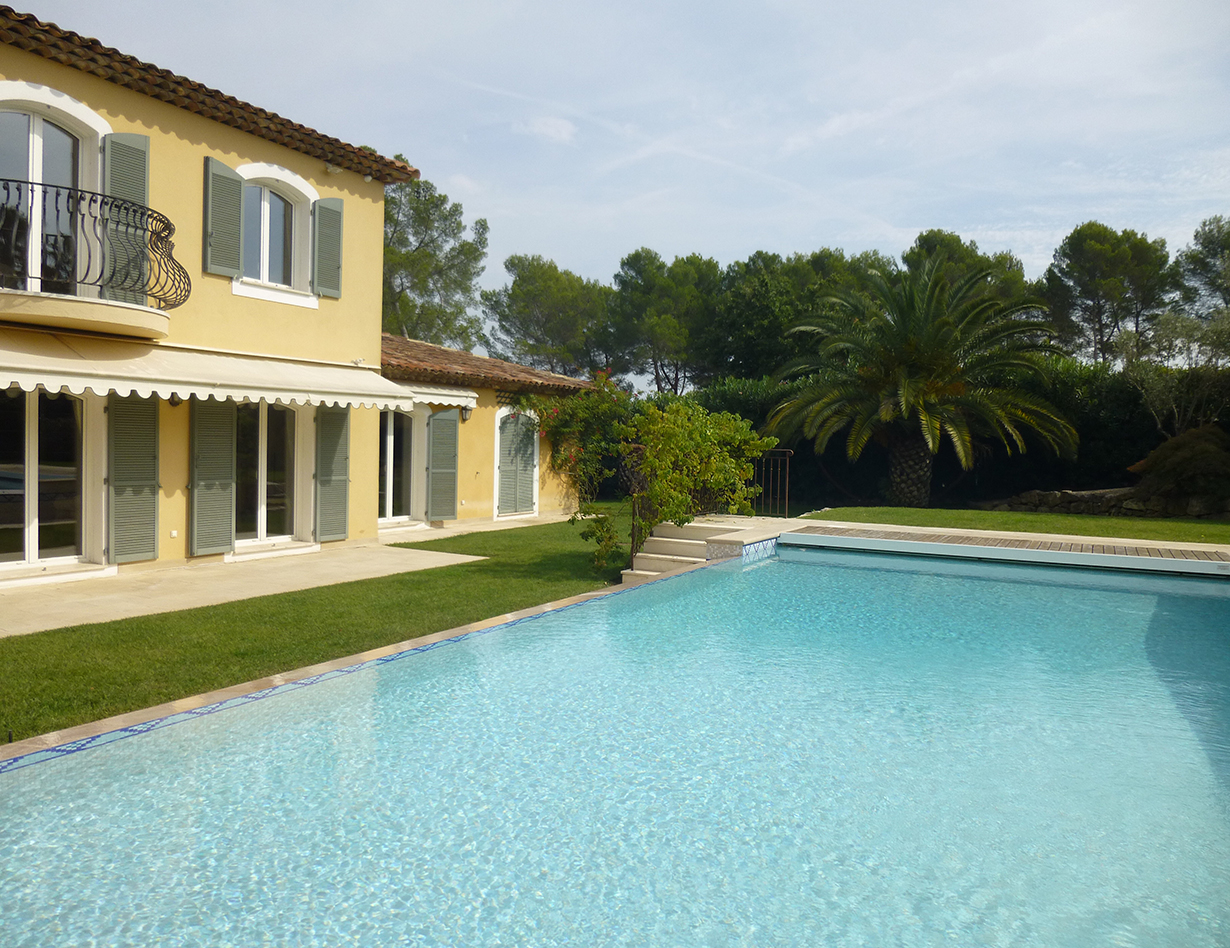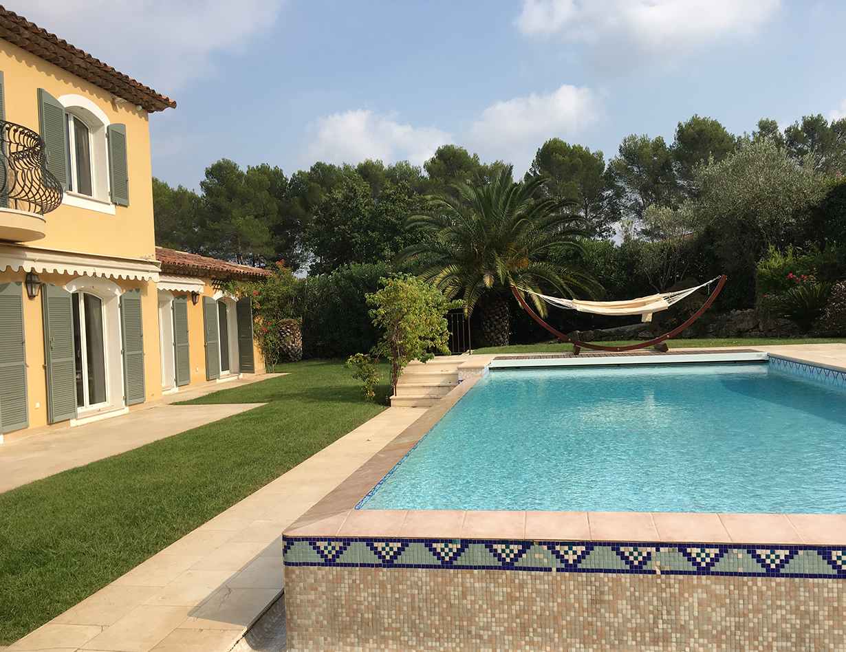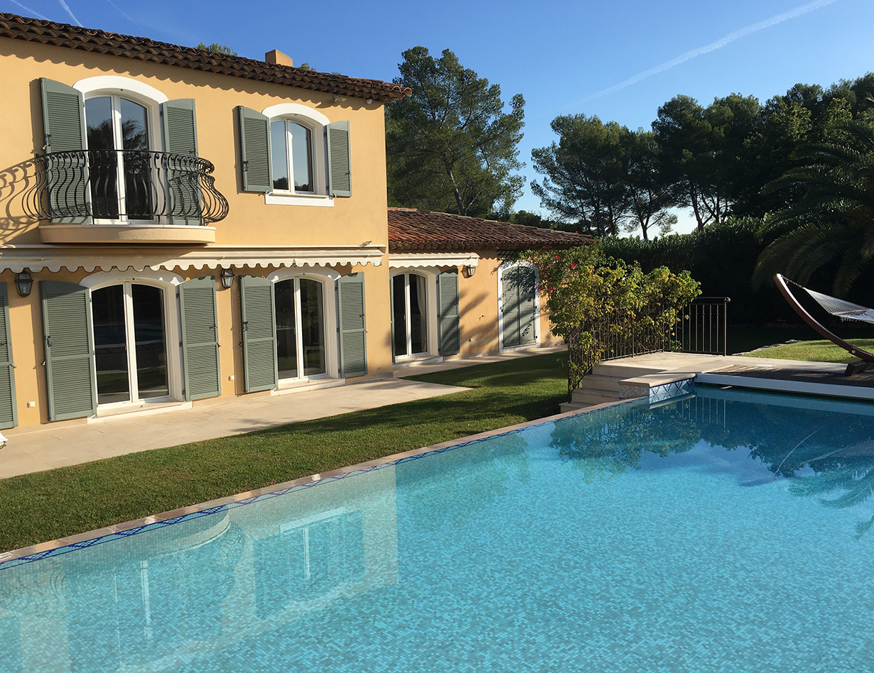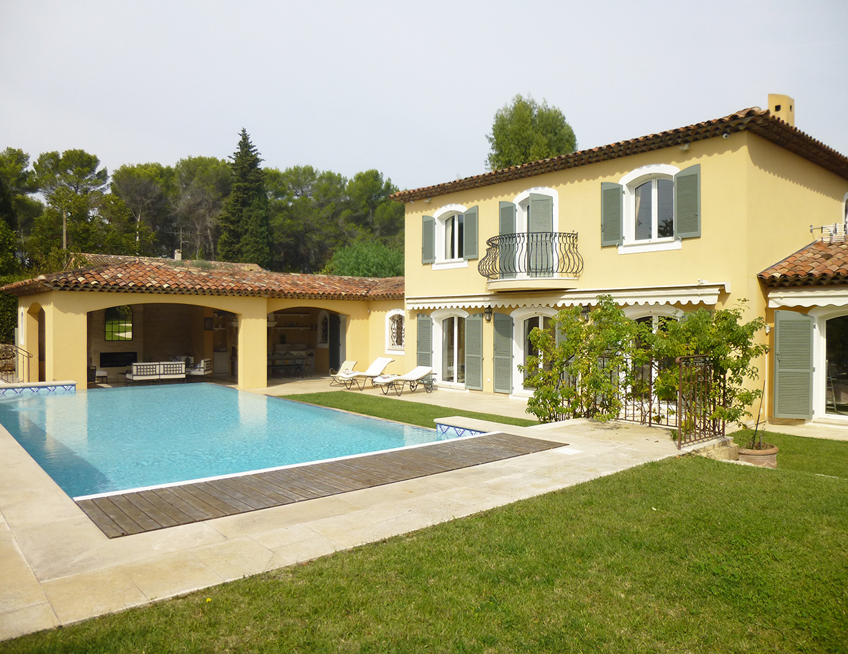 Sehr exklusive Adresse! In der geschlossenen Domain mit luxuriösen Villen, nah zu Cannes, steht diese wunderbare große exklusive neue Villa. Das sehr schöne Objekt verfügt über 4 luxuriöse große Schlafzimmer, davon eine sehr große Suite mit Dressing und großem Badezimmer auf der Gartenebene, eine weitere Suite im OG und zwei komfortable große Schlafzimmer, 1 Kinder-/Jugendzimmer im UG kann ggfs dazu benutz werden (ohne Fenster), 4 schöne Bäder. Eine edle große und sehr gut ausgestattete Designer-Küche (Geräte Miele) mit sep. Wirtschaftsraum, großes schickes Wohn-Eßzimmer mit einem herrlichen großen Kamin und TV. Austritt direkt zu den Terrassen und dem wunderschönen Garten mit großem Pool und vielen komfortablen Gartenmöbeln. Ein Traum ist der Außen-Sommerwohnbereich mit den gemütlichen Loungemöbeln und Sofas, der großen Sommerküche mit großem Gas-BBQ – einfach ein herrlicher Platz zum Relaxen. Pizzaofen im Garten (Holzkohle). Das Haus ist technisch auf einem sehr hohen Standard und mit sehr luxuriösen Materialien und Möbeln ausgestattet, mehrere TVs, großer TV-Video-Bereich im UG, klimatisierte Schlafbereiche, alles sehr sehr gepflegt. Der Garten ist liebevoll angelegt und gepflegt. Elektrisches Tor, mehrere Parkplätze auf dem Grundstück. Ein Haus für alle, die einen hohen Anspruch an gehobene Ausstattung und hohe Qualität haben in edlem Ambiente.