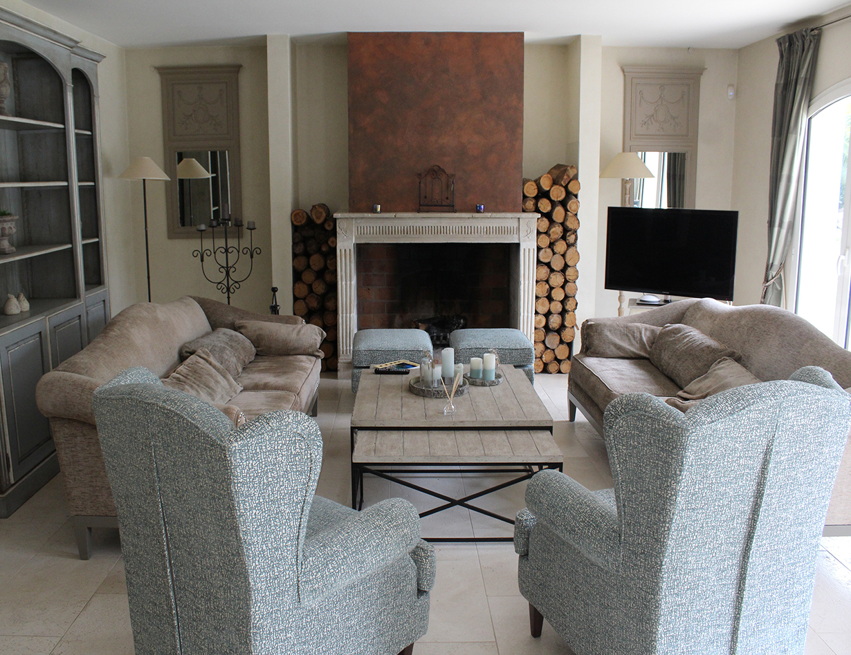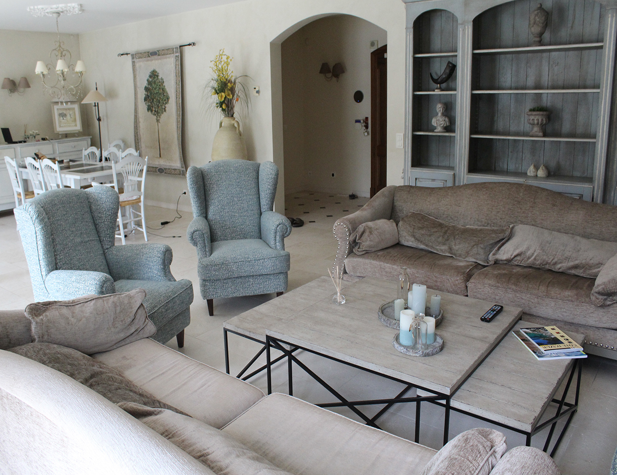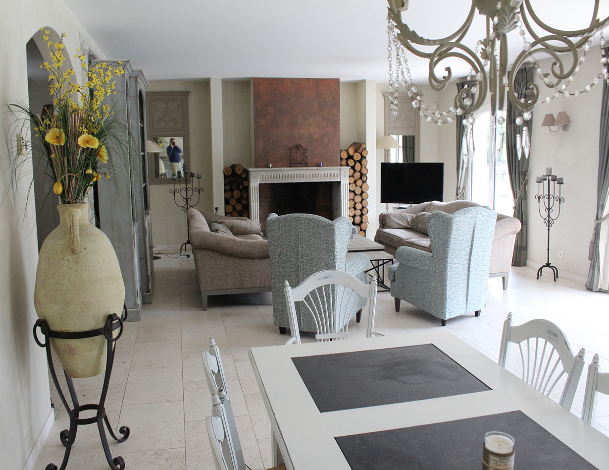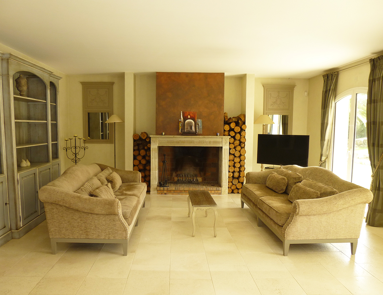 Großer Wohn-Eßbereich mit gemütlichen Sofas, luxuriöser Ausstattung, Marmorböden. Kamin. Austritt zum Garten und Pool. Tv in fast alles Schlafzimmern. Und es gibt zudem noch einen tollen großen TV-Spielraum!