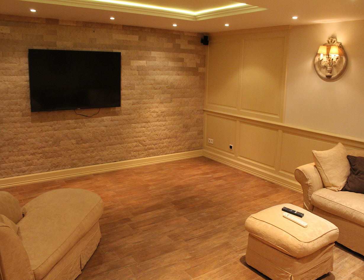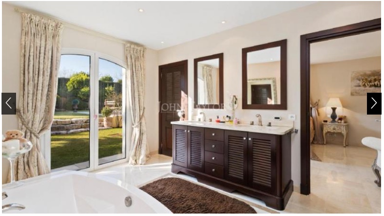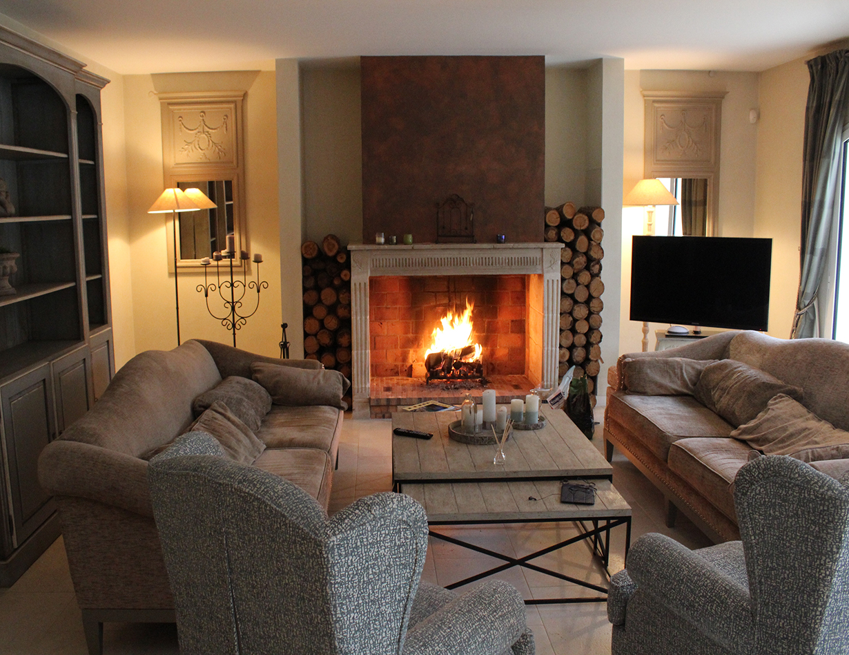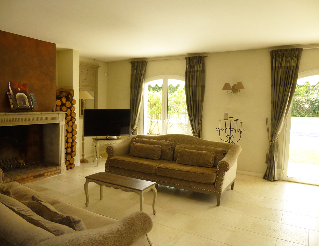 Großer Wohn-Eßbereich mit gemütlichen Sofas, luxuriöser Ausstattung, Marmorböden. Kamin. Austritt zum Garten und Pool. Tv in fast alles Schlafzimmern. Und es gibt zudem noch einen tollen großen TV-Spielraum!