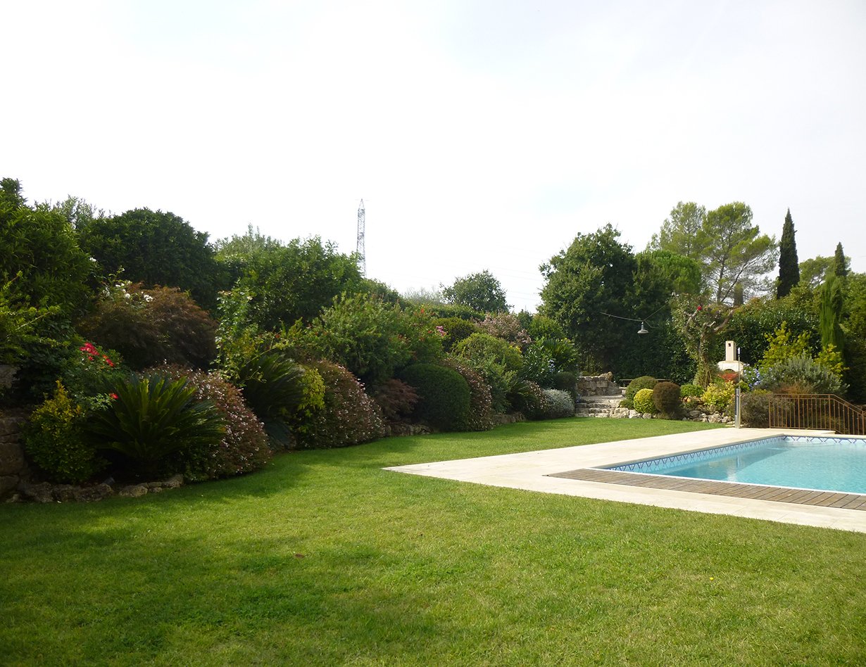 Ca. 3000 m2 schönes Grundstück, sehr gepflegter gezäunter Garten, flach mit Rasenfläche und herrlich angelegt mit mediterranen Pflanzen.