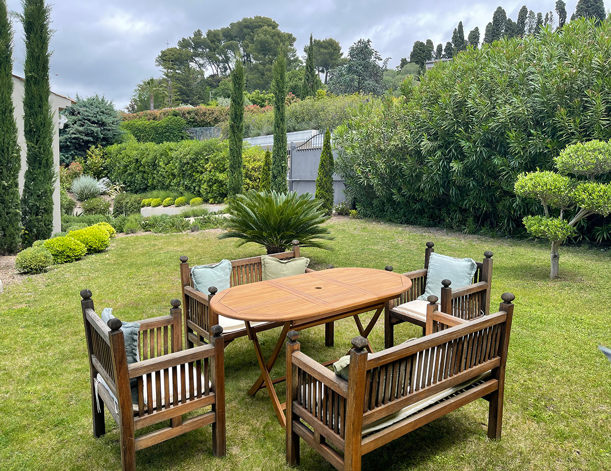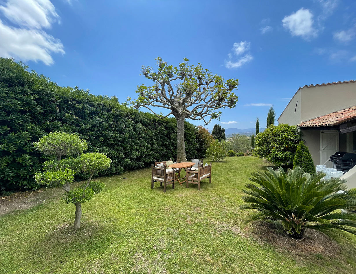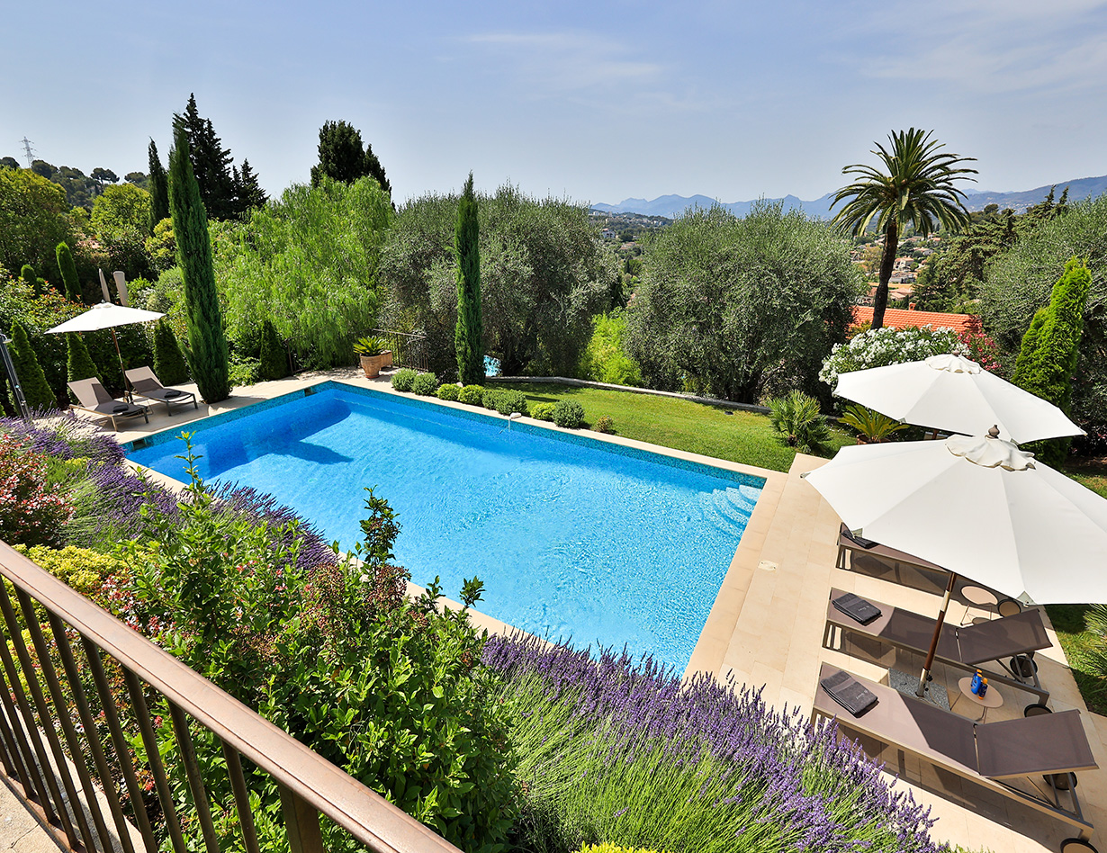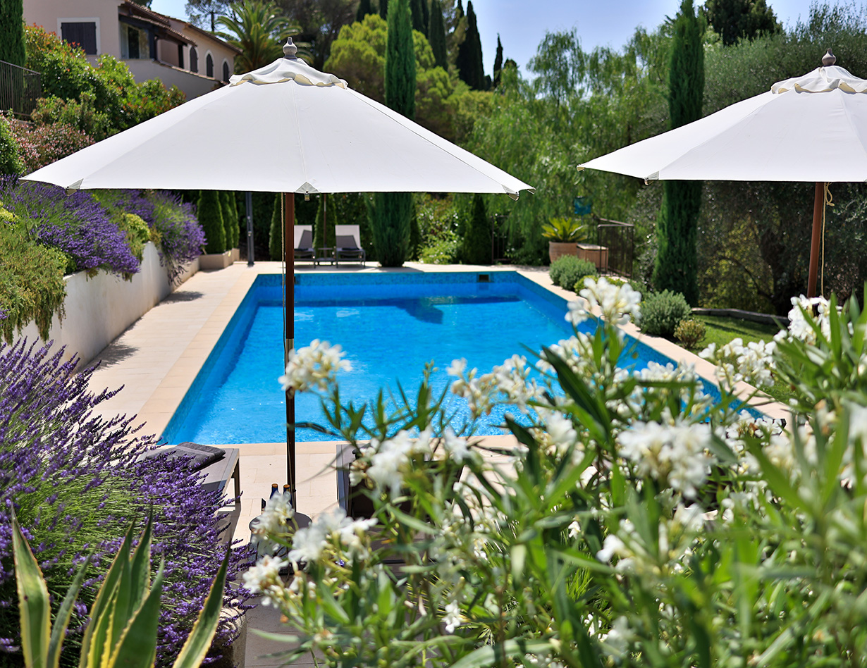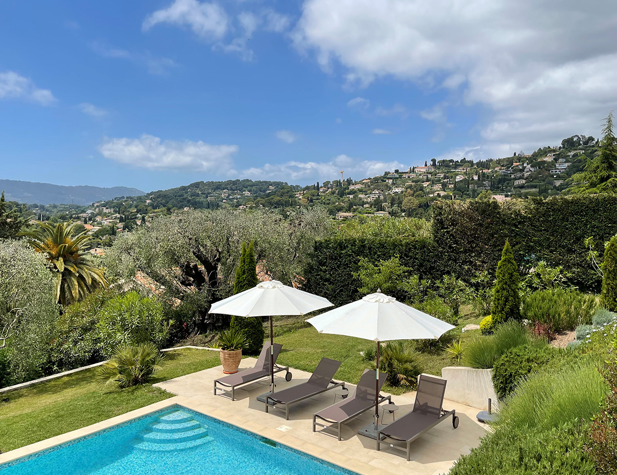 Die stilvoll eingerichtete und umfassend renovierte Luxusvilla verfügt über drei komfortable Schlafzimmer mit Doppelbetten sowie zwei Badezimmer und ebenfalls zwei separate WCs. Die luxuriöse Wohnebene mit schickem Kamin und direktem Anschluss an die Terrasse und den großzügigen Garten befindet sich auf der gleichen Ebene wie die hervorragend ausgestattete Küche, von der aus man ebenso direkt zu einer weiteren Terrasse mit großem Esstisch gelangt. Insgesamt stehen Ihnen in der Villa «VINCENT» in Mougins drei unterschiedliche Essplätze für jeweils mindestens sechs Personen zur Verfügung: auf der Ostseite des Gartens, wo es morgens herrlich sonnig und abends unter einer Platane angenehm schattig ist, auf der Terrasse zur Südwestseite mit ausfahrbarer Markise sowie im Haus selbst. Genießen Sie Ihre Mahlzeiten bei einem großartigen Panoramablick auf das Mittelalterstädtchen Mougins, Olivenbäume, Zypressen und das Esterel-Gebirge! Im großen Garten lädt ein eigener Pool (12,5 x 5,5 m) zum ausgiebigen Schwimmen ein, gemütliche Gartenliegen und ausreichend Sonnenschirme sind selbstverständlich ebenfalls vorhanden – ideal, um sich vollends entspannen zu können.