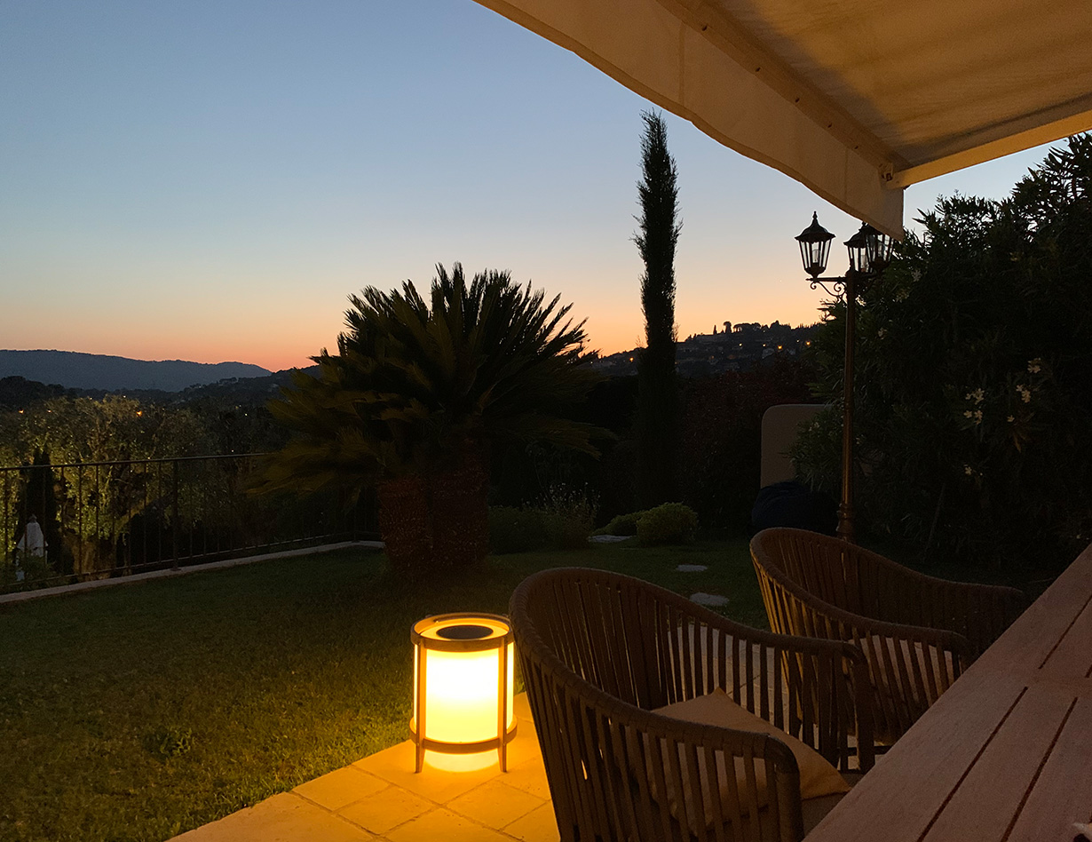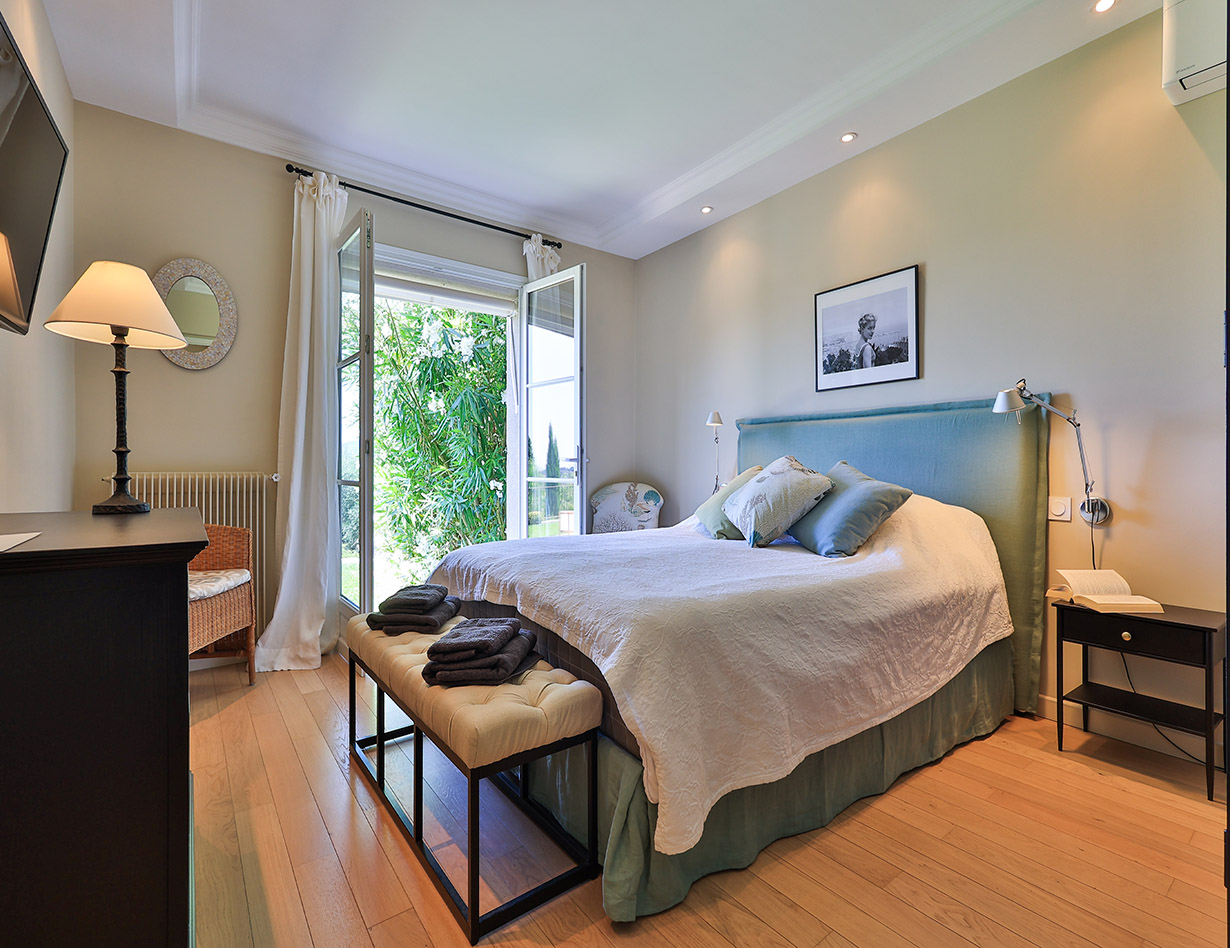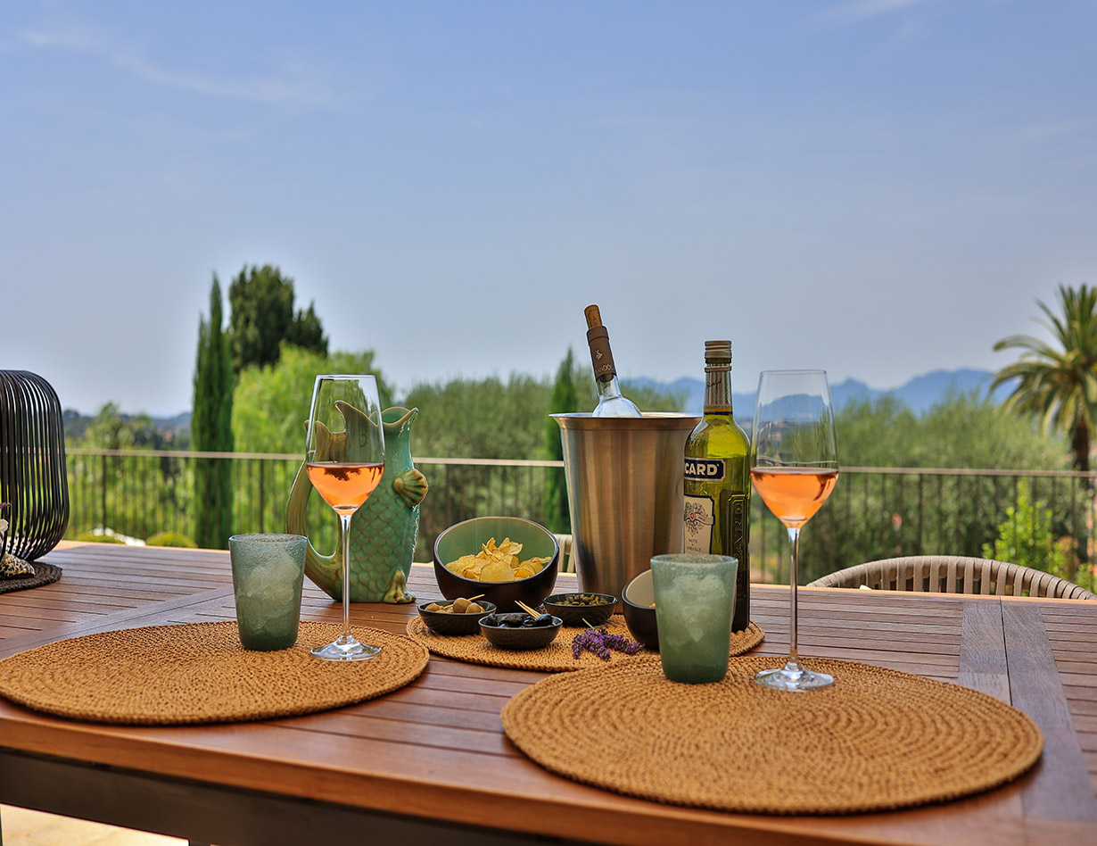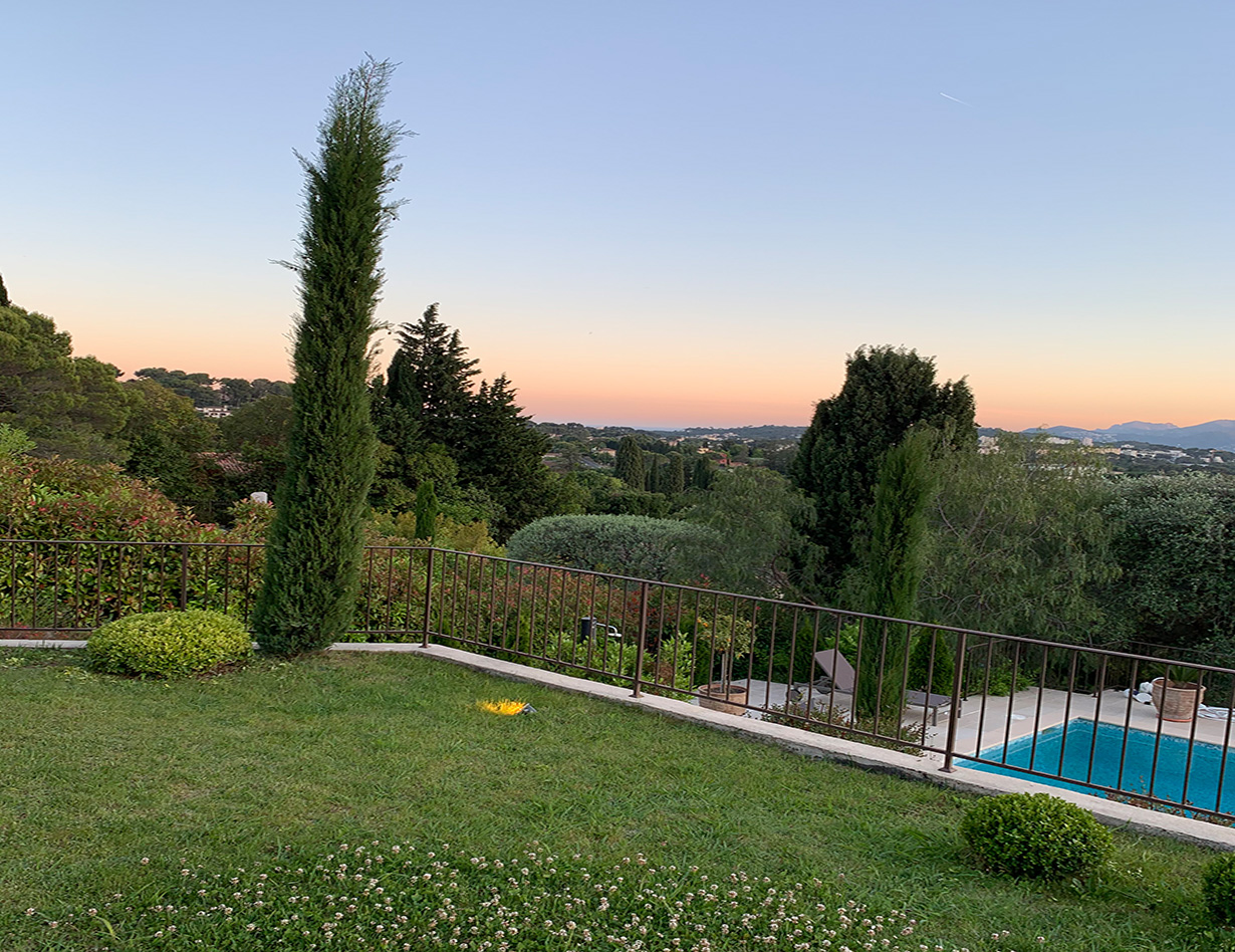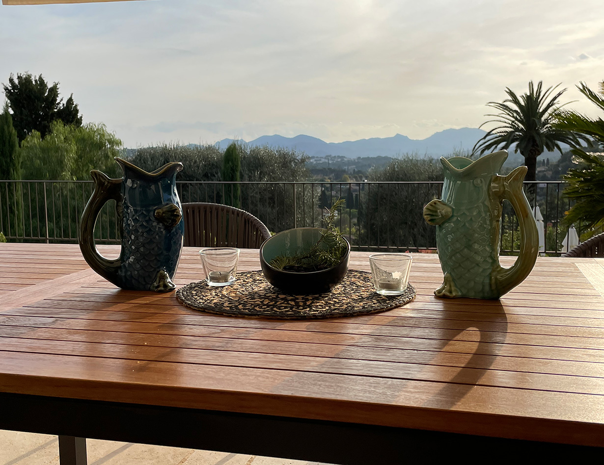 Die stilvoll eingerichtete und umfassend renovierte Luxusvilla verfügt über drei komfortable Schlafzimmer mit Doppelbetten sowie zwei Badezimmer und ebenfalls zwei separate WCs. Die luxuriöse Wohnebene mit schickem Kamin und direktem Anschluss an die Terrasse und den großzügigen Garten befindet sich auf der gleichen Ebene wie die hervorragend ausgestattete Küche, von der aus man ebenso direkt zu einer weiteren Terrasse mit großem Esstisch gelangt. Insgesamt stehen Ihnen in der Villa «VINCENT» in Mougins drei unterschiedliche Essplätze für jeweils mindestens sechs Personen zur Verfügung: auf der Ostseite des Gartens, wo es morgens herrlich sonnig und abends unter einer Platane angenehm schattig ist, auf der Terrasse zur Südwestseite mit ausfahrbarer Markise sowie im Haus selbst. Genießen Sie Ihre Mahlzeiten bei einem großartigen Panoramablick auf das Mittelalterstädtchen Mougins, Olivenbäume, Zypressen und das Esterel-Gebirge! Im großen Garten lädt ein eigener Pool (12,5 x 5,5 m) zum ausgiebigen Schwimmen ein, gemütliche Gartenliegen und ausreichend Sonnenschirme sind selbstverständlich ebenfalls vorhanden – ideal, um sich vollends entspannen zu können.