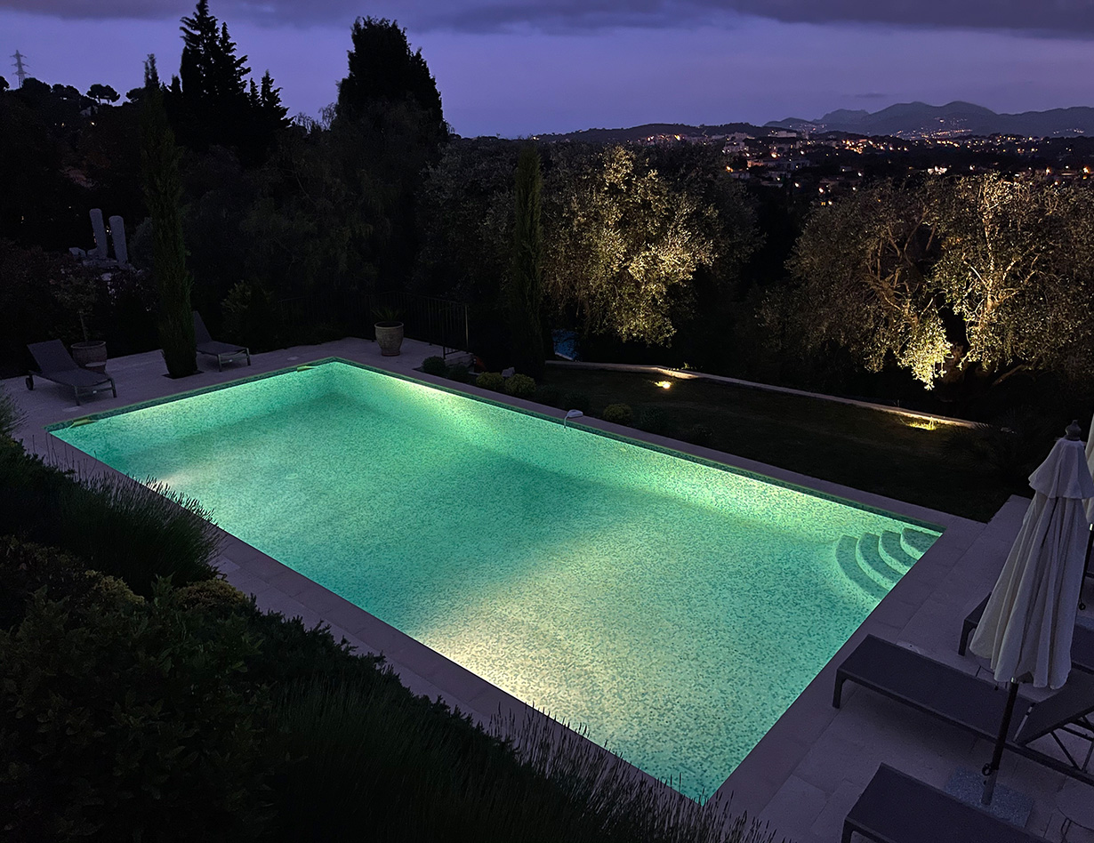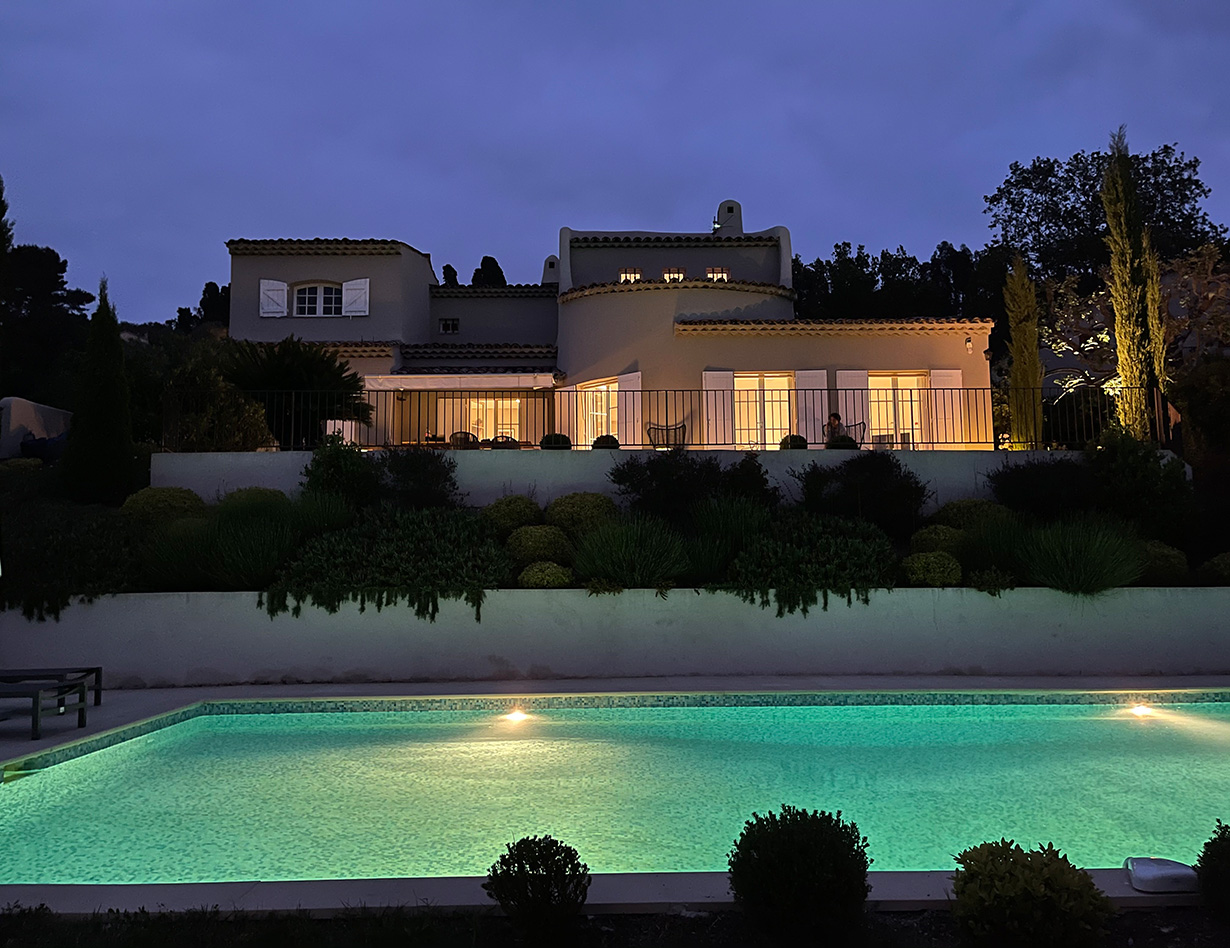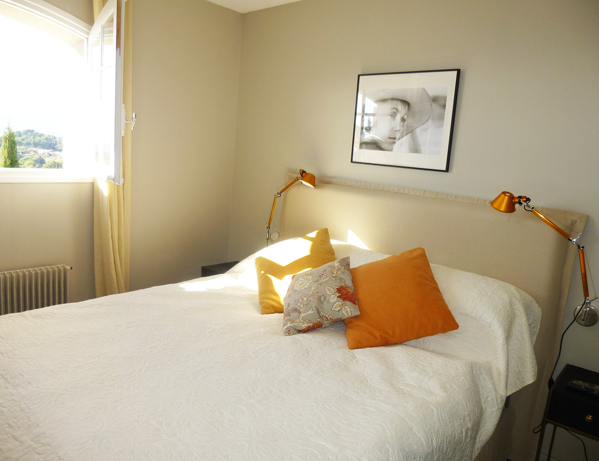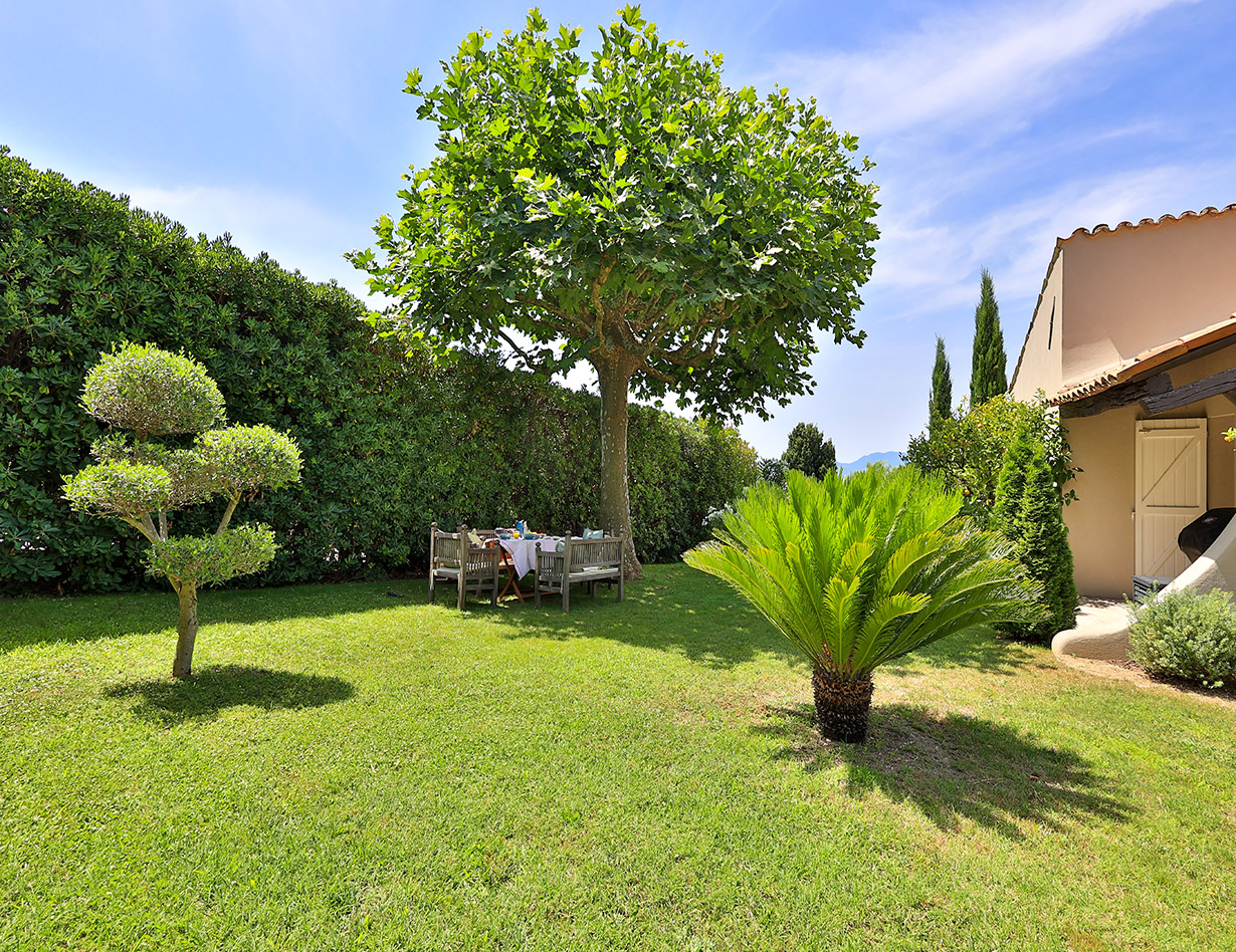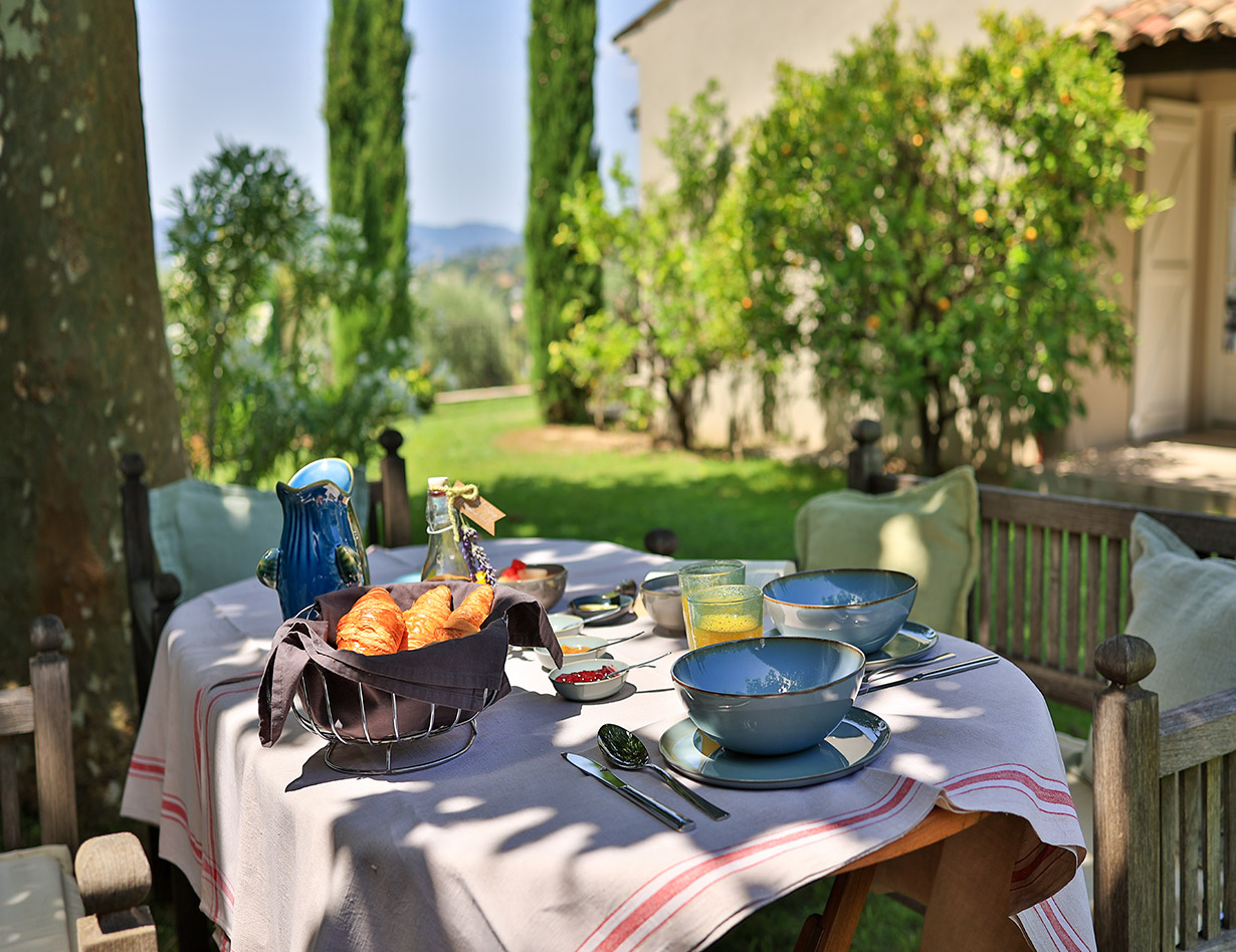 Die stilvoll eingerichtete und umfassend renovierte Luxusvilla verfügt über drei komfortable Schlafzimmer mit Doppelbetten sowie zwei Badezimmer und ebenfalls zwei separate WCs. Die luxuriöse Wohnebene mit schickem Kamin und direktem Anschluss an die Terrasse und den großzügigen Garten befindet sich auf der gleichen Ebene wie die hervorragend ausgestattete Küche, von der aus man ebenso direkt zu einer weiteren Terrasse mit großem Esstisch gelangt. Insgesamt stehen Ihnen in der Villa «VINCENT» in Mougins drei unterschiedliche Essplätze für jeweils mindestens sechs Personen zur Verfügung: auf der Ostseite des Gartens, wo es morgens herrlich sonnig und abends unter einer Platane angenehm schattig ist, auf der Terrasse zur Südwestseite mit ausfahrbarer Markise sowie im Haus selbst. Genießen Sie Ihre Mahlzeiten bei einem großartigen Panoramablick auf das Mittelalterstädtchen Mougins, Olivenbäume, Zypressen und das Esterel-Gebirge! Im großen Garten lädt ein eigener Pool (12,5 x 5,5 m) zum ausgiebigen Schwimmen ein, gemütliche Gartenliegen und ausreichend Sonnenschirme sind selbstverständlich ebenfalls vorhanden – ideal, um sich vollends entspannen zu können.