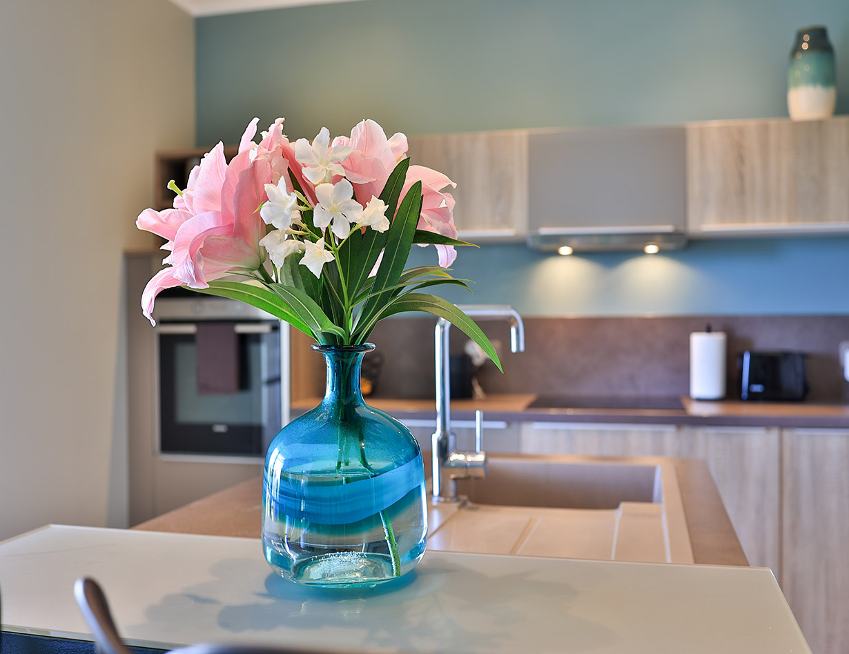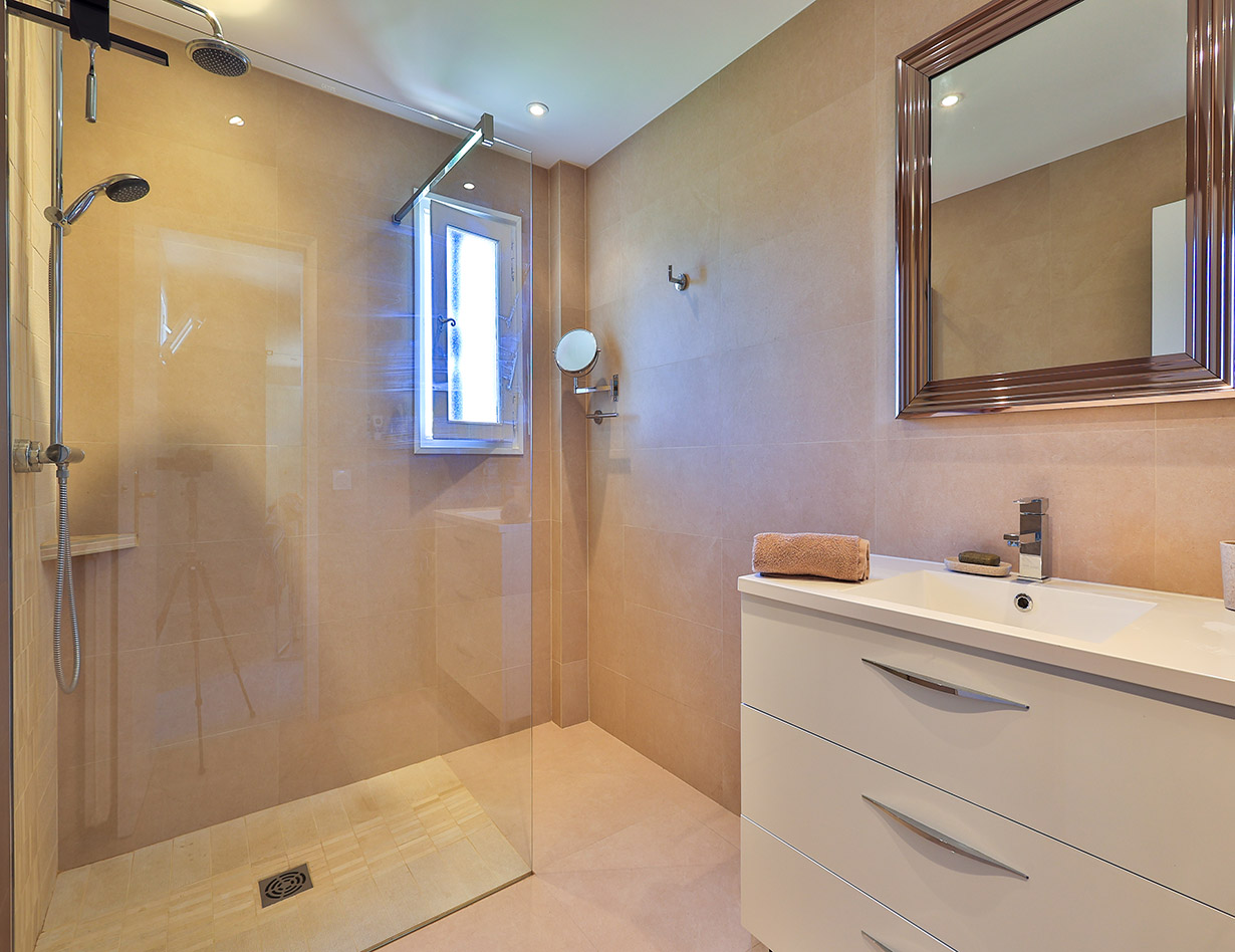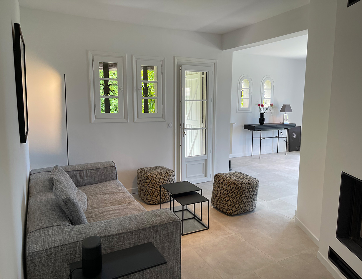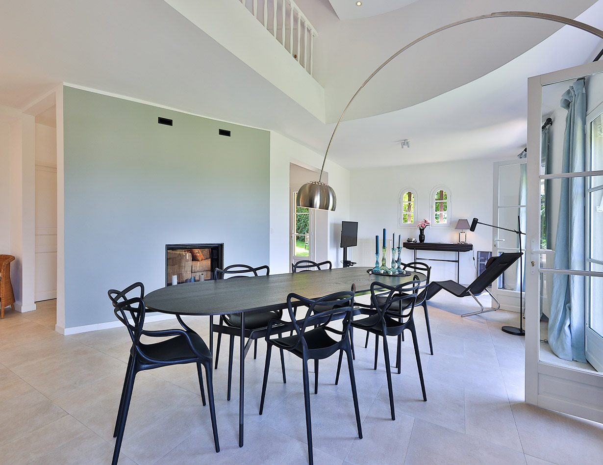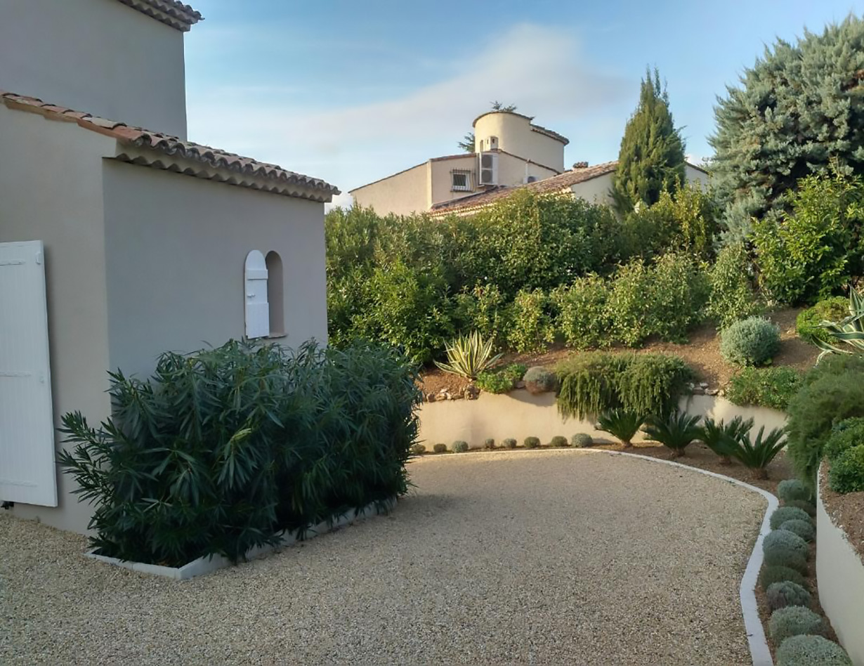 Die stilvoll eingerichtete und umfassend renovierte Luxusvilla verfügt über drei komfortable Schlafzimmer mit Doppelbetten sowie zwei Badezimmer und ebenfalls zwei separate WCs. Die luxuriöse Wohnebene mit schickem Kamin und direktem Anschluss an die Terrasse und den großzügigen Garten befindet sich auf der gleichen Ebene wie die hervorragend ausgestattete Küche, von der aus man ebenso direkt zu einer weiteren Terrasse mit großem Esstisch gelangt. Insgesamt stehen Ihnen in der Villa «VINCENT» in Mougins drei unterschiedliche Essplätze für jeweils mindestens sechs Personen zur Verfügung: auf der Ostseite des Gartens, wo es morgens herrlich sonnig und abends unter einer Platane angenehm schattig ist, auf der Terrasse zur Südwestseite mit ausfahrbarer Markise sowie im Haus selbst. Genießen Sie Ihre Mahlzeiten bei einem großartigen Panoramablick auf das Mittelalterstädtchen Mougins, Olivenbäume, Zypressen und das Esterel-Gebirge! Im großen Garten lädt ein eigener Pool (12,5 x 5,5 m) zum ausgiebigen Schwimmen ein, gemütliche Gartenliegen und ausreichend Sonnenschirme sind selbstverständlich ebenfalls vorhanden – ideal, um sich vollends entspannen zu können.