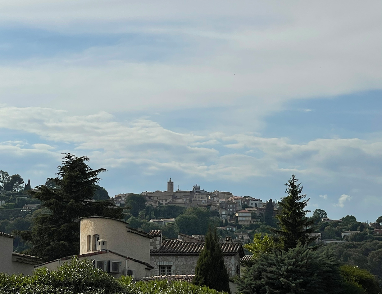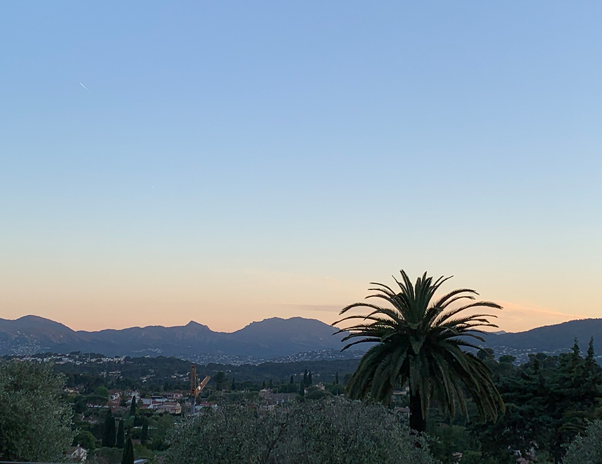 Panoramablick auf Mougins und das herrliche Esterelgebirge, kleiner Meerblick