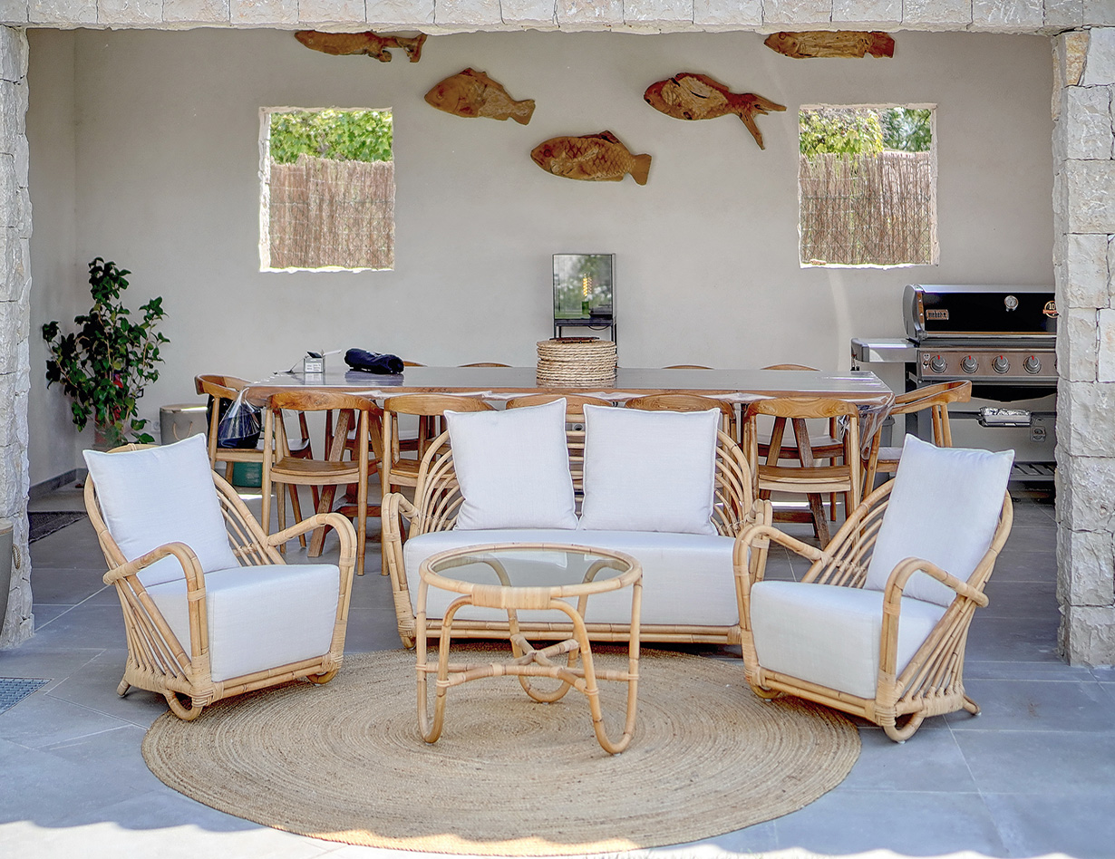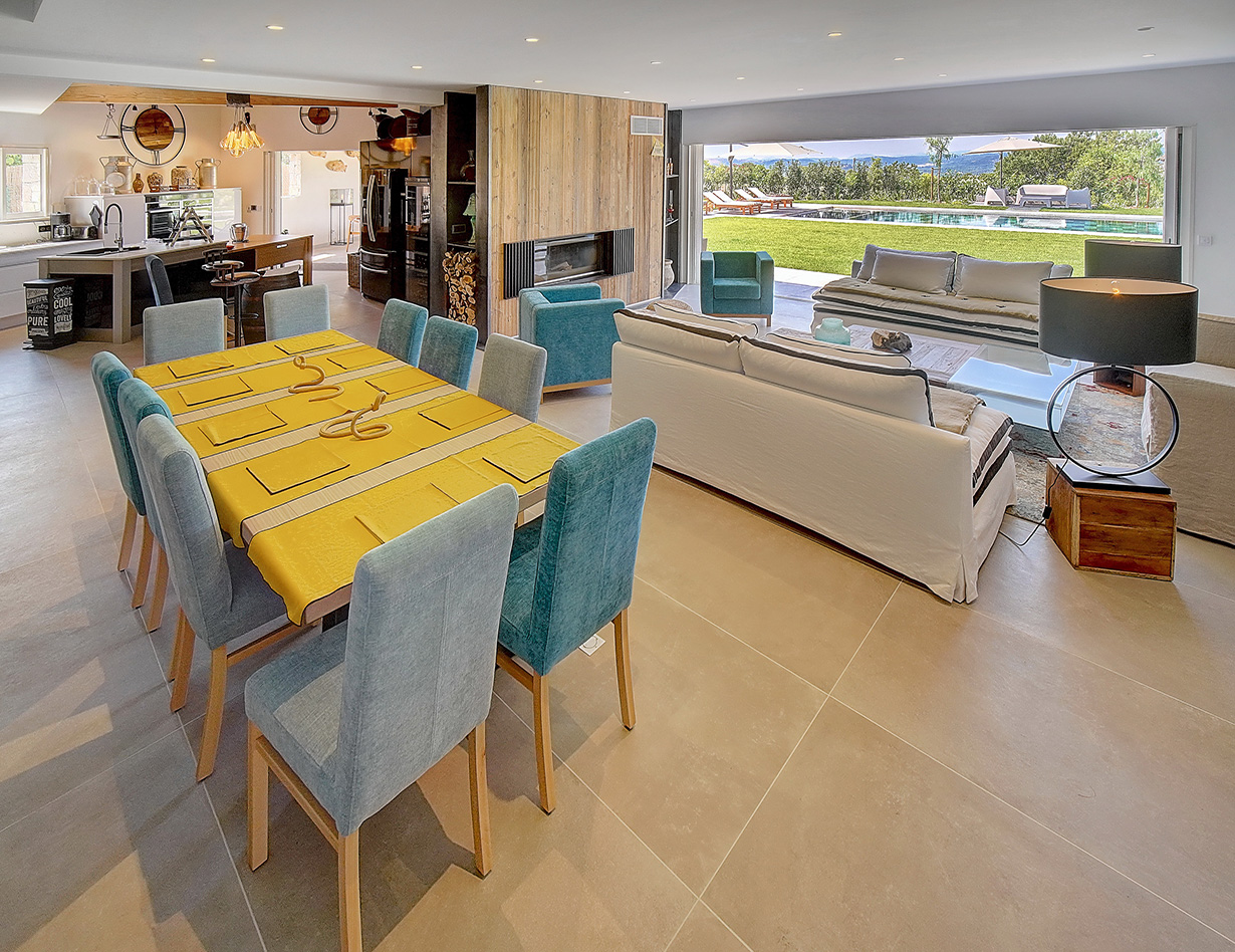 Große Terrasse vor dem Haus, auch überdacht, mit Eßtisch, Loungemöbel
