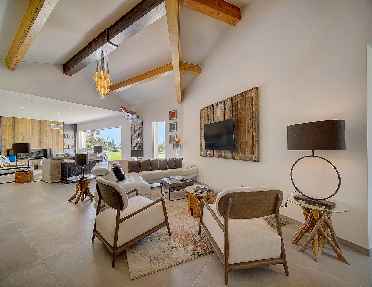 Gemütlicher Wohnbereich mit großen Sofas, Kamin, hübsch dekoriert und mit toller Kunst. TV