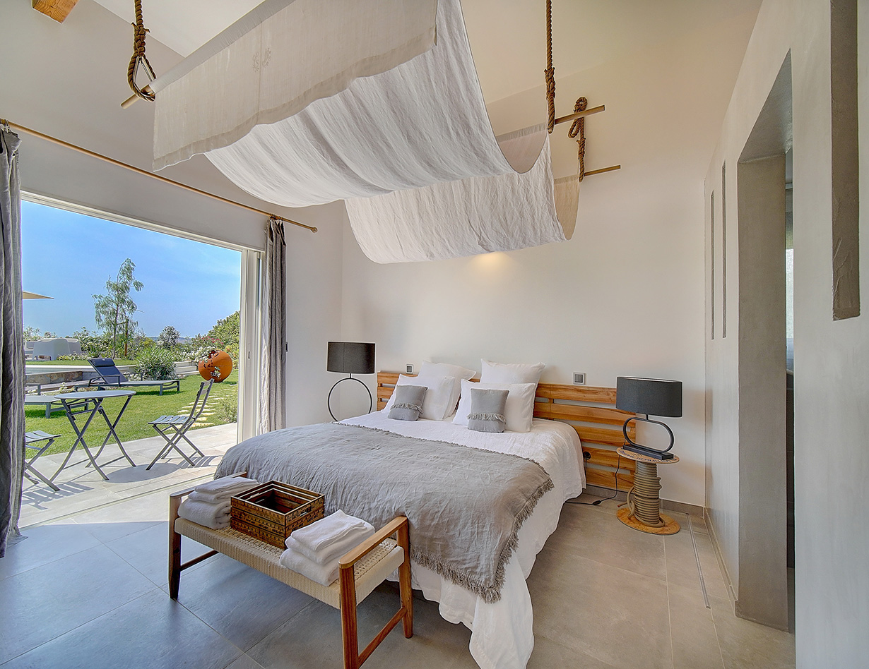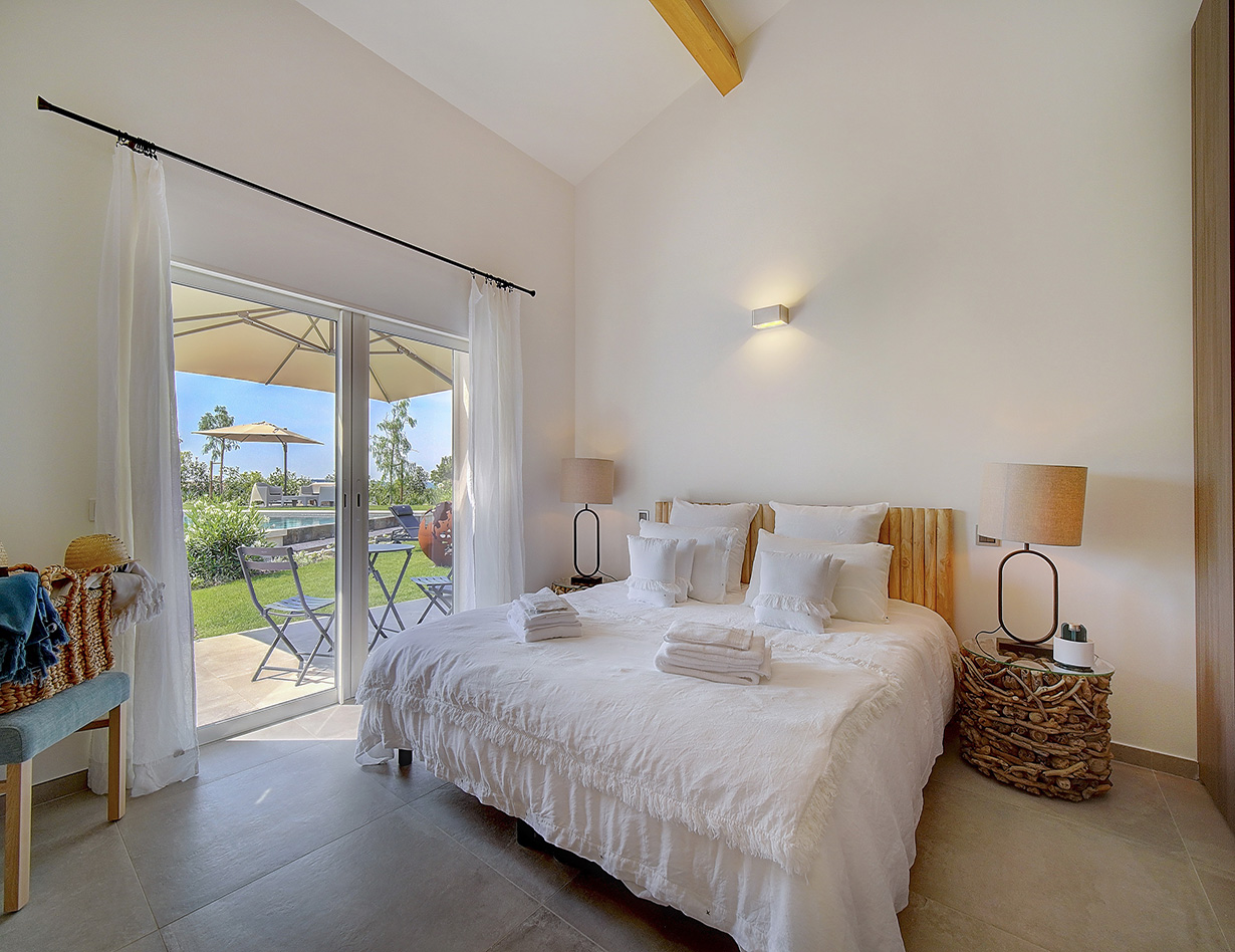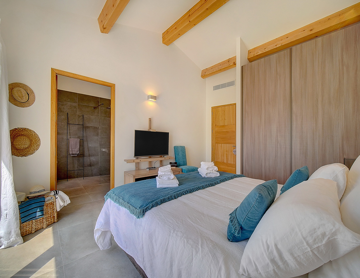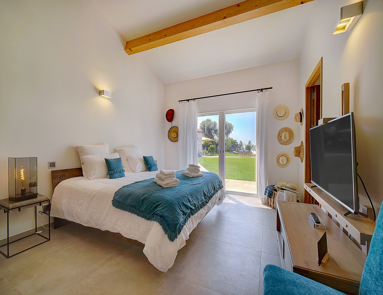 EG, großes Schlafzimmer mit großem Doppelbett, ensuite Badezimmer, TV, Austritt zur Terrasse.