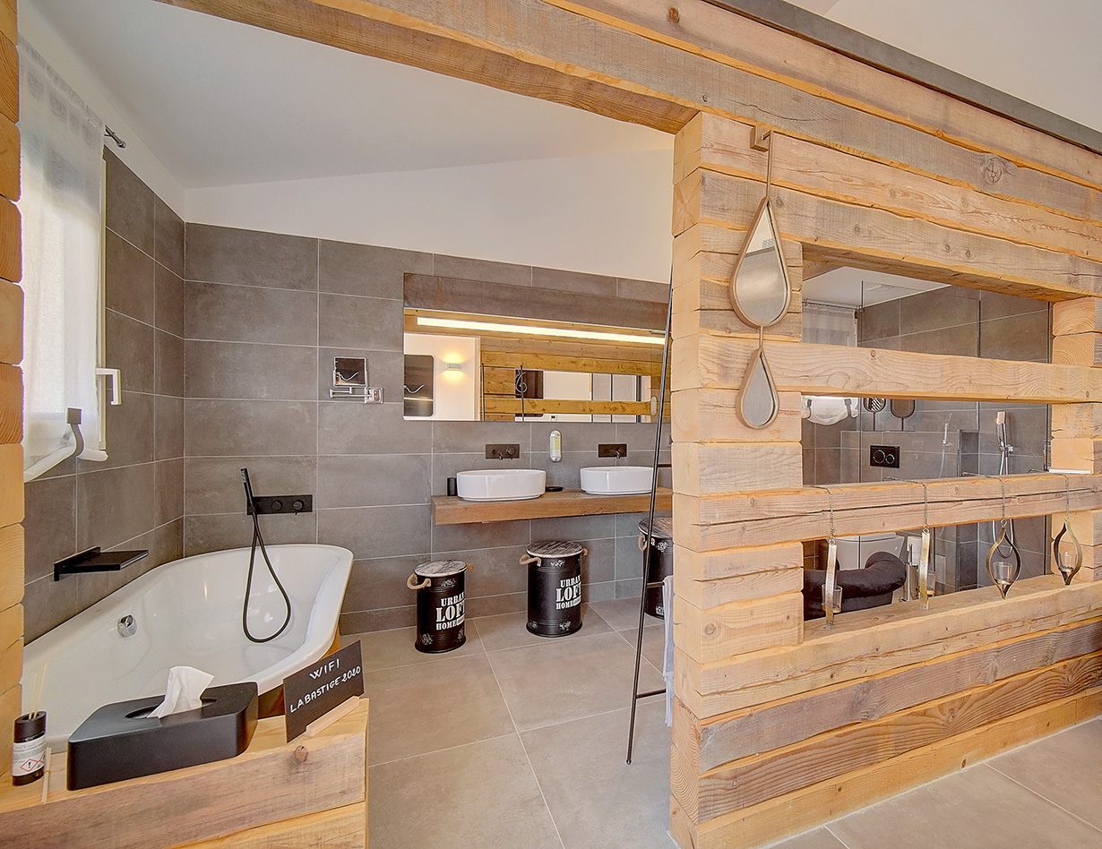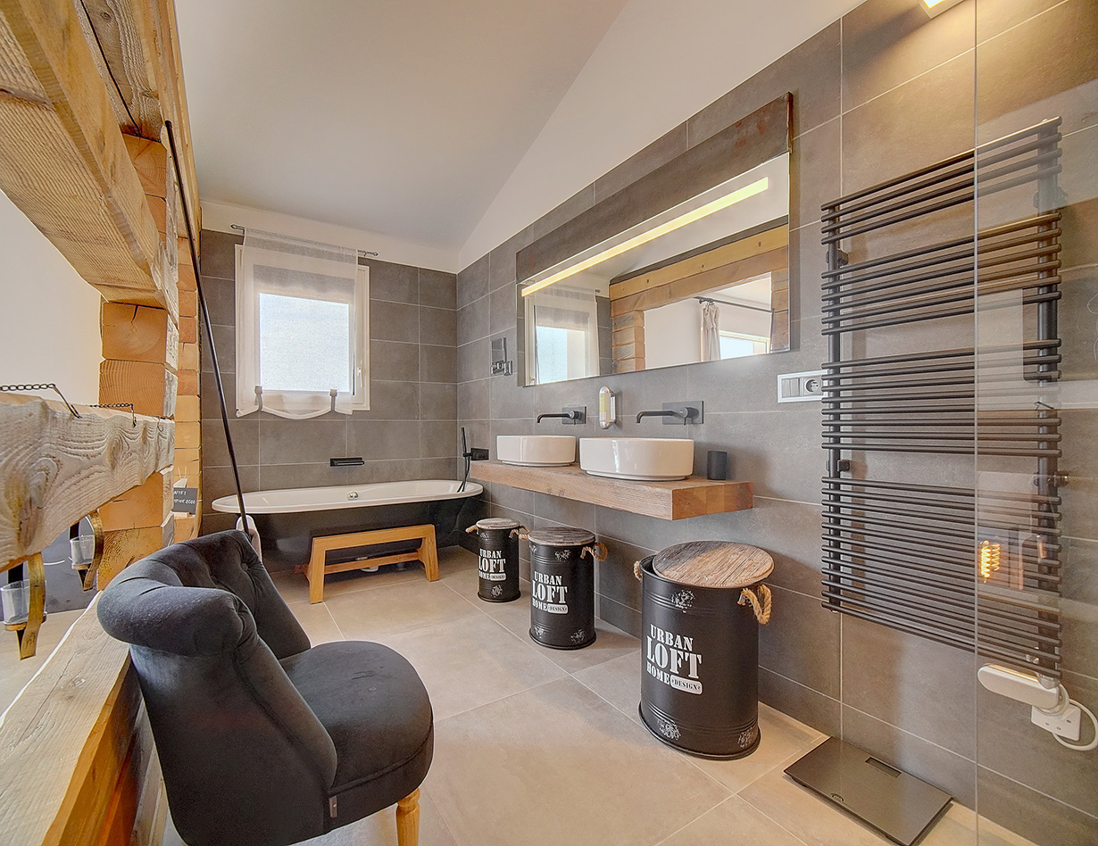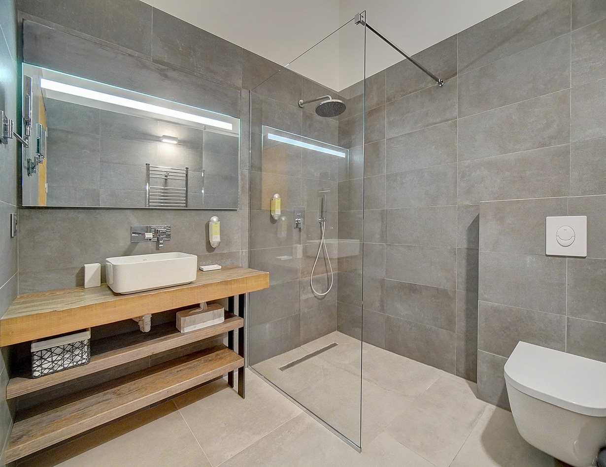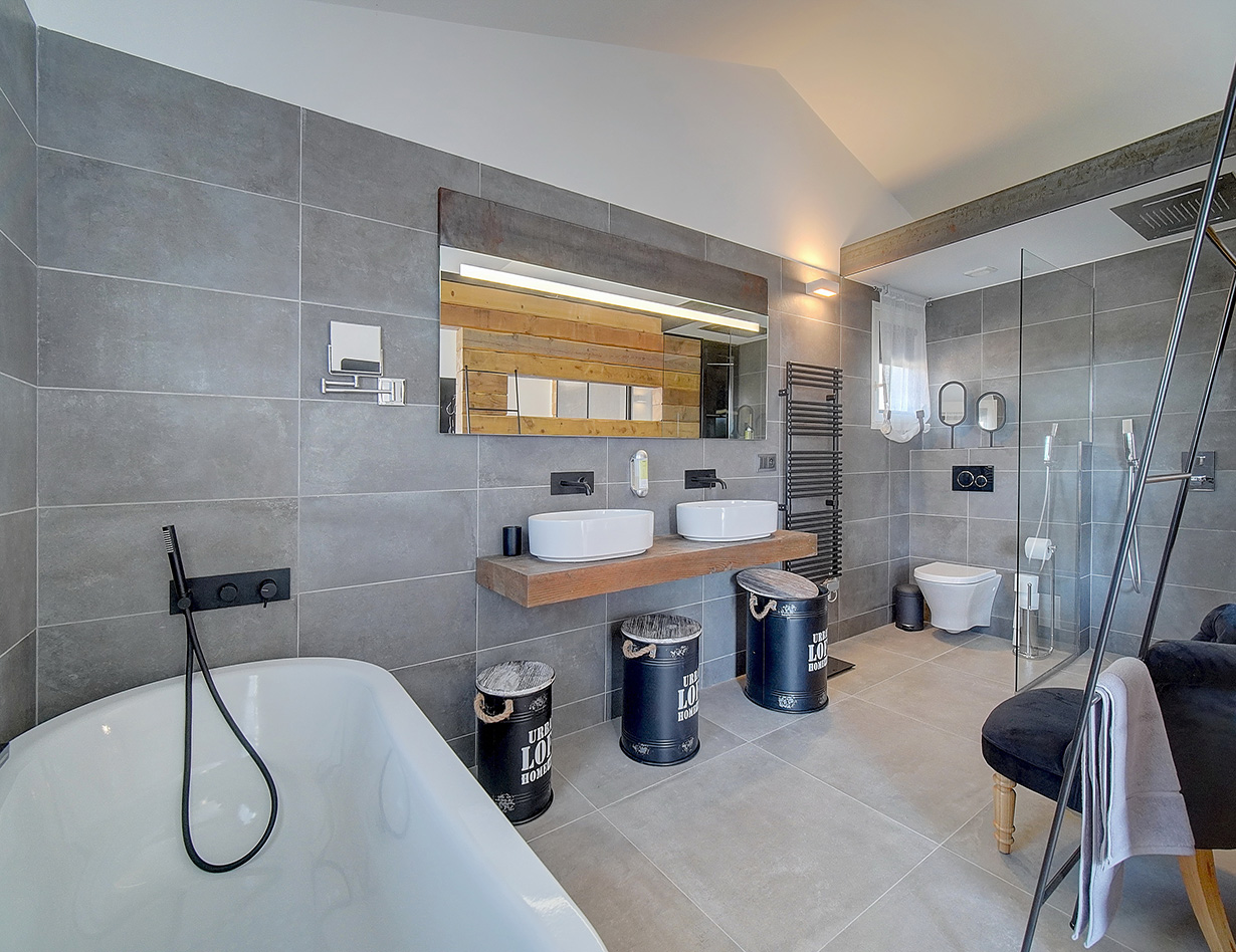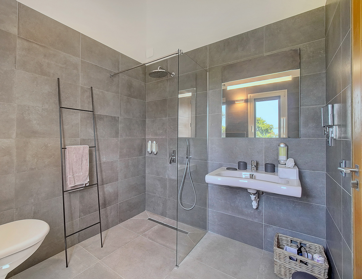 EG, großes Schlafzimmer mit großem Doppelbett, ensuite Badezimmer, TV, Austritt zur Terrasse. Dieses Zimmer ist zudem behindertengerecht.