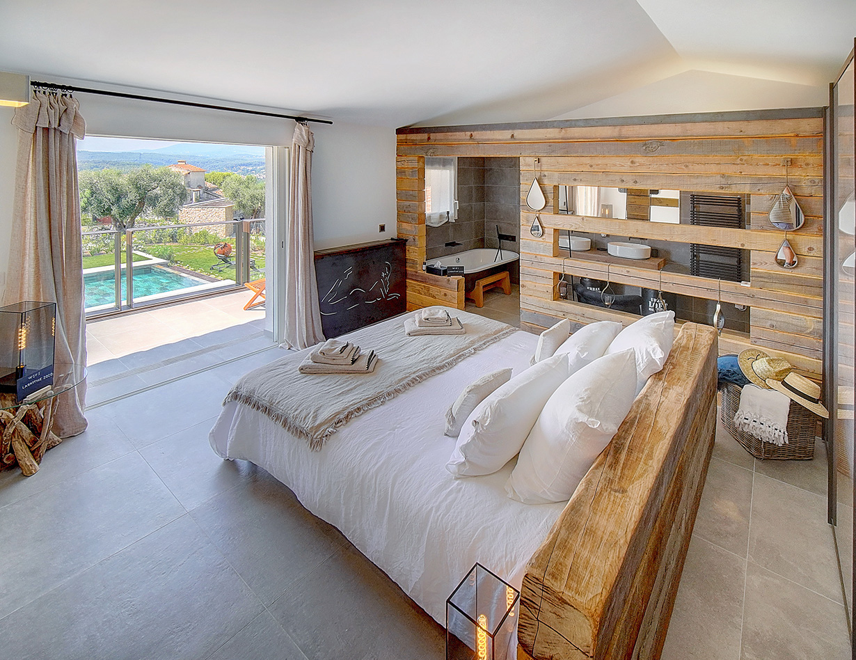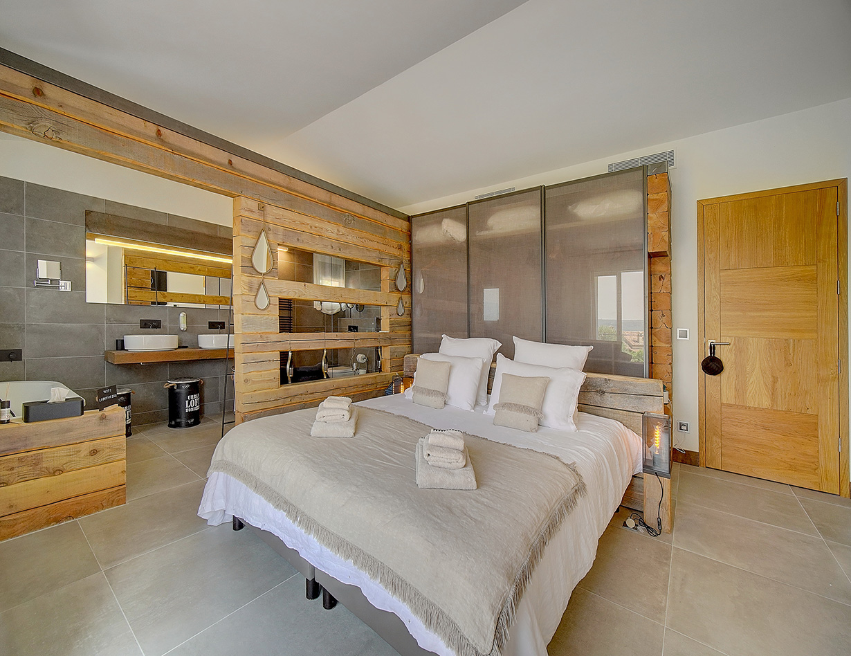 OG. Masterbedroom mit großem Doppelbett, ensuite Badezimmer auch mit Badewanne. Davor liegt eine sehr große Sonnenterrasse mit einem wunderbaren Weitblick auf das Meer und die Berge, sowie den Garten und Pool.