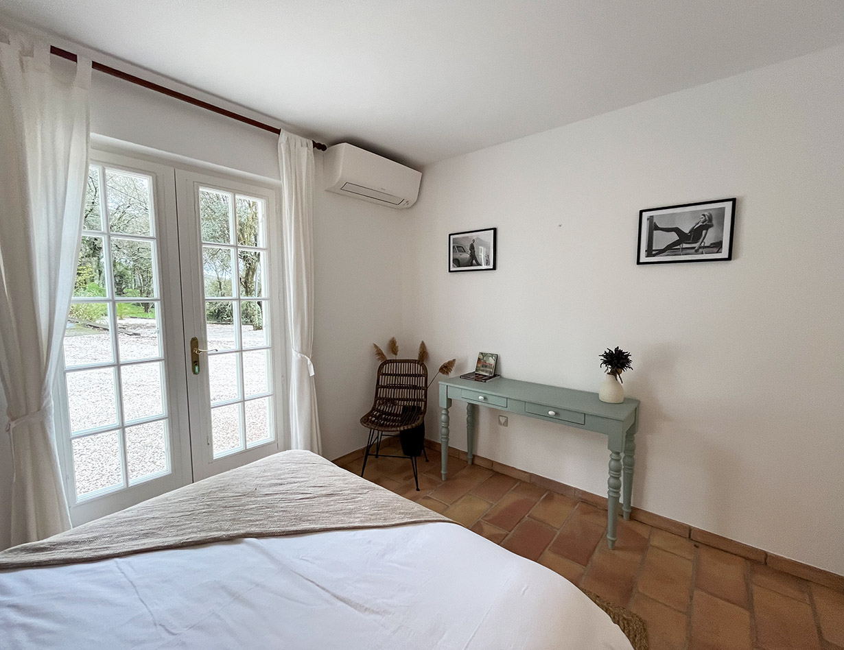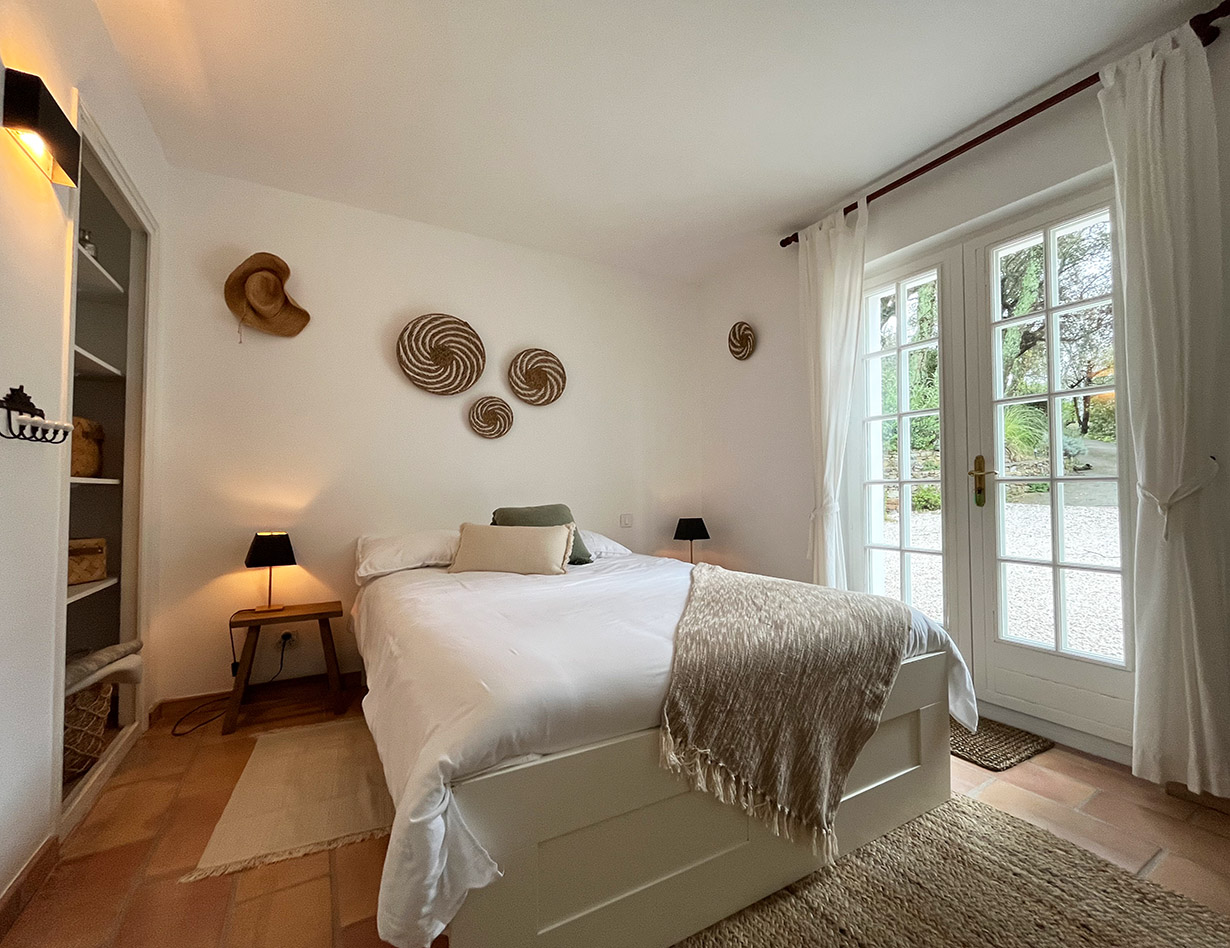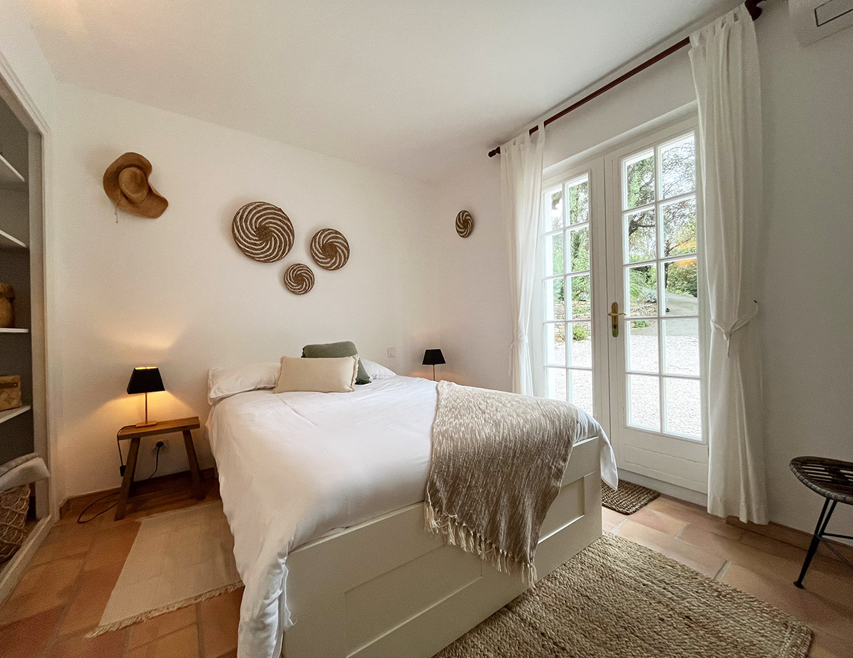 Ein Schlafzimmer (12 m²) verfügt über ein 140 x 200 cm großes Bett, Terrassentüren, mit Austritt zum Garten und Terrassen.