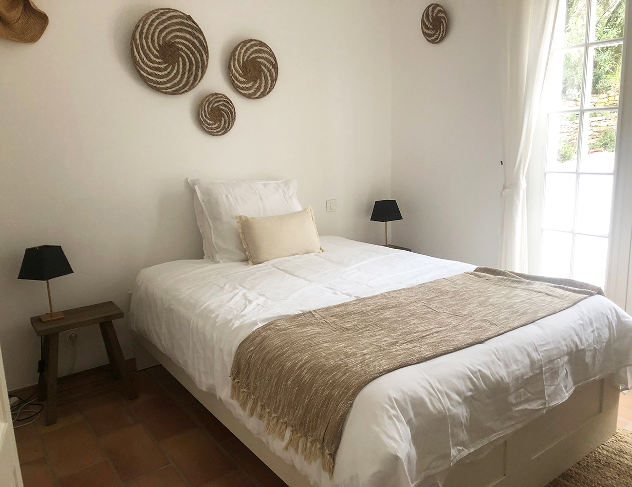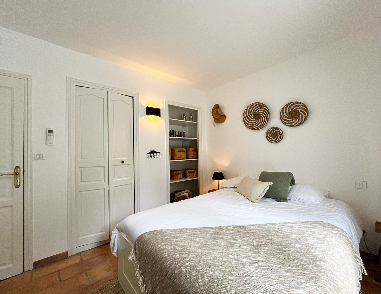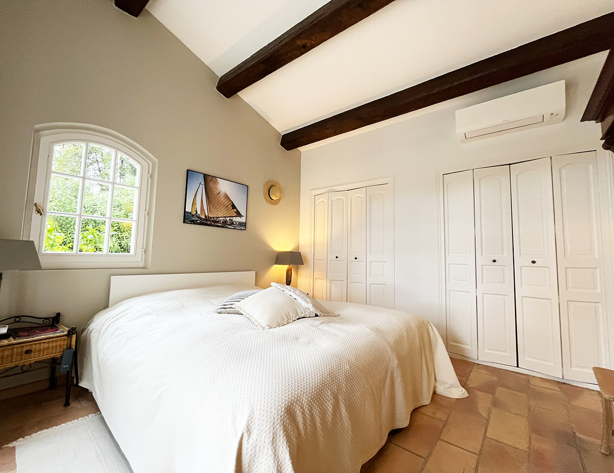 Ein Schlafzimmer (12 m²) verfügt über ein 140 x 200 cm großes Bett, Terrassentüren, mit Austritt zum Garten und Terrassen.
