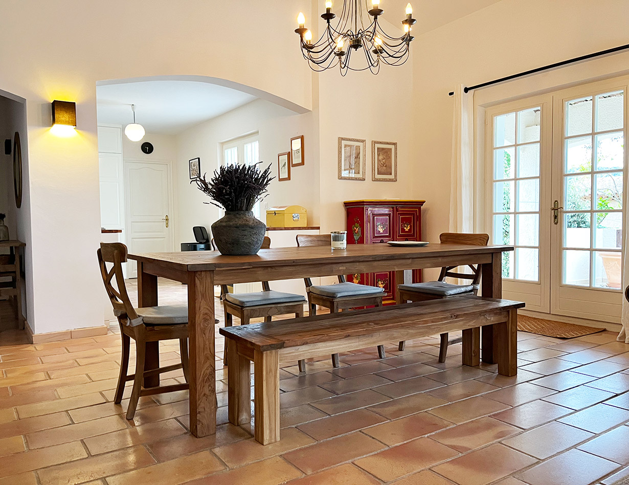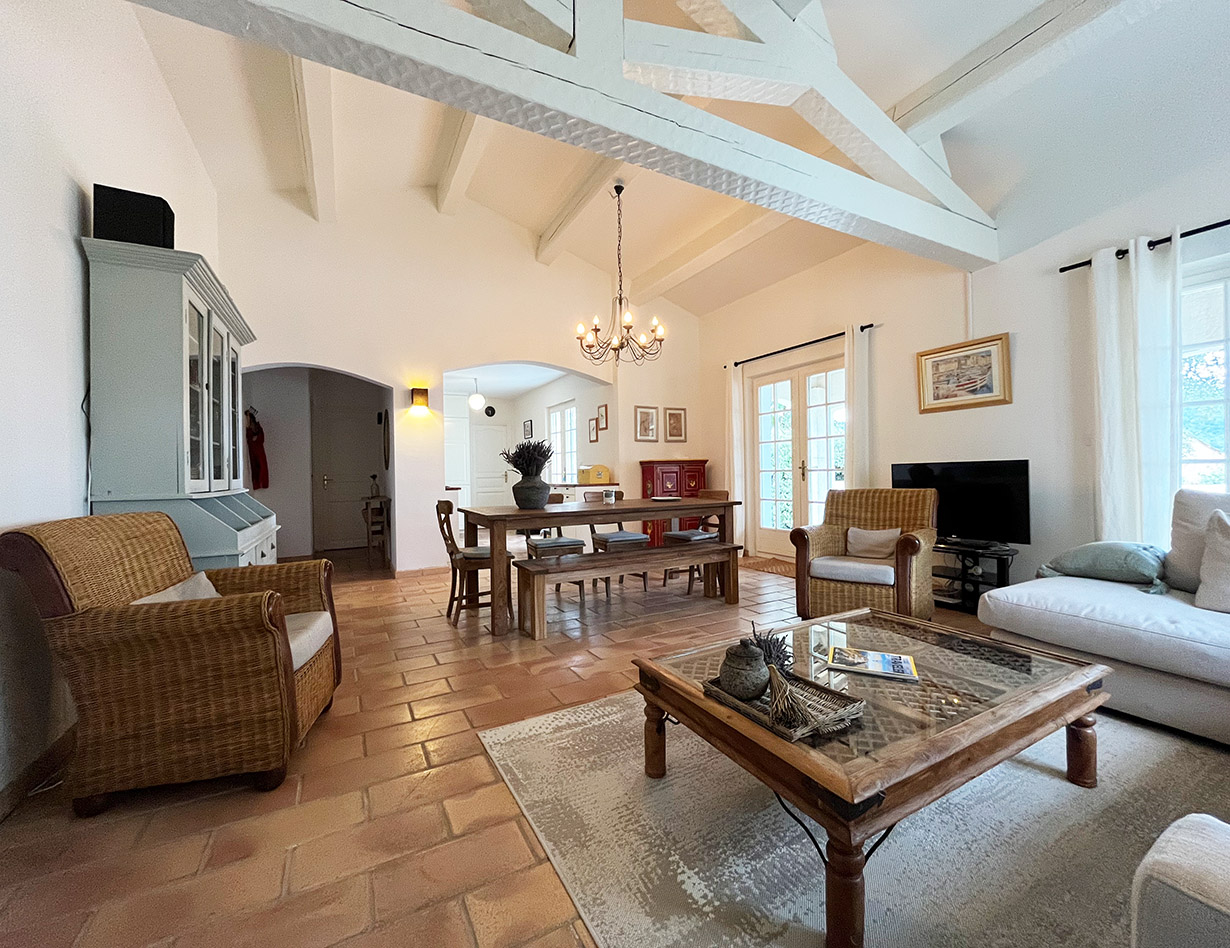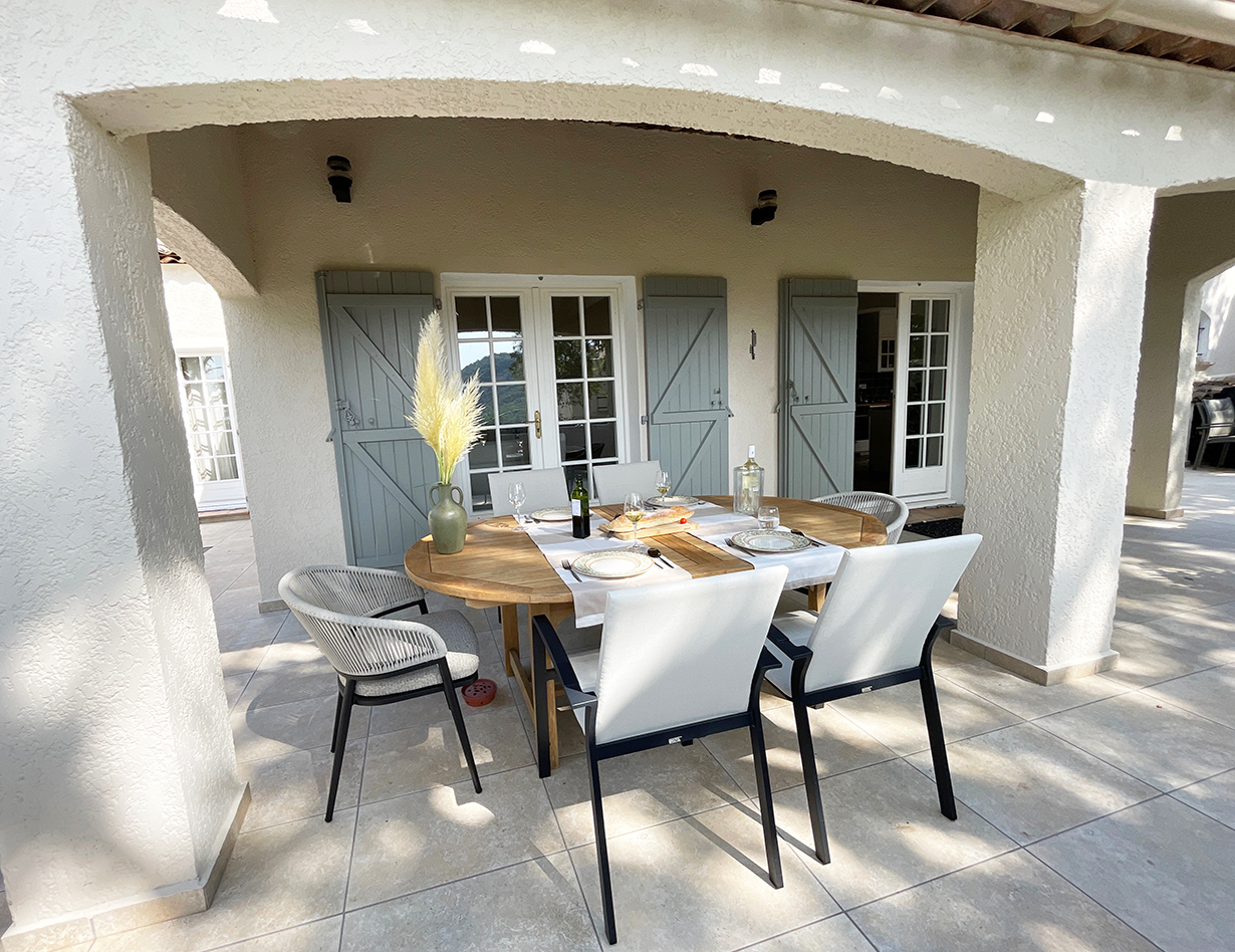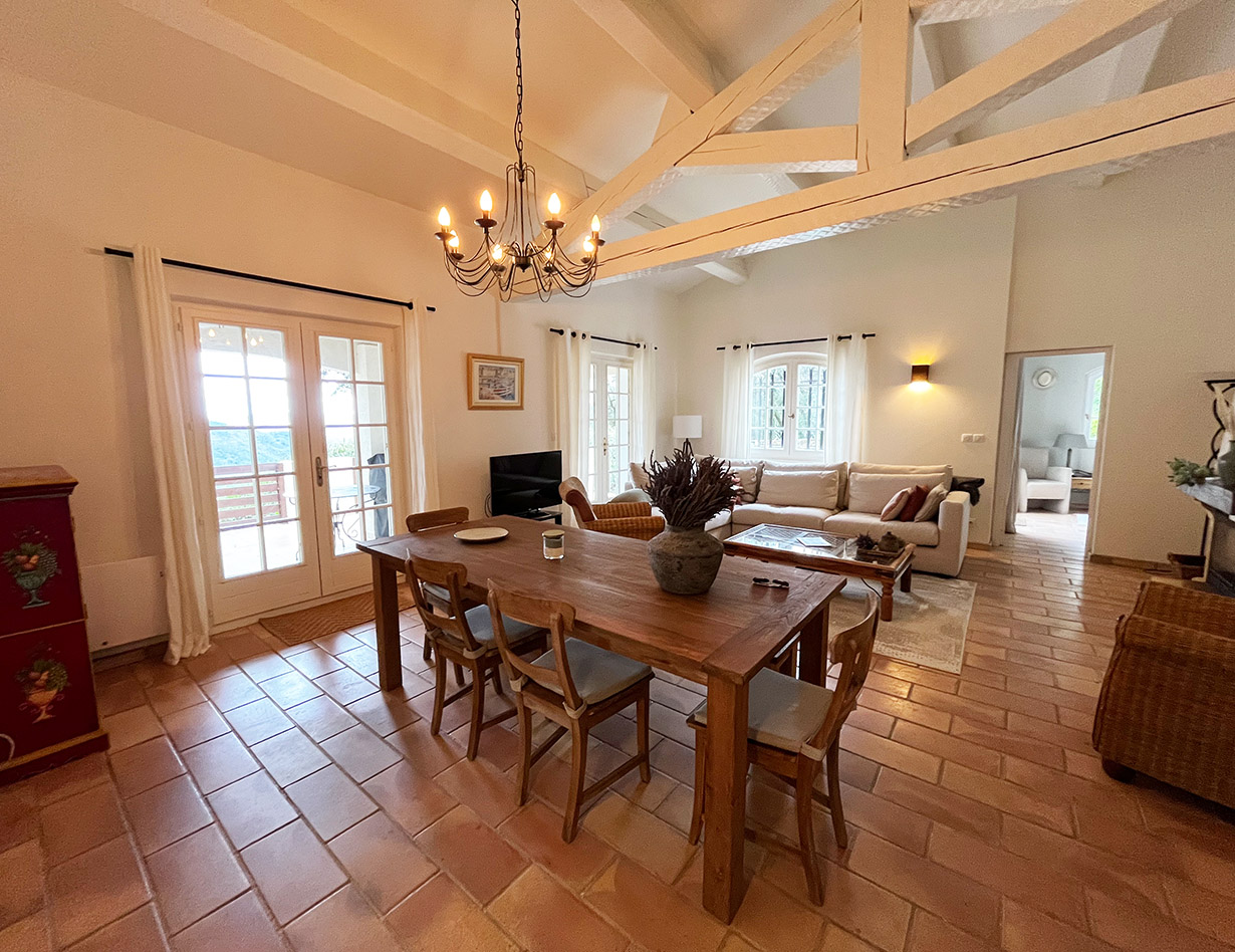 Das Innere der Villa ist im zeitgenössischen Design mit einigen „provenzalischen“ Akzenten, wie zum Beispiel tolle Balken, den Terrassentüren in allen Räumen und der überdachten Essterrasse mit großem Eßtisch – wunderbar im Sommer dort zu essen und den Blick zu genießen.